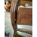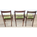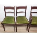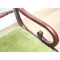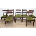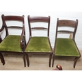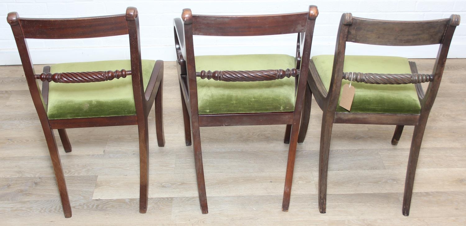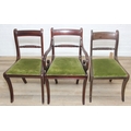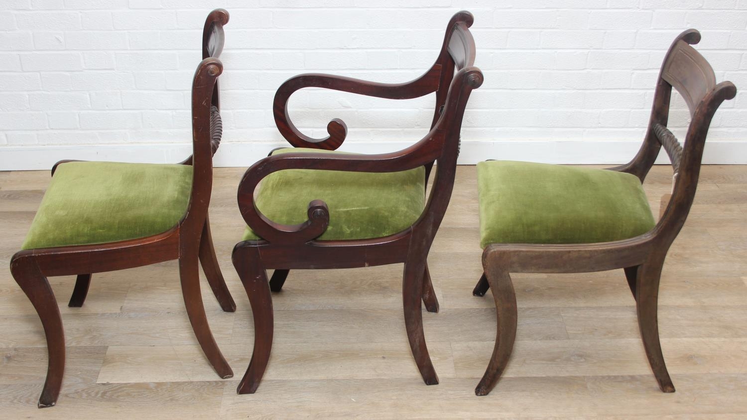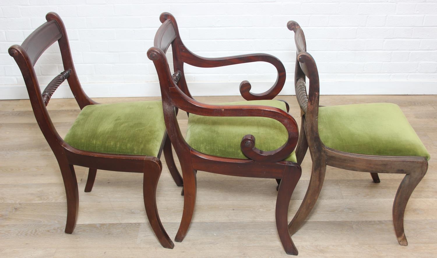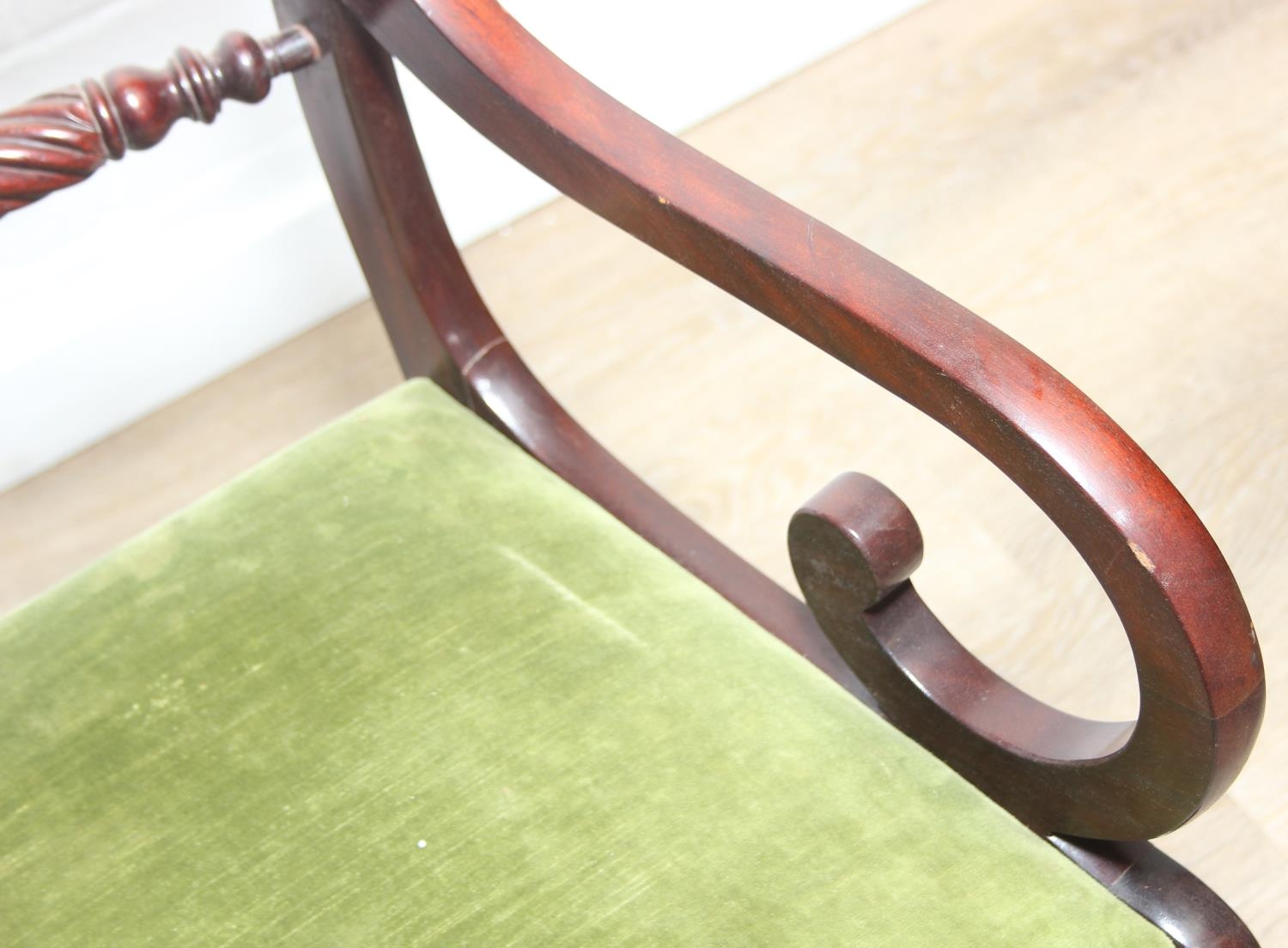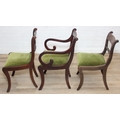 Set of Regency period mahogany dining chairs comprising a set of six plus matching carver, rope twist to centre rail, scroll ends to carver, moss green upholstery, the carver 53cm wide x 85cm tall [7]