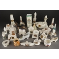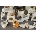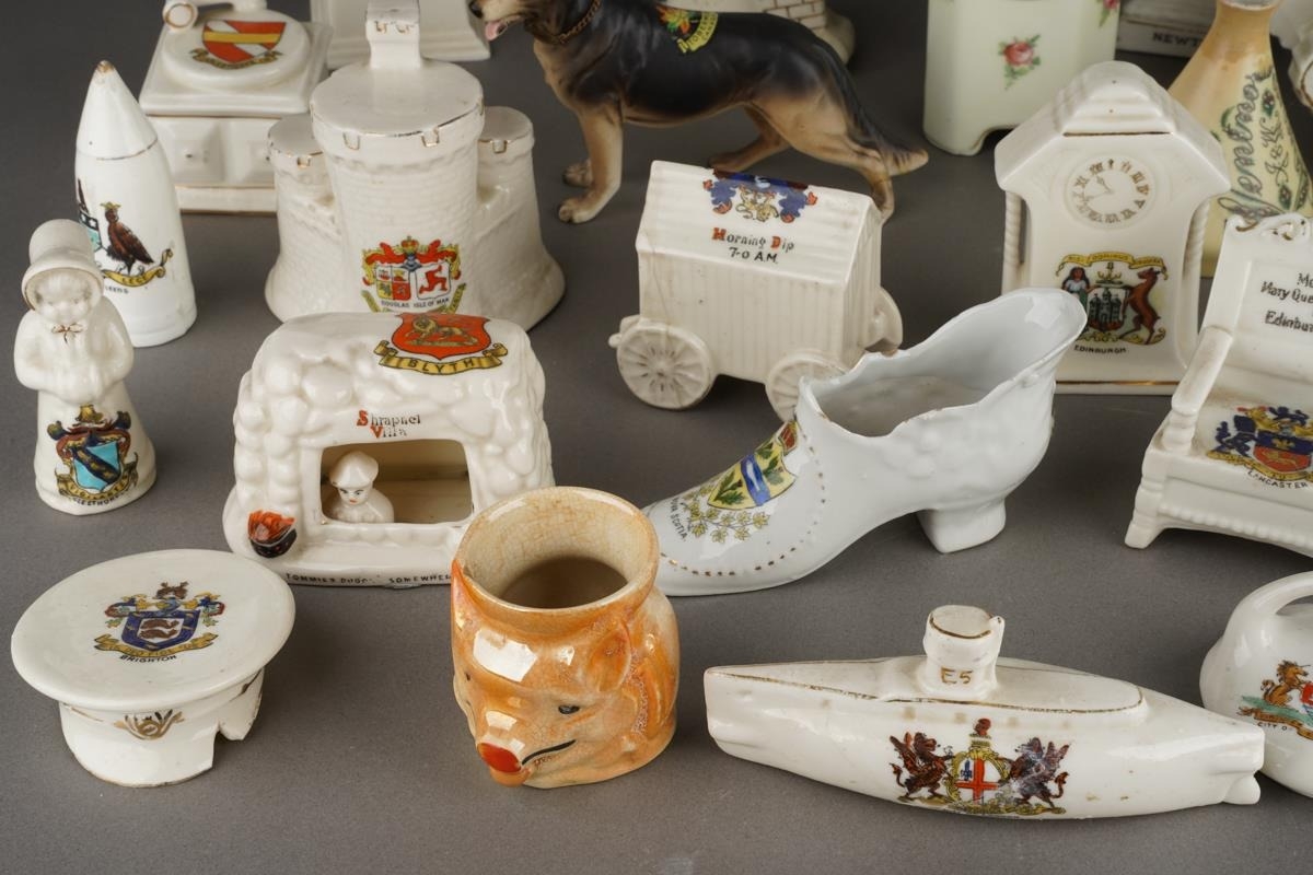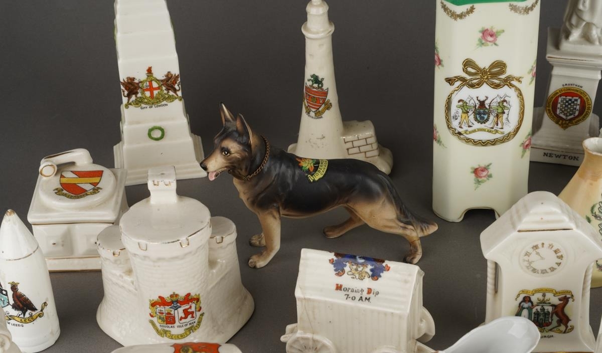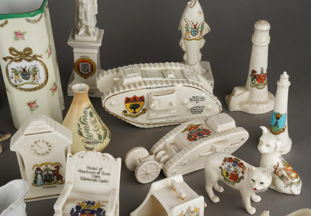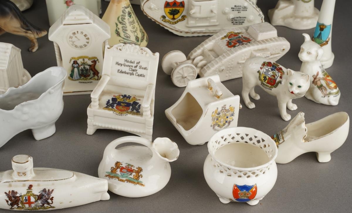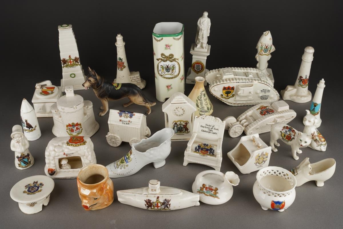 Assorted souvenir crested ware, factories including W A Smith, Swan, Carlton, Willow, Tuscan etc, models to include WWI Tanks, submarine, Shrapnel Villa, Cenotaph, various monuments, light house, Robin Hoods Bay [af]