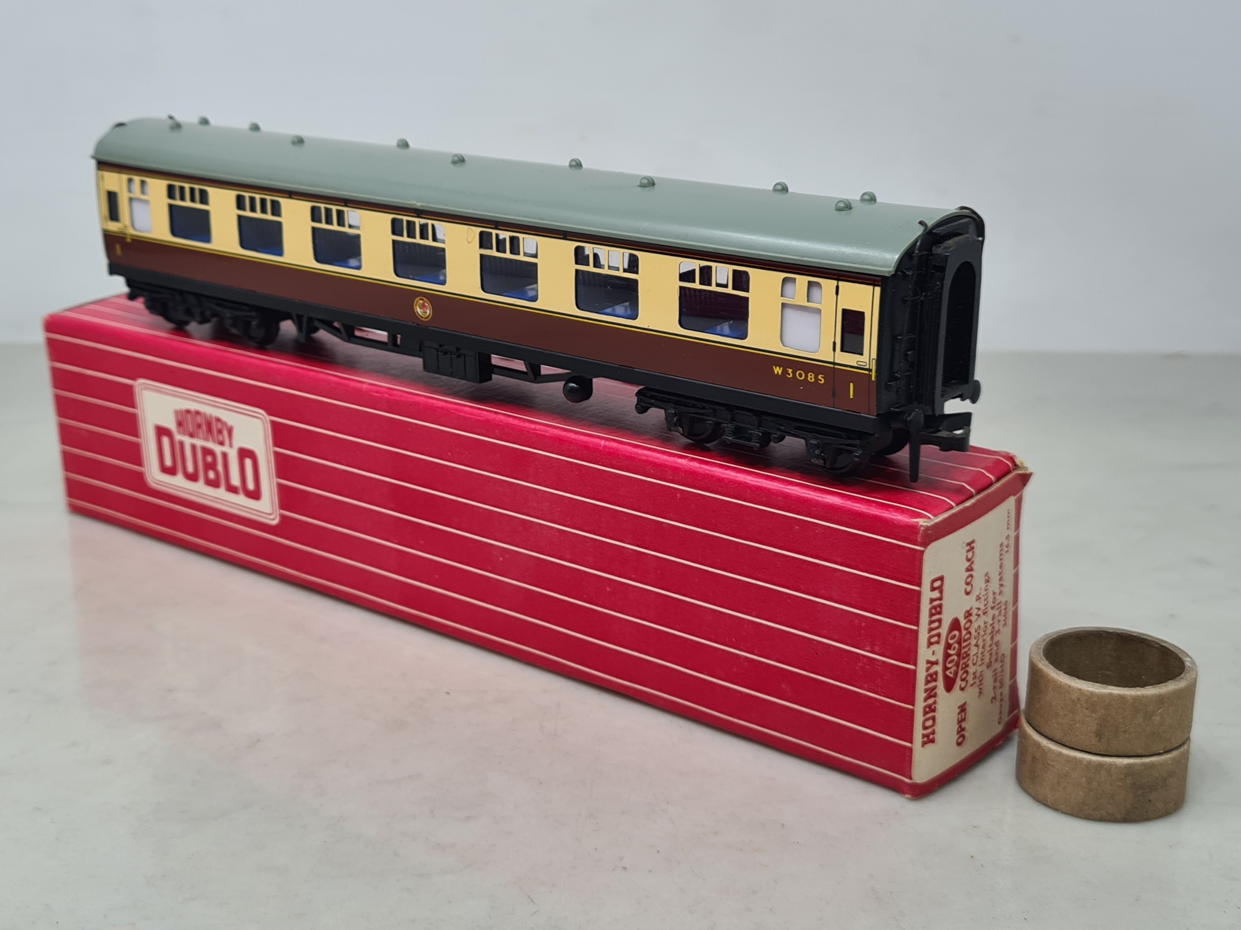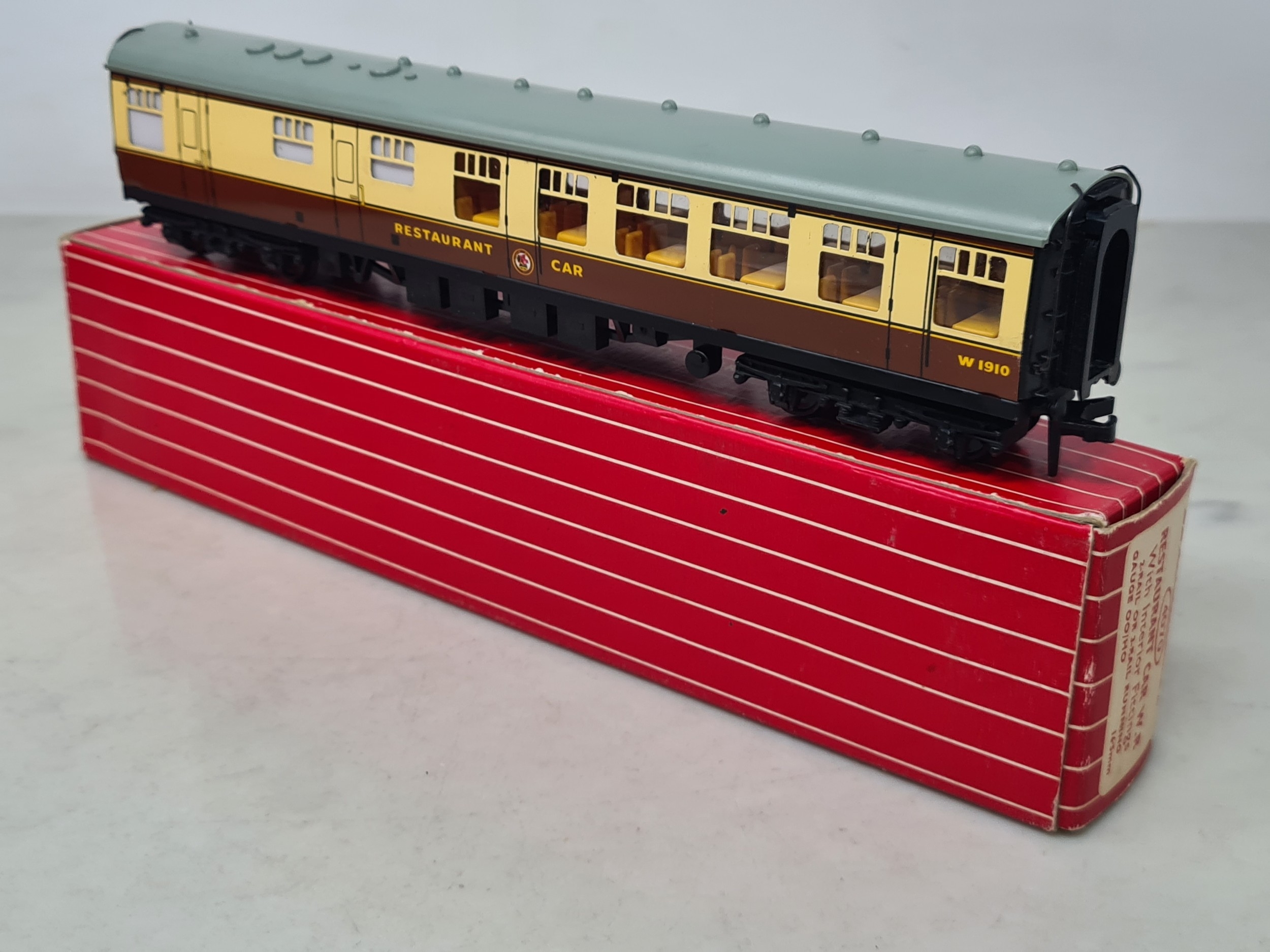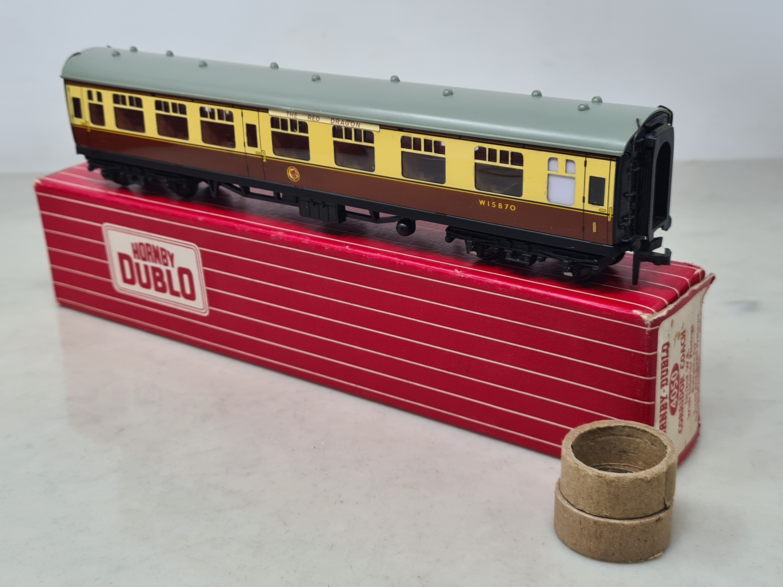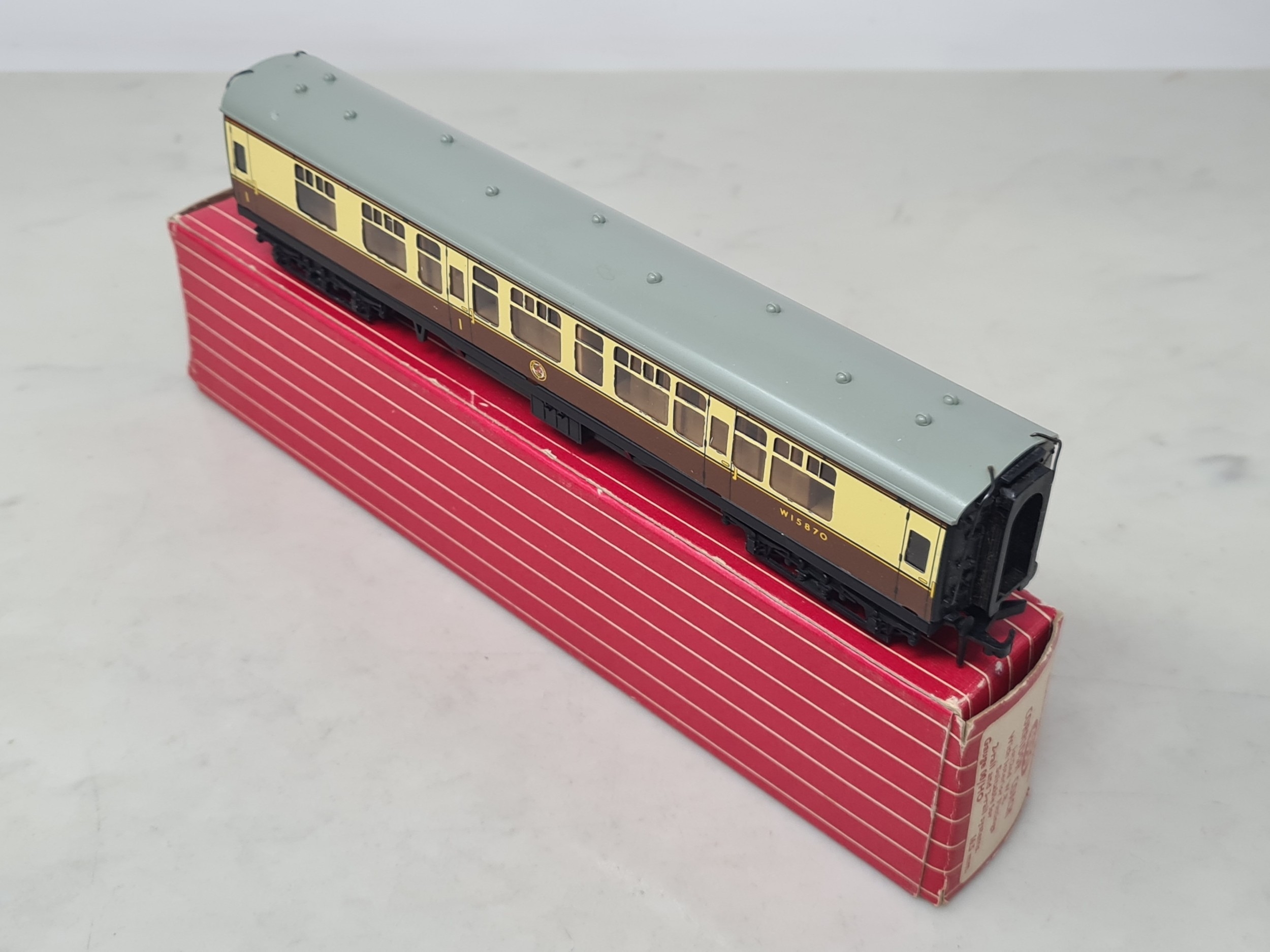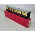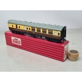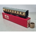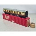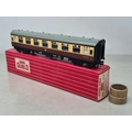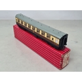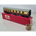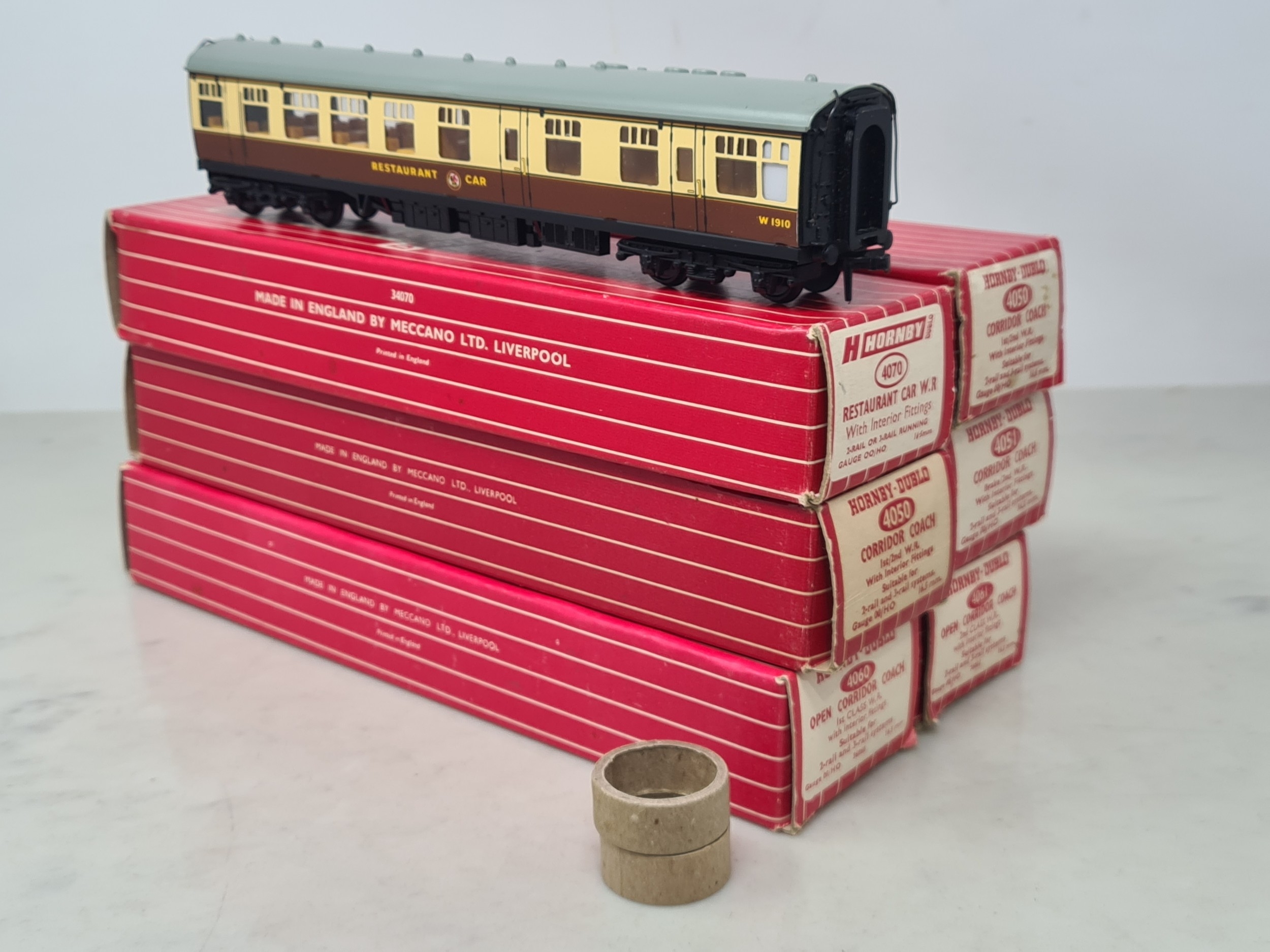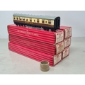Six boxed Hornby Dublo 2-rail WR Coaches comprising 2x 4050, 4051, 4060, 4061 and 4070 Restaurant Car, Nr M-M, boxes generally Nr perfect (except 4050 which has a paper tear over logo face), all complete with packing rings
