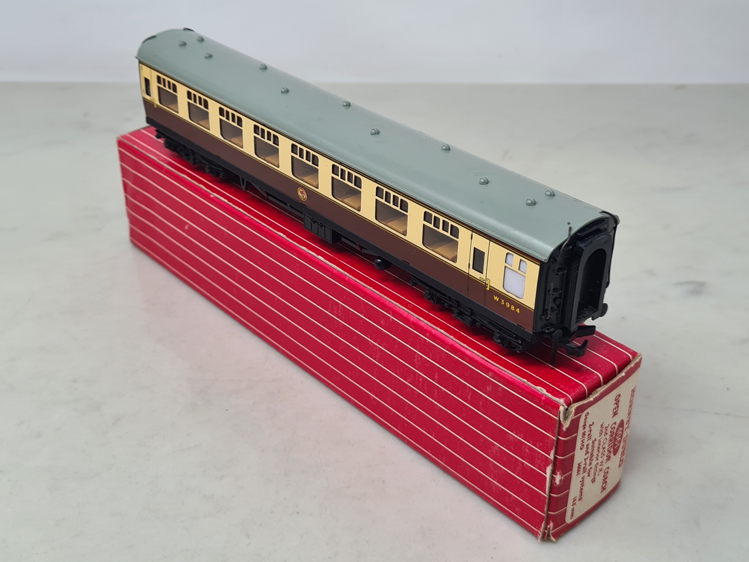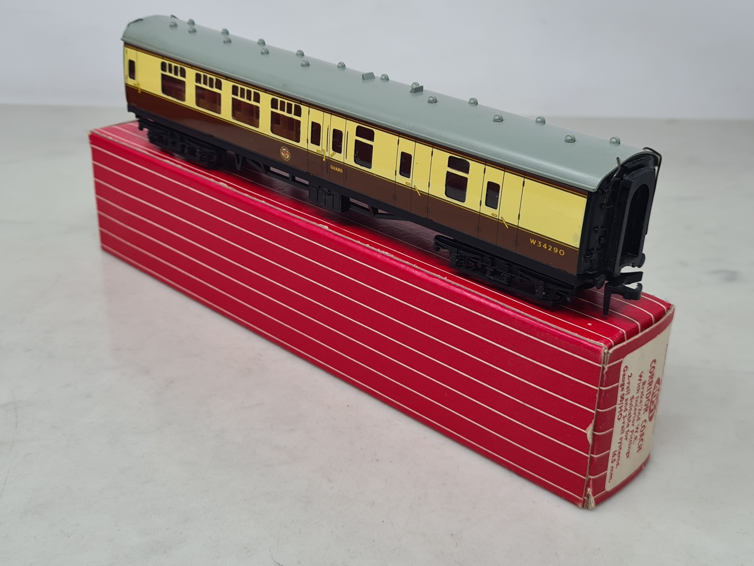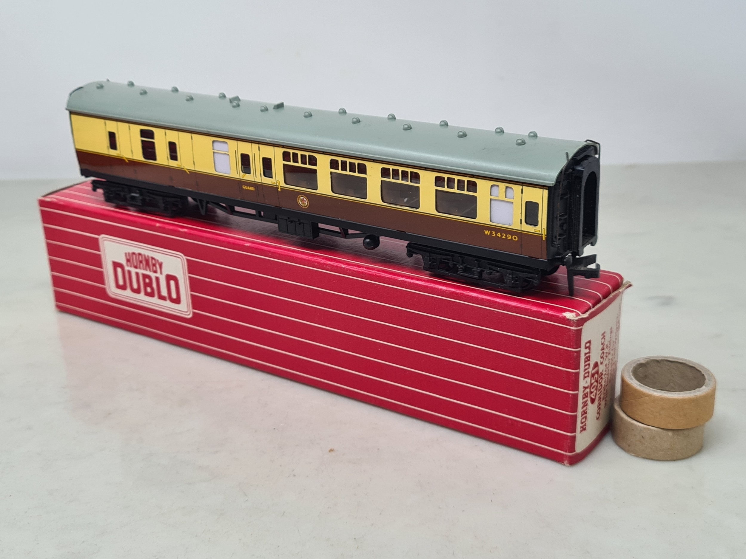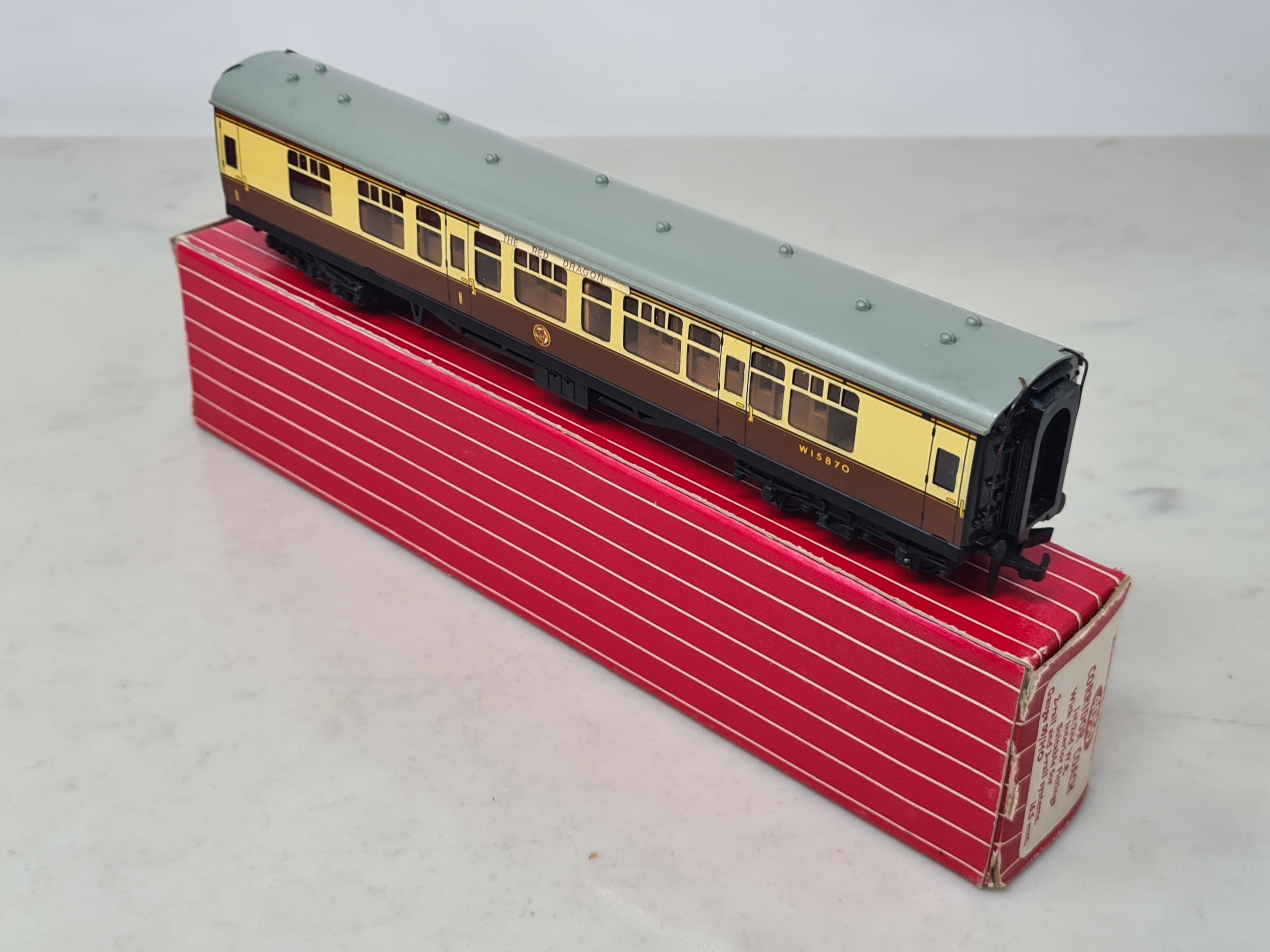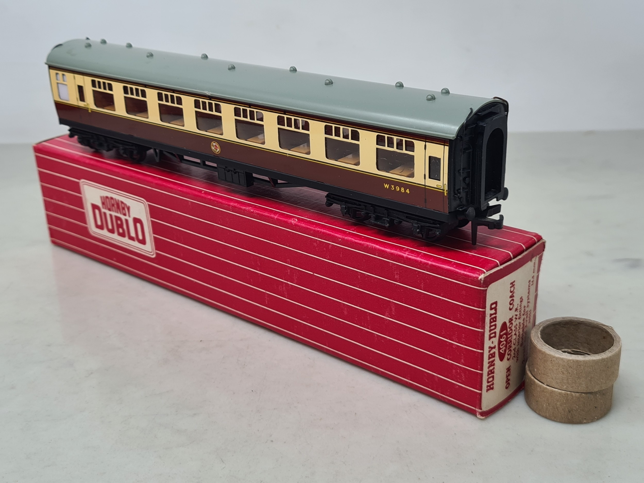 Six boxed Hornby Dublo 2-rail WR Coaches comprising 2x 4050, 4051, 4060, 4061 and 4070 Restaurant Car, Nr M-M, boxes generally Nr perfect (except 4050 which has a paper tear over logo face), all complete with packing rings