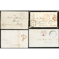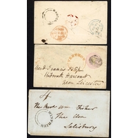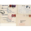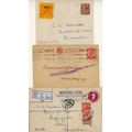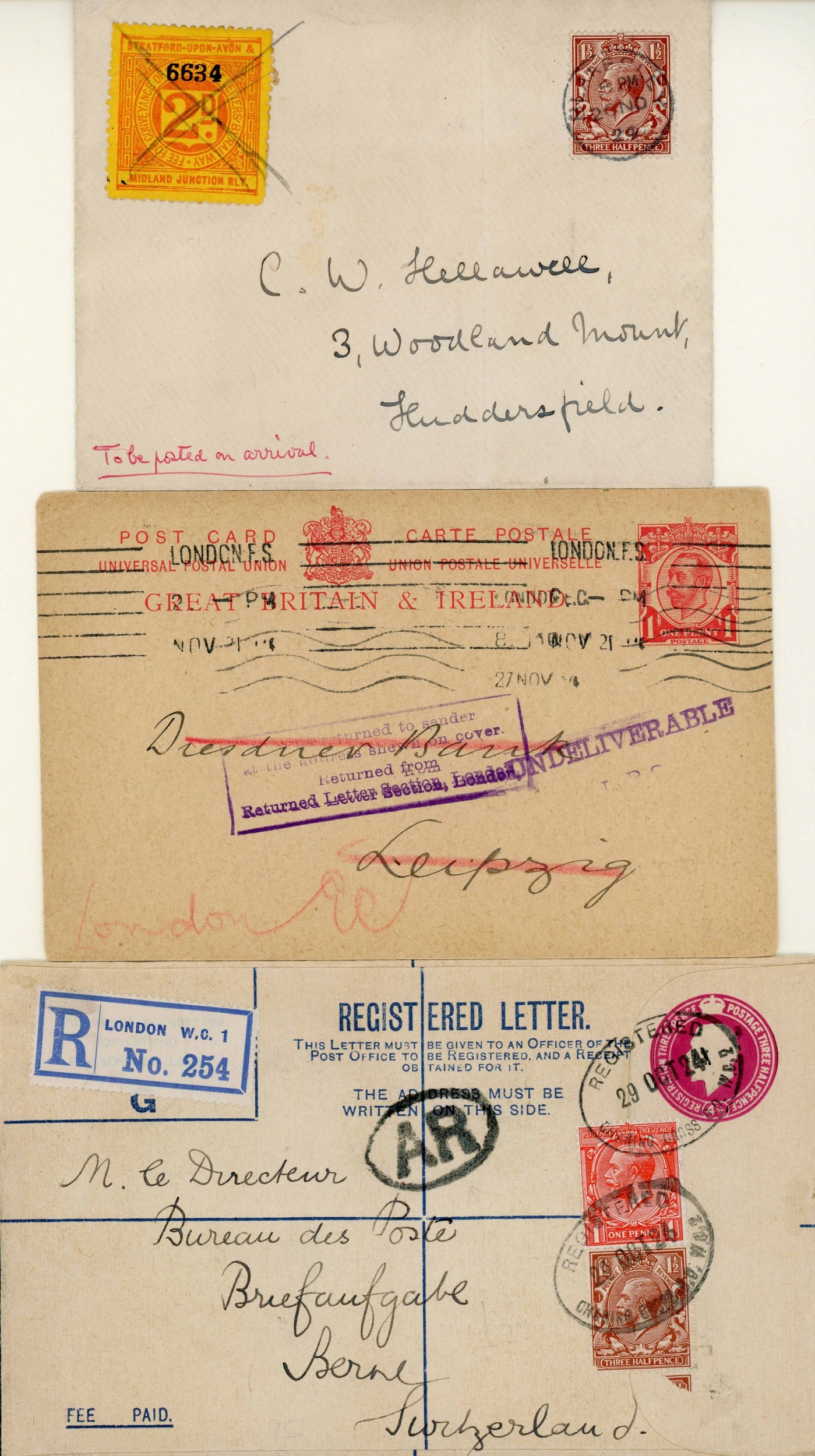 KGV - INSTRUCTIONAL MARKS, RARE "STRATFORD UPON AVON & MIDLAND JUNCTION RLY" STAMP COVER, ETC.; 1913-35 covers/cards inc. 20 Nov. 1924 env. to Huddersfield with KGV 1½d tied by "BLAKESLEY" (the Northants. village that had a SA&MR station from 1873 to 1962) thimble but also having a pencil-tied rare 1910 "STRATFORD...& MIDLAND... RLY" 2d Red on Yellow stamp (small control "6634" - only 480 issued; not recorded used!), Nov. 1914 1d Red PC to Germany with purple "UNDELIVERABLE", P. Dues, triangles, 1924 regd. env. to Bern with v. fine oval "AR", 1927 PC ex Yugoslavia with fine Southampton transit "723" Numeral cancelling charge, 1928 fine red "DELAYED...LETTER BOX FOR LONDON...", 1935 to US with "REBUTS", 1935 pair ex York/Dundee to same address with black or red (closed tear) oval "EXPRESS" marks, etc. Good variety. (14 covers/cards) Cross Reference: RAILWAY LETTER STAMPS & COVERS, NORTHAMPTONSHIRE, WARWICKSHIRE, EXPRESS MAIL