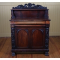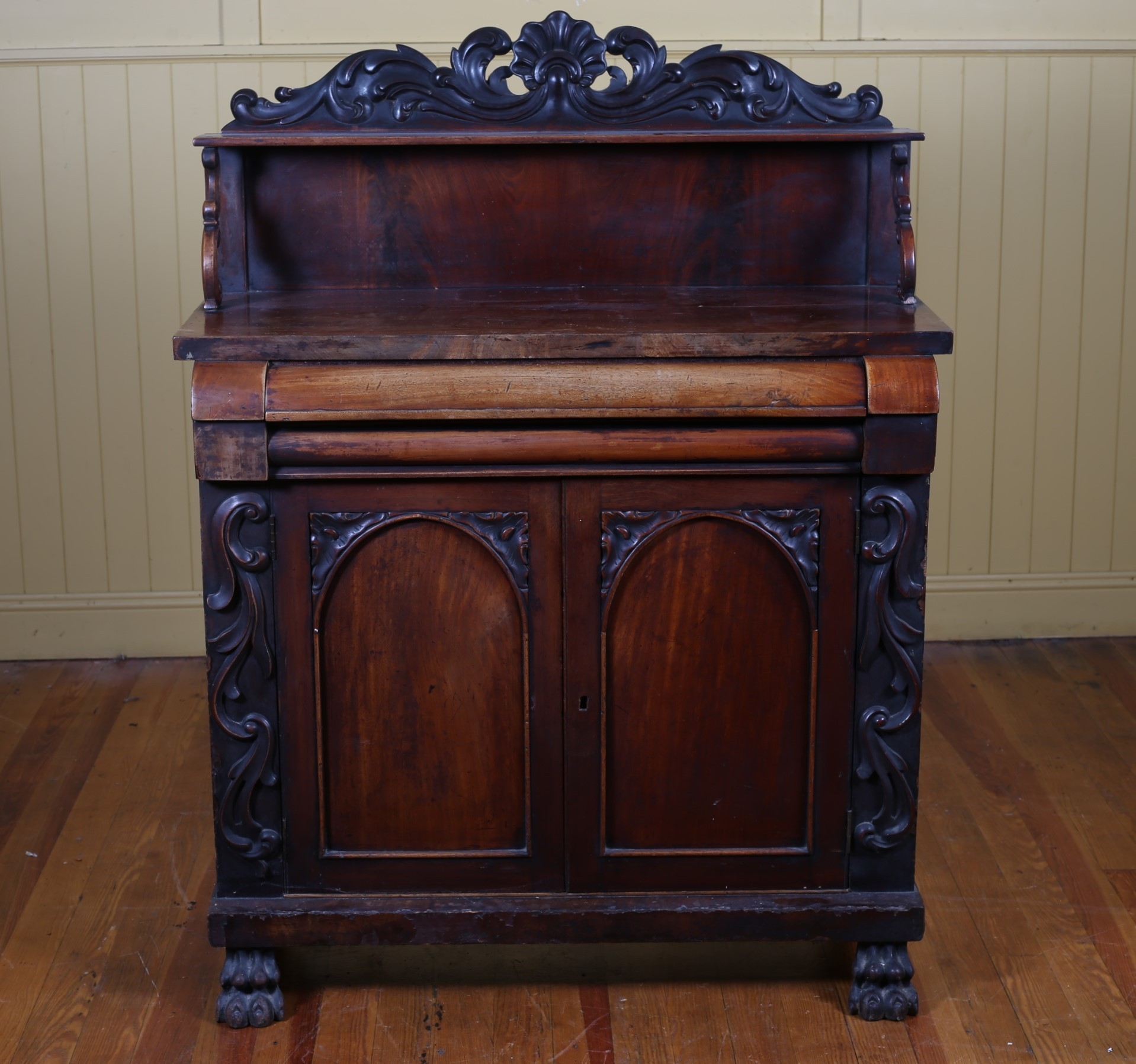 A VICTORIAN CARVED MAHOGANY SIDE CABINET the superstructure with open shelf and foliate carved back above a frieze drawer and cupboards on platform support with claw feet 140cm (h) x 107cm (w) x 149cm (d)