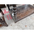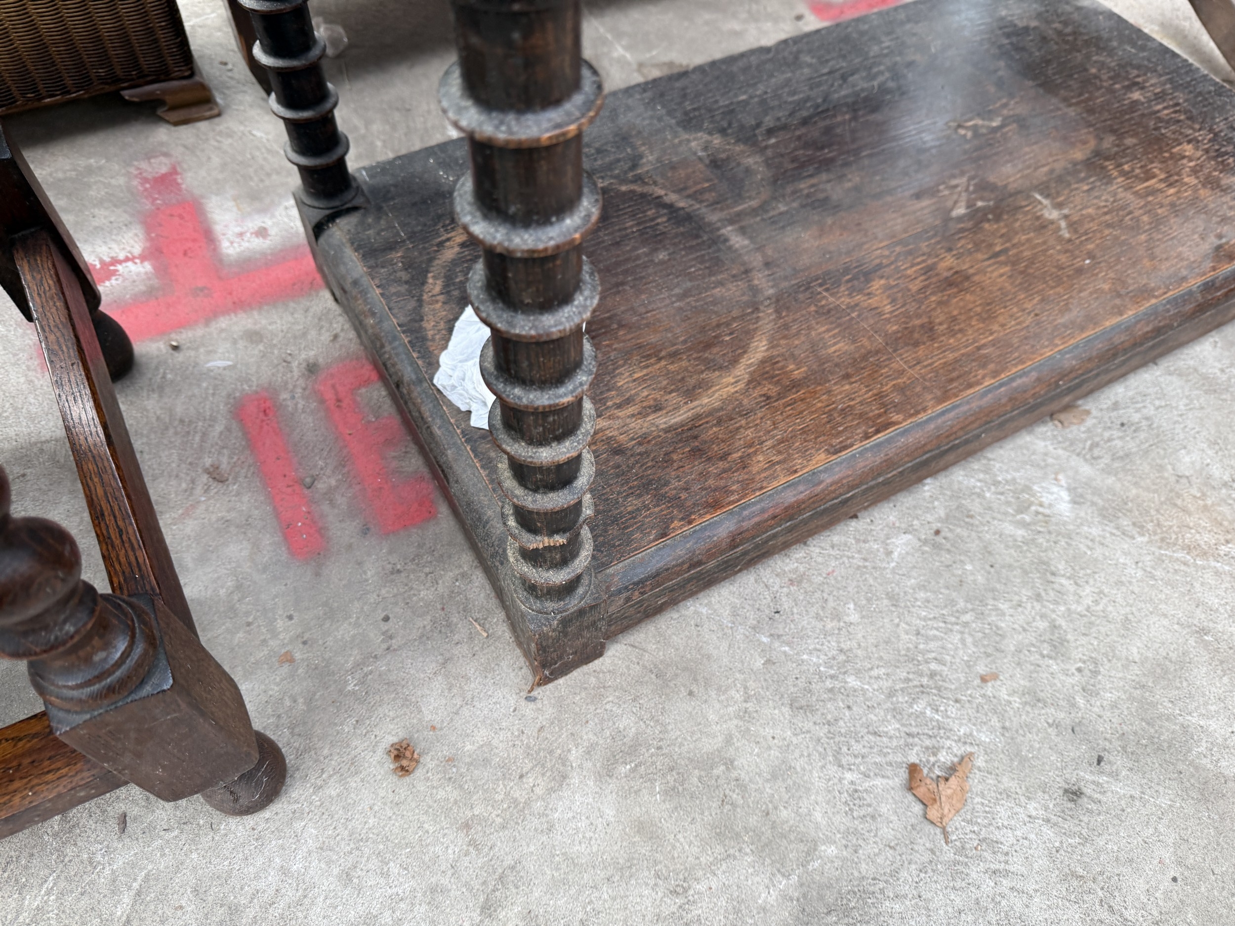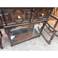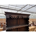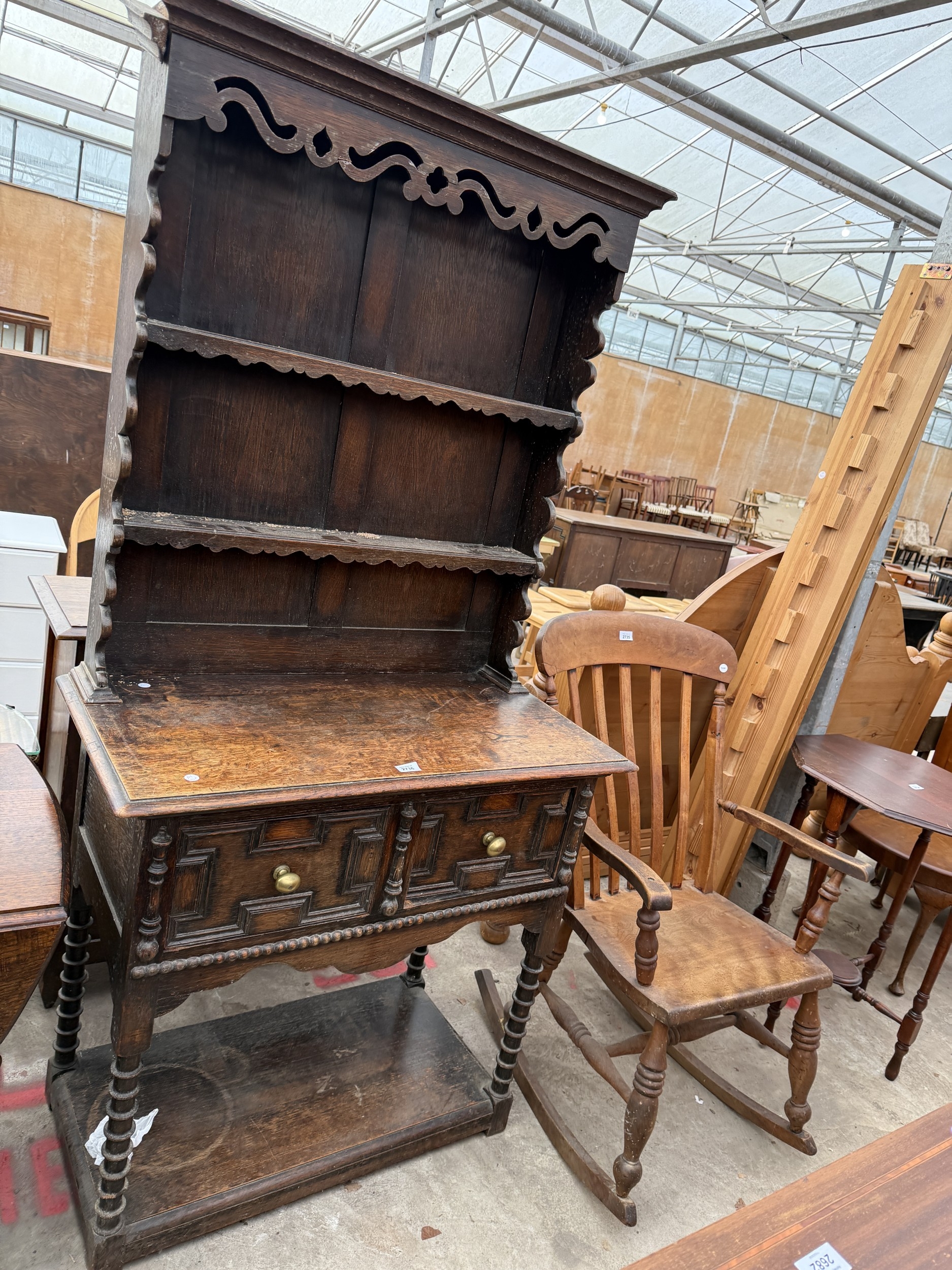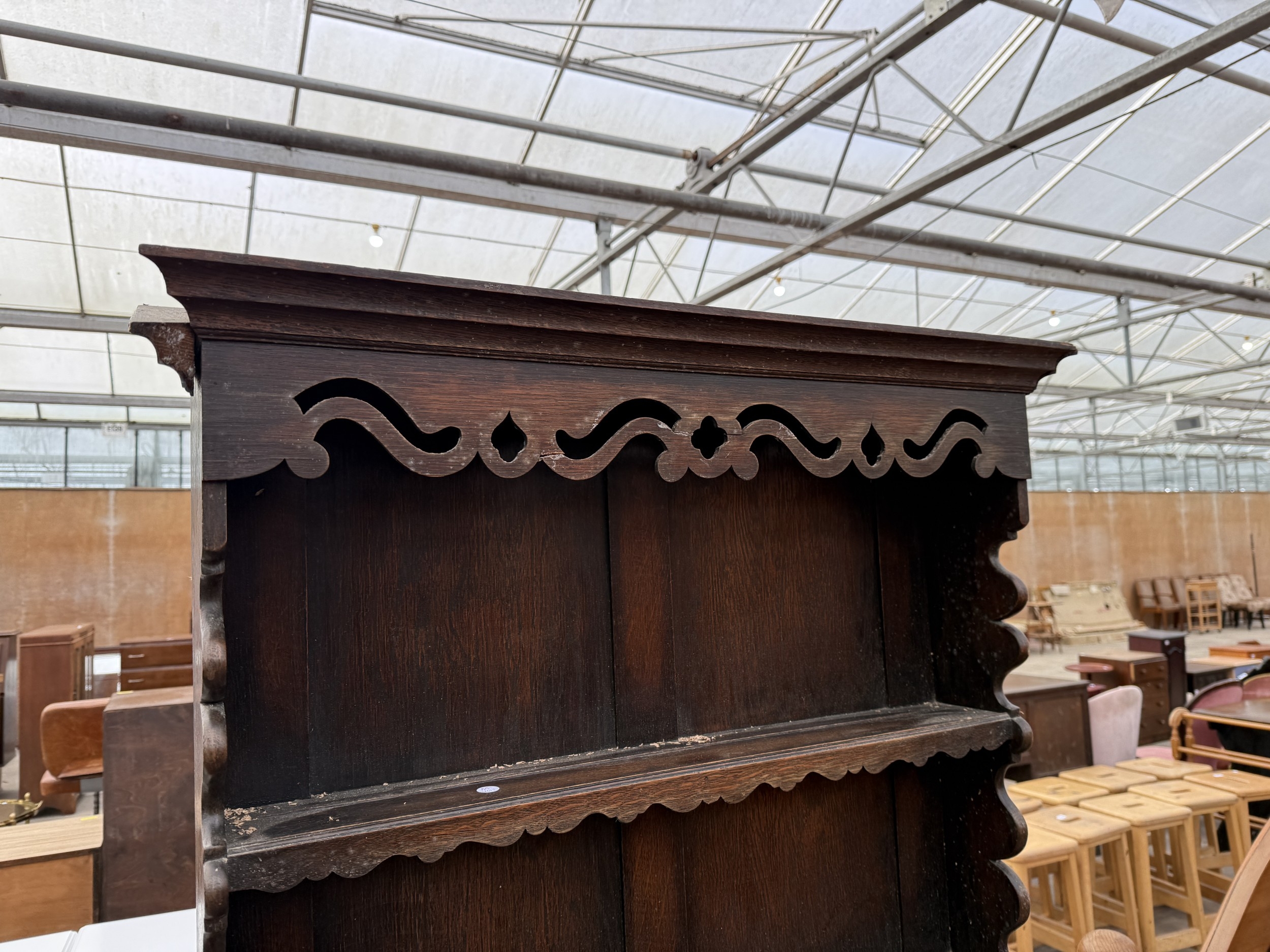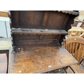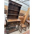 AN EARLY 20TH CENTURY OAK JACOBEAN STYLE DRESSER WITH PLATE RACK AND POT BOARD, 36" WIDE