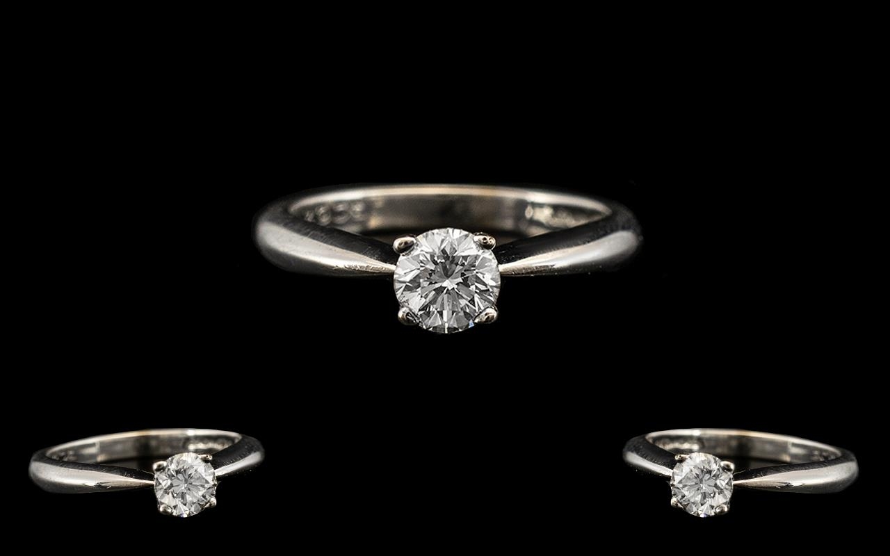 Contemporary 18ct White Gold High Quality Single Stone Diamond Set Dress Ring, marked 750 to interior of shank, the single modern round brilliant cut diamond of top colour and clarity, Est Diamond size 0.50 pts; ring size J/K; all aspects of condition as new, including shank and setting