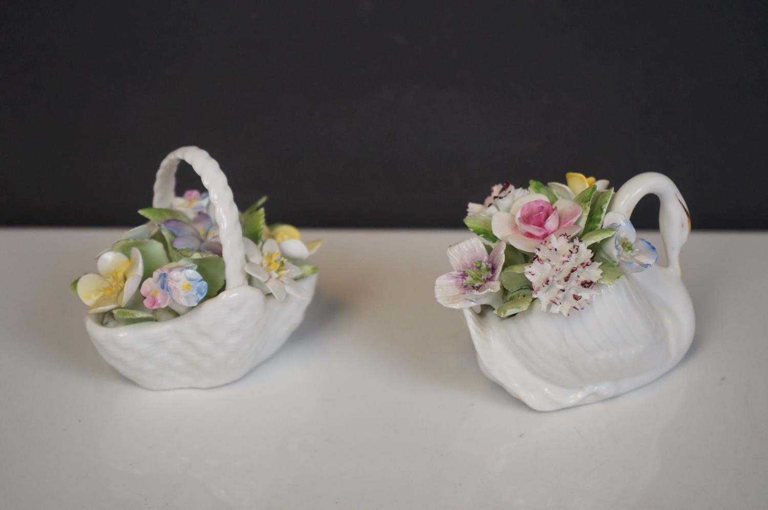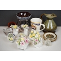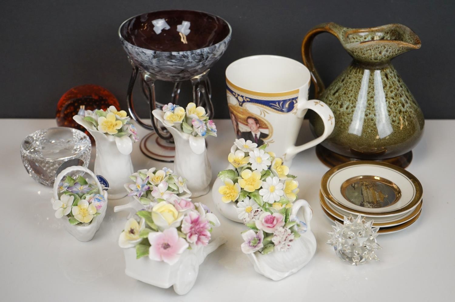 A collection of mixed ceramics and glass ware to include Royal Doulton flower baskets and glass paperweights.