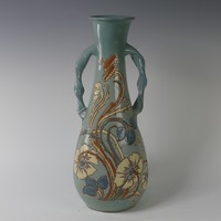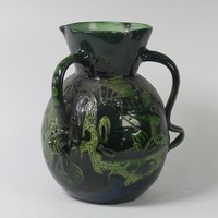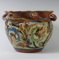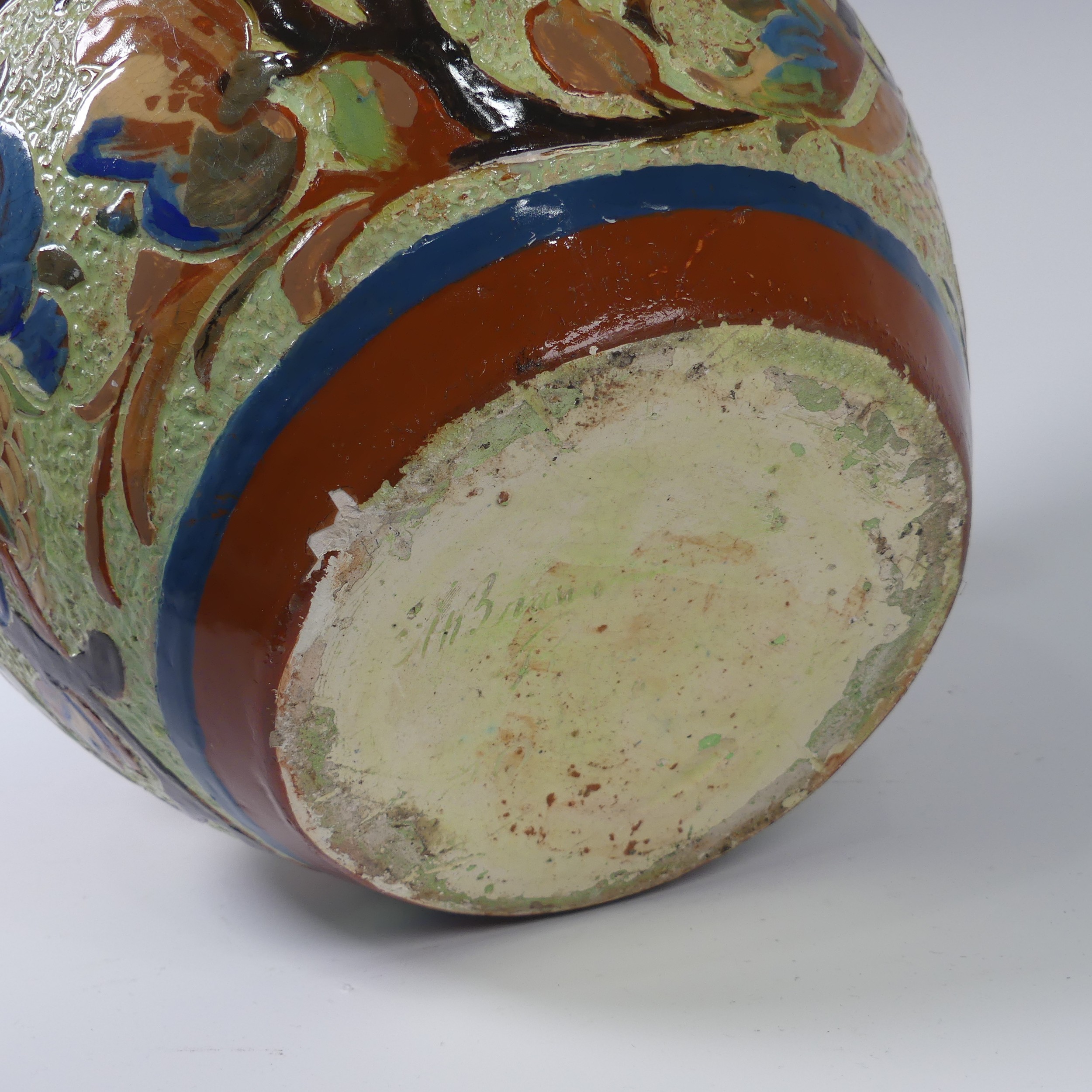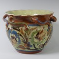 A C. H. Brannam Barum pottery Jardinière dated 1900, with twisted handles, decorated by James S. Dewdney, painted in coloured enamels, incised 'C. H. Brannam, Barum' and initialled 'JD', decorators mark on base, small chipping and losses to the base of the Jardinière, 26cm high x 31.5cm diameter.