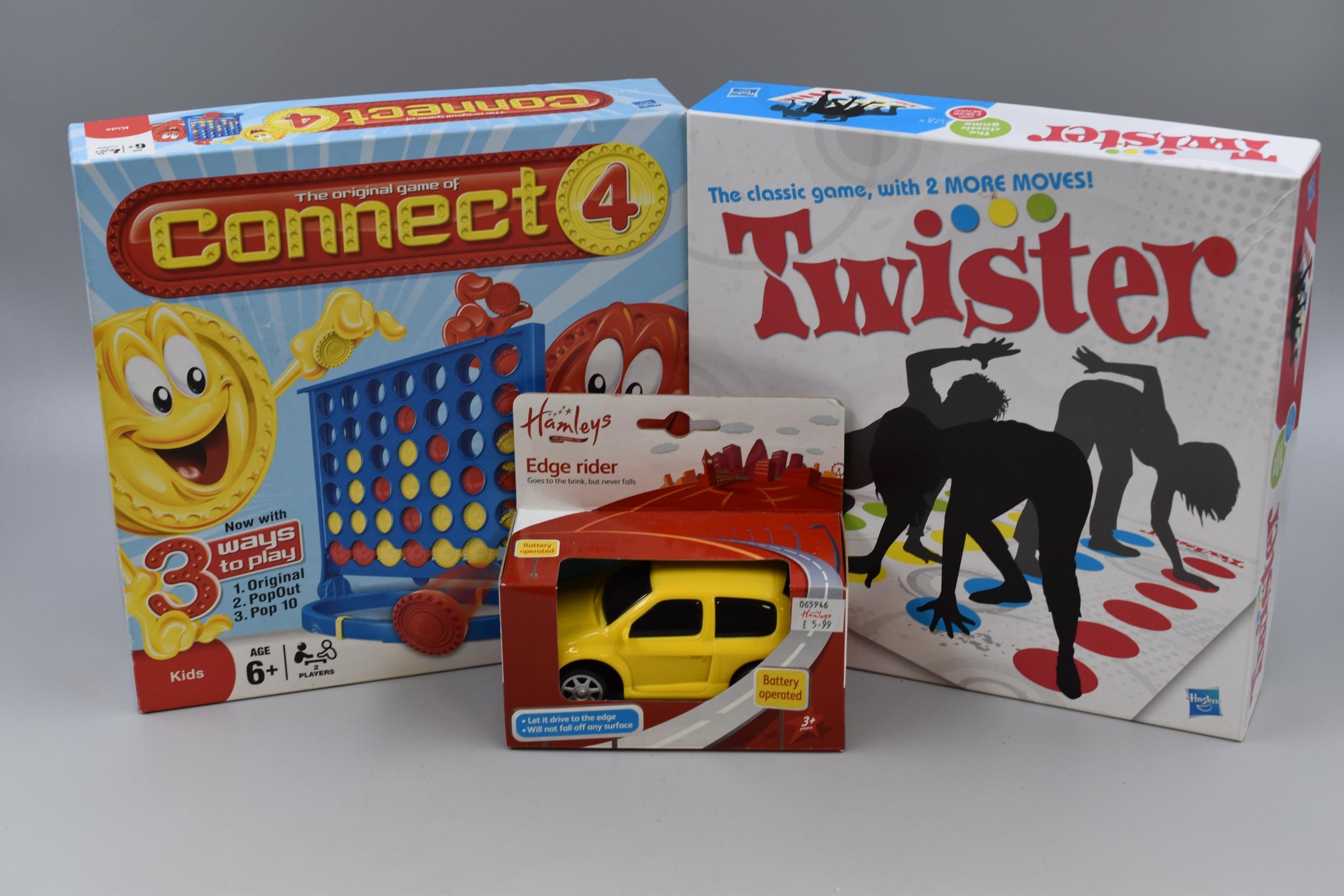 Two board games, Twister & Connect 4 (seem to be complete) & a Hamleys Edge rider car (boxed)