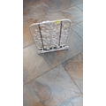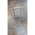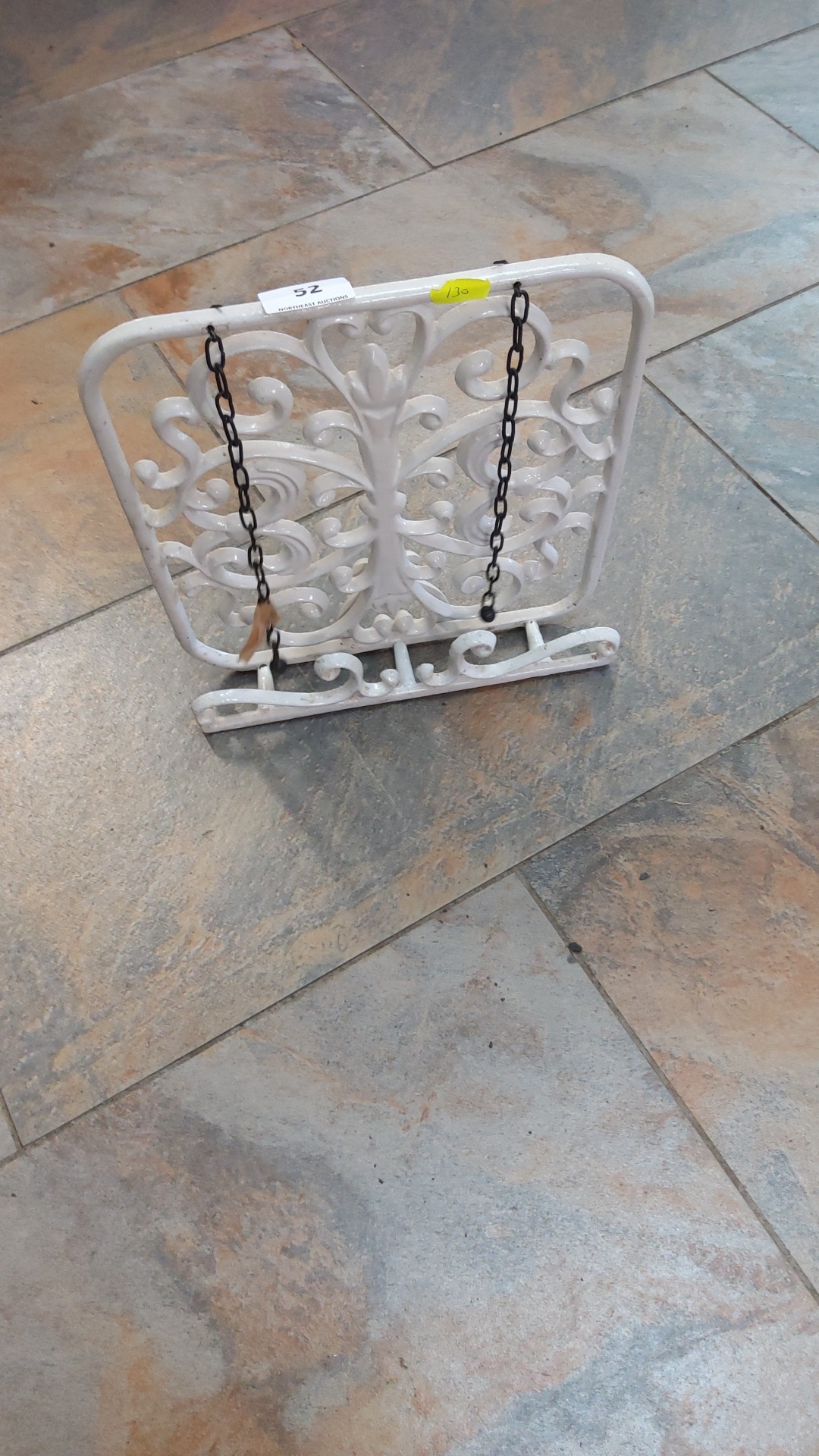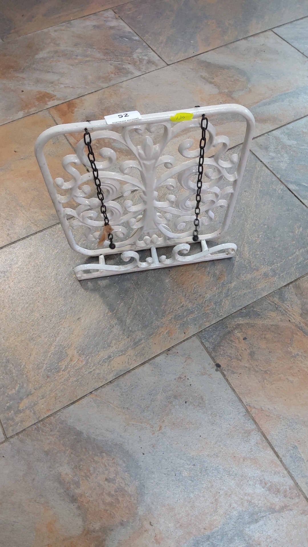 White painted cast-iron cookbook or tablet stand, rectangular scrollwork panel with adjustable page-holding chains, late 20th century.