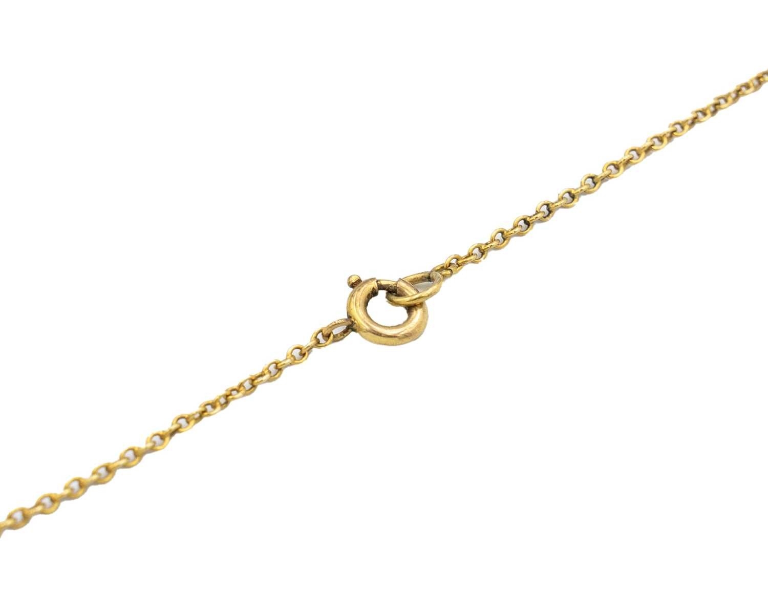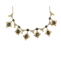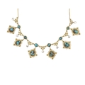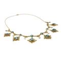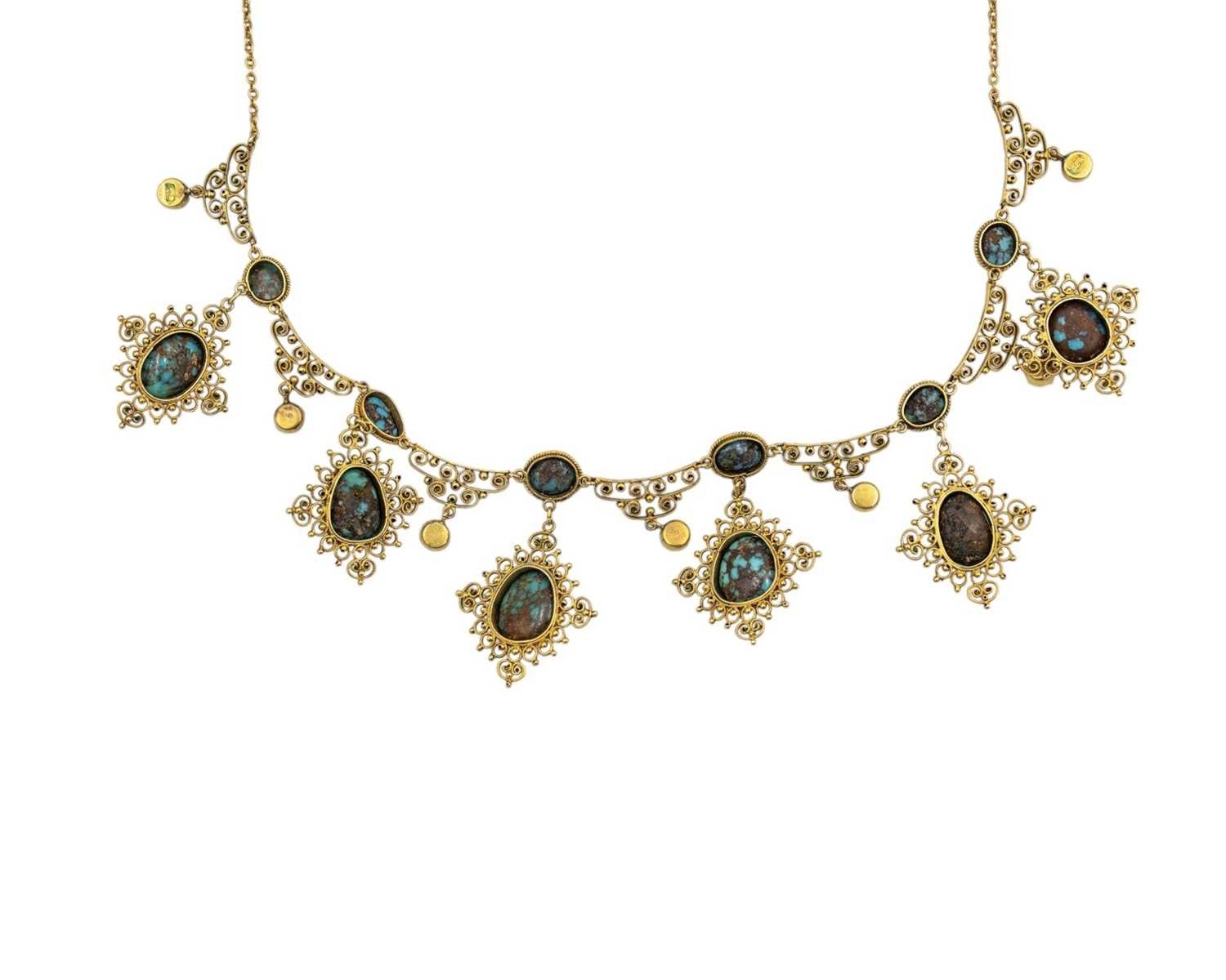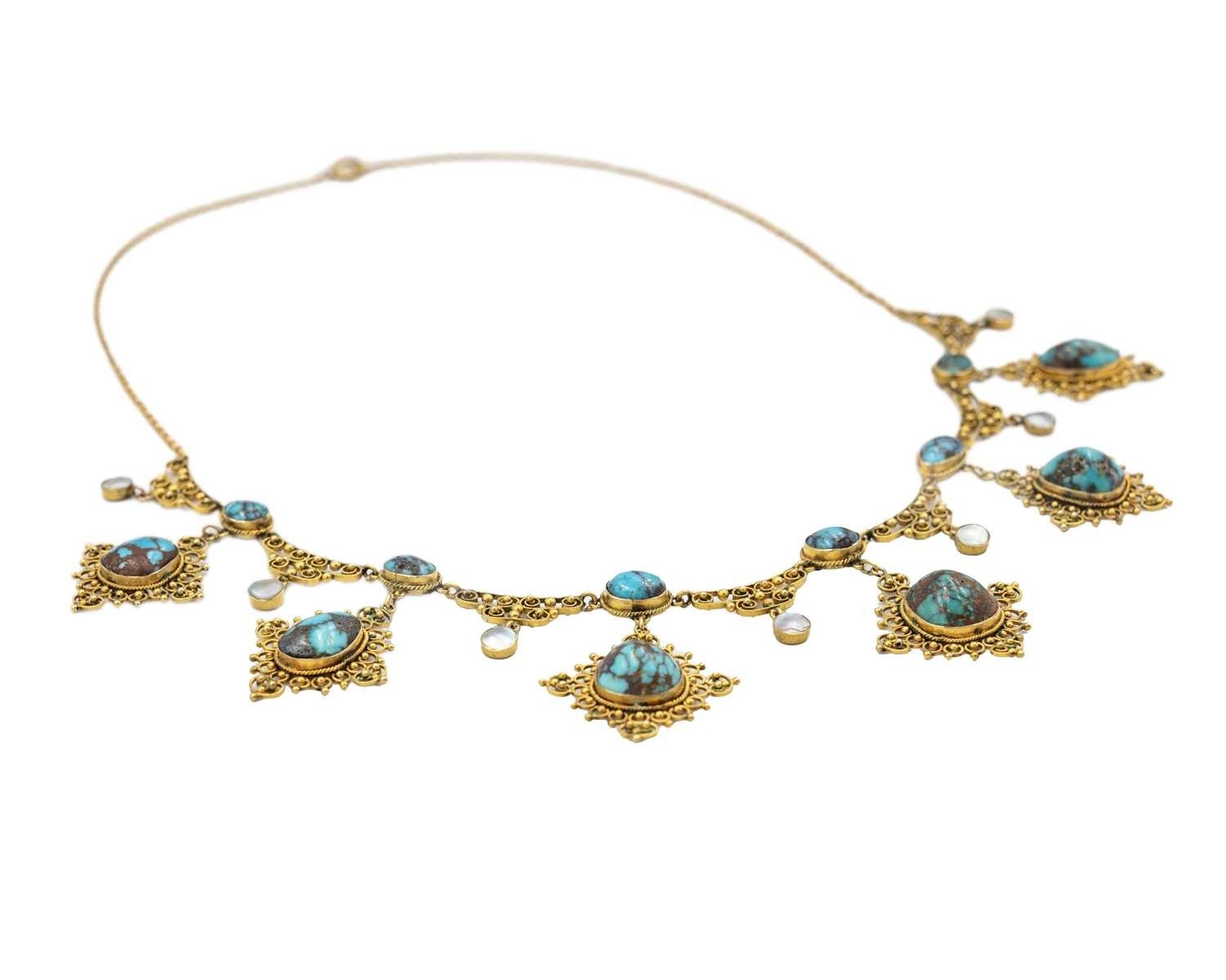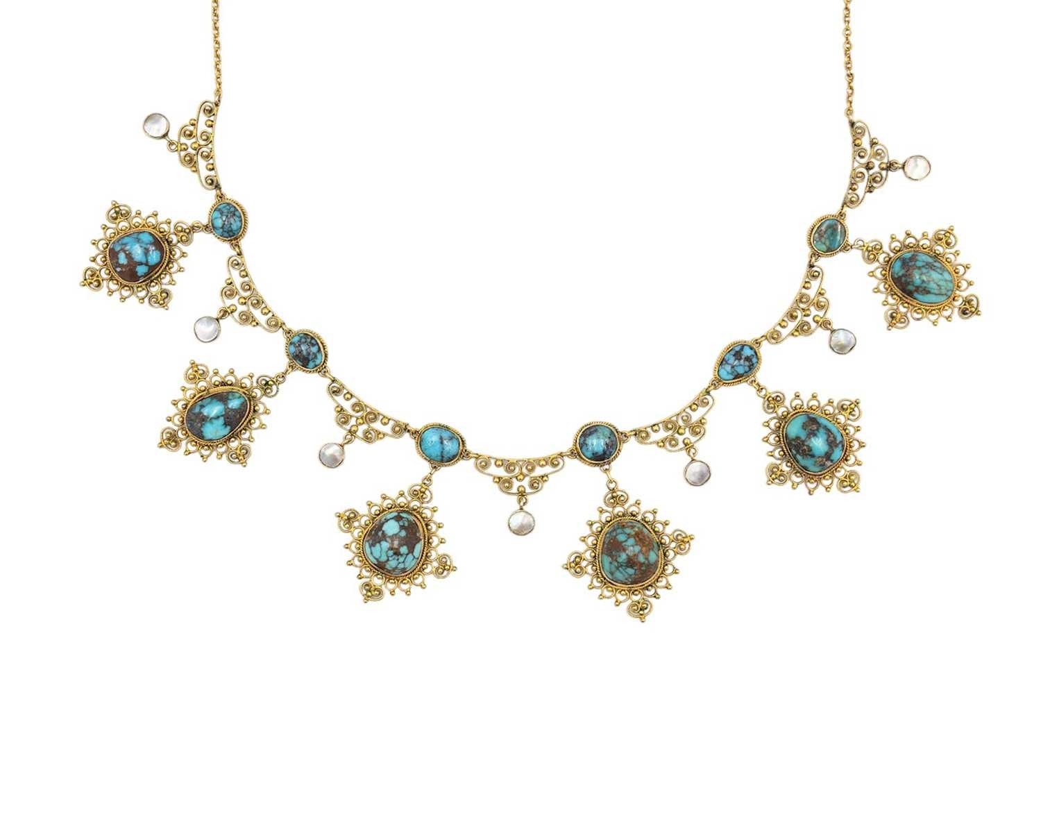 A 19th-century Etruscan Revival gold filigree turquoise and mother-of-pearl set fringe necklace. The necklace with six graduated turquoise in matrix cabochons set in lozenge shaped granulated filigree scroll mounts, one small mother-of-pearl set pendant stamped 9ct, on a trace link chain, length overall 42cm, 16.1g. Within a R.L.Christie Edinburgh retailers necklace box. No missing details, no damage, very good used condition.