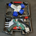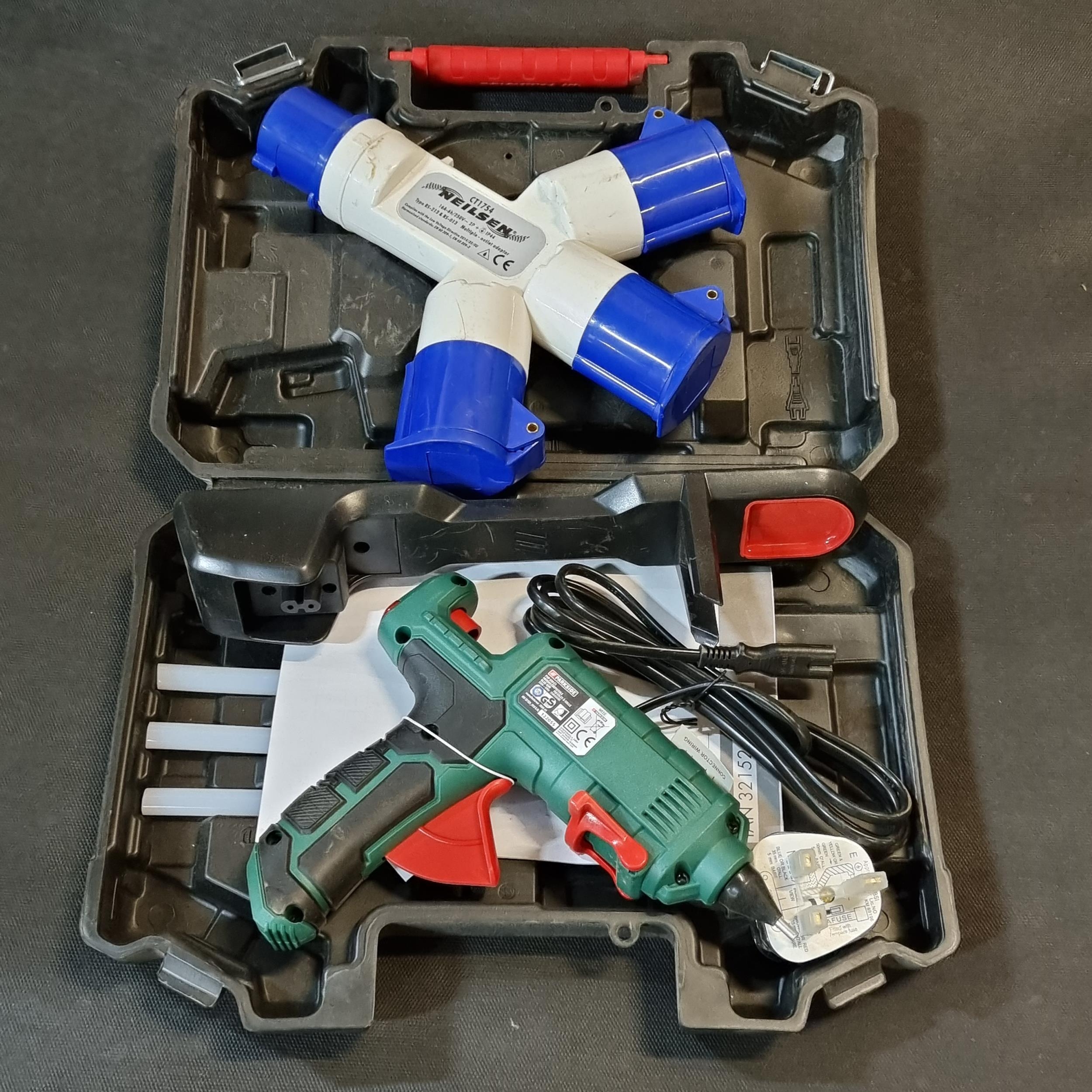 A Parkside PHP 500 E3 Glue Gun, as new with three glue sticks, a stand and plug adaptor. Unused and in hard carry case. Along with a Neilsen Multiple outlet adaptor.