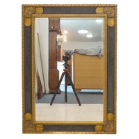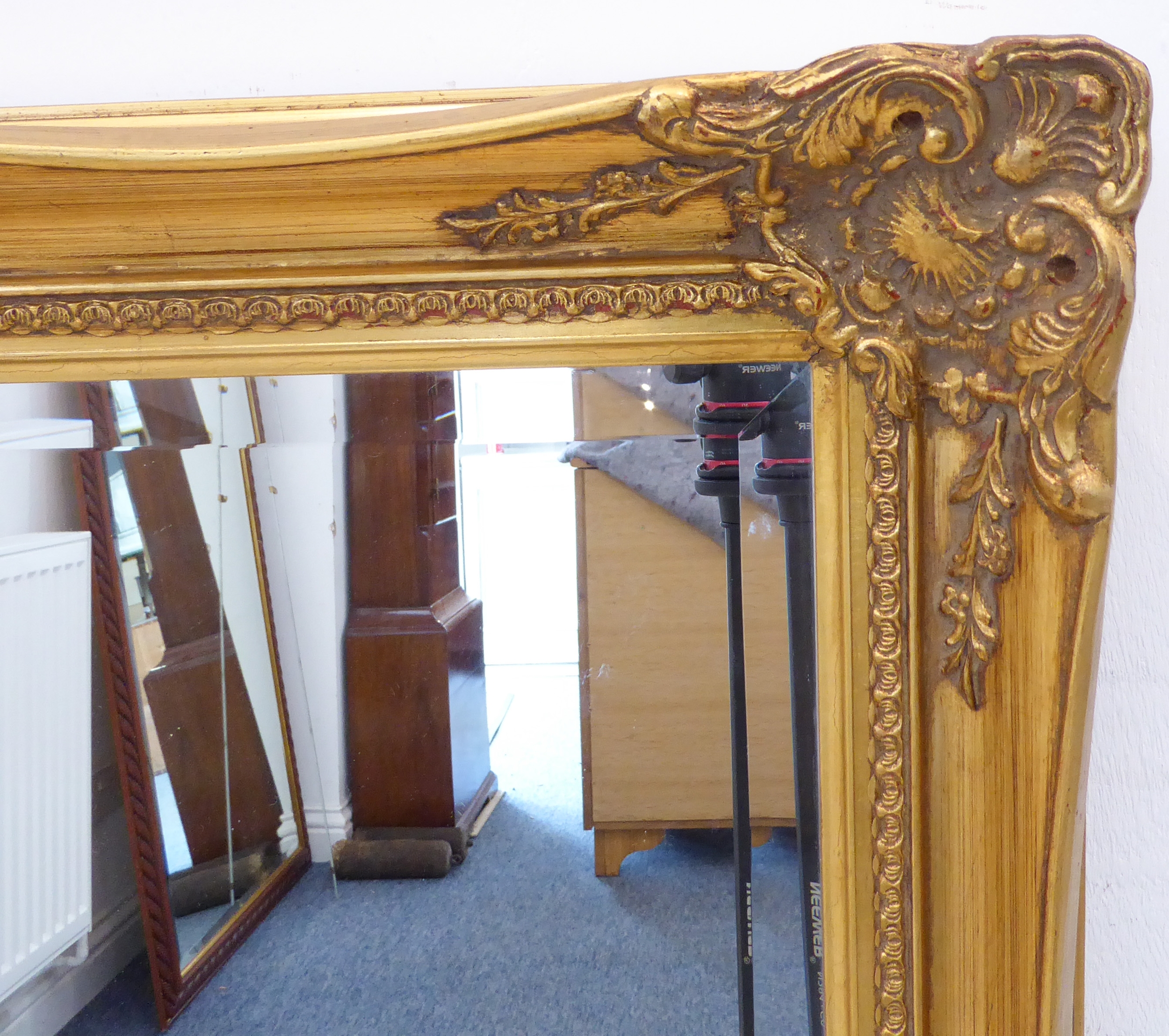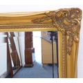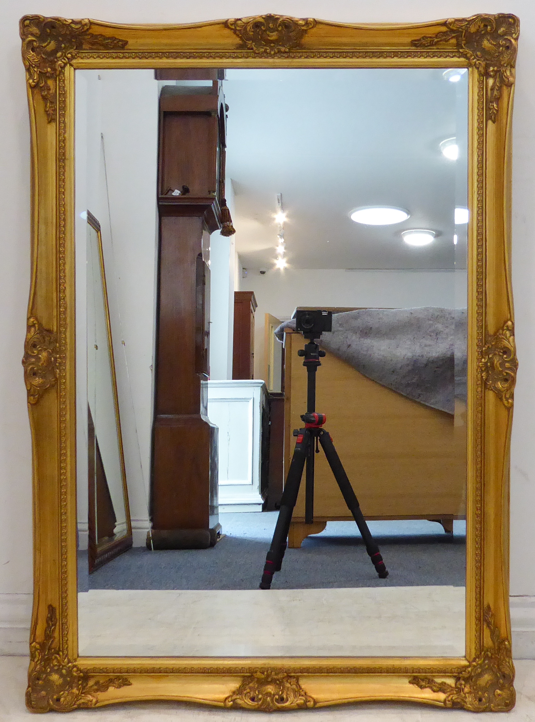 A modern gilt-framed wall-hanging looking glass; outset corners and hand-bevelled plate (frame size 105cm x 74cm)