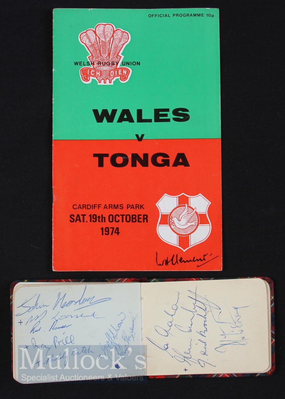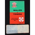 Autographs, Tonga Rugby 1974 & Australia 1975 (26+): With the Wales v Tonga programme, a small tartan autograph book containing virtually only these signatures with 11 Tongans and more than 15 Wallabies inc Hipwell, Finnane, Cornelsen, McLean, Shaw, Ray Price and Paddy Batch. VG