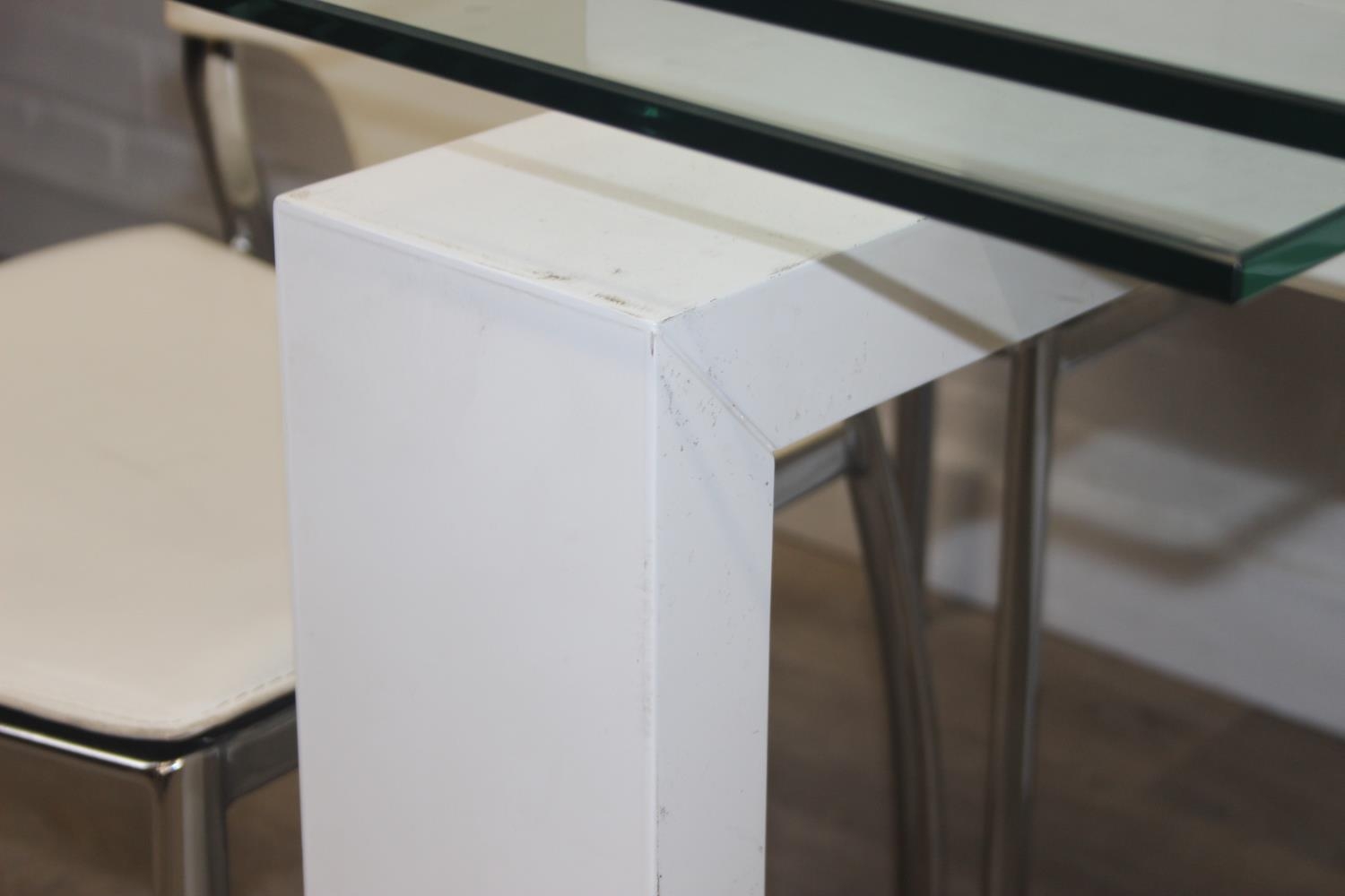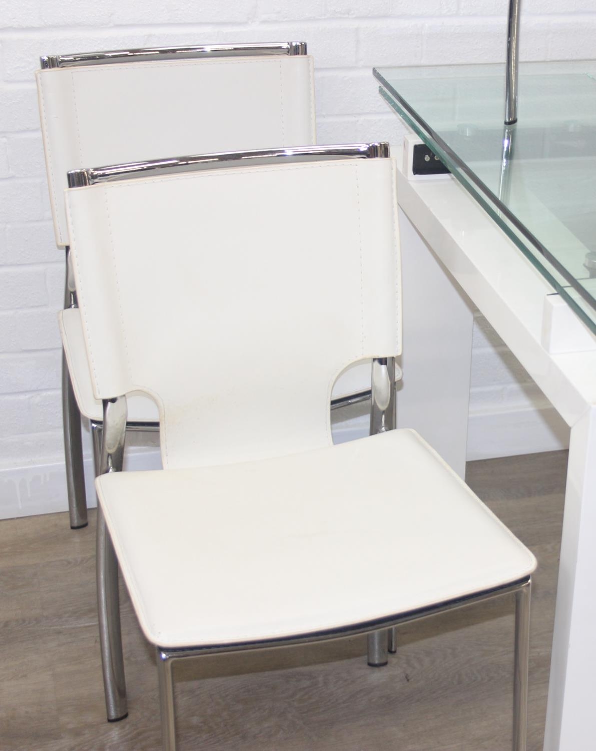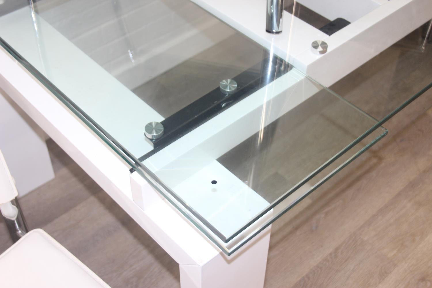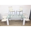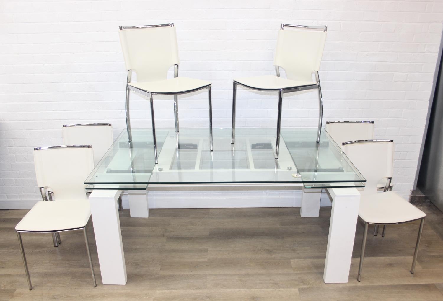 Glass and white high gloss extending dining table when extended, and a set of 6 chrome and cream coloured leather chairs, the chairs believed to be Baxton Studio but unmarked, the table 230cm x 100cm x 77cm