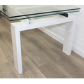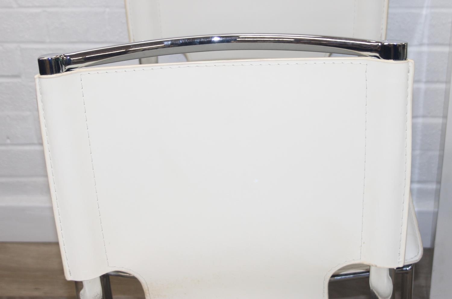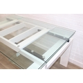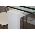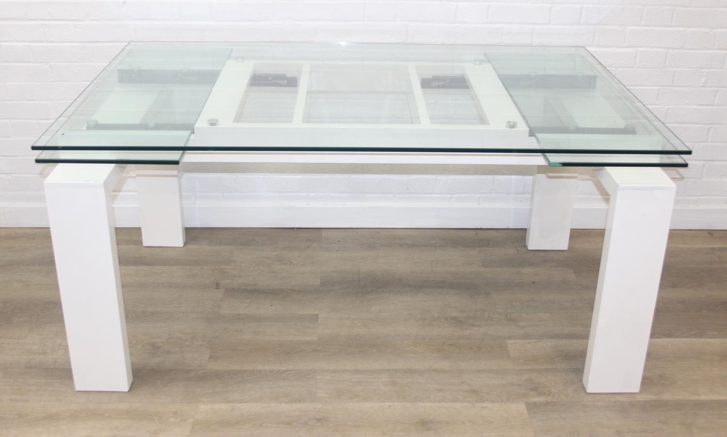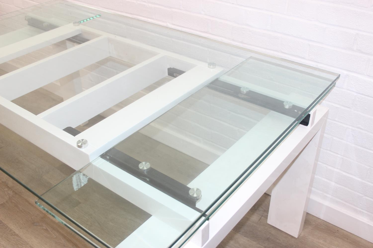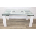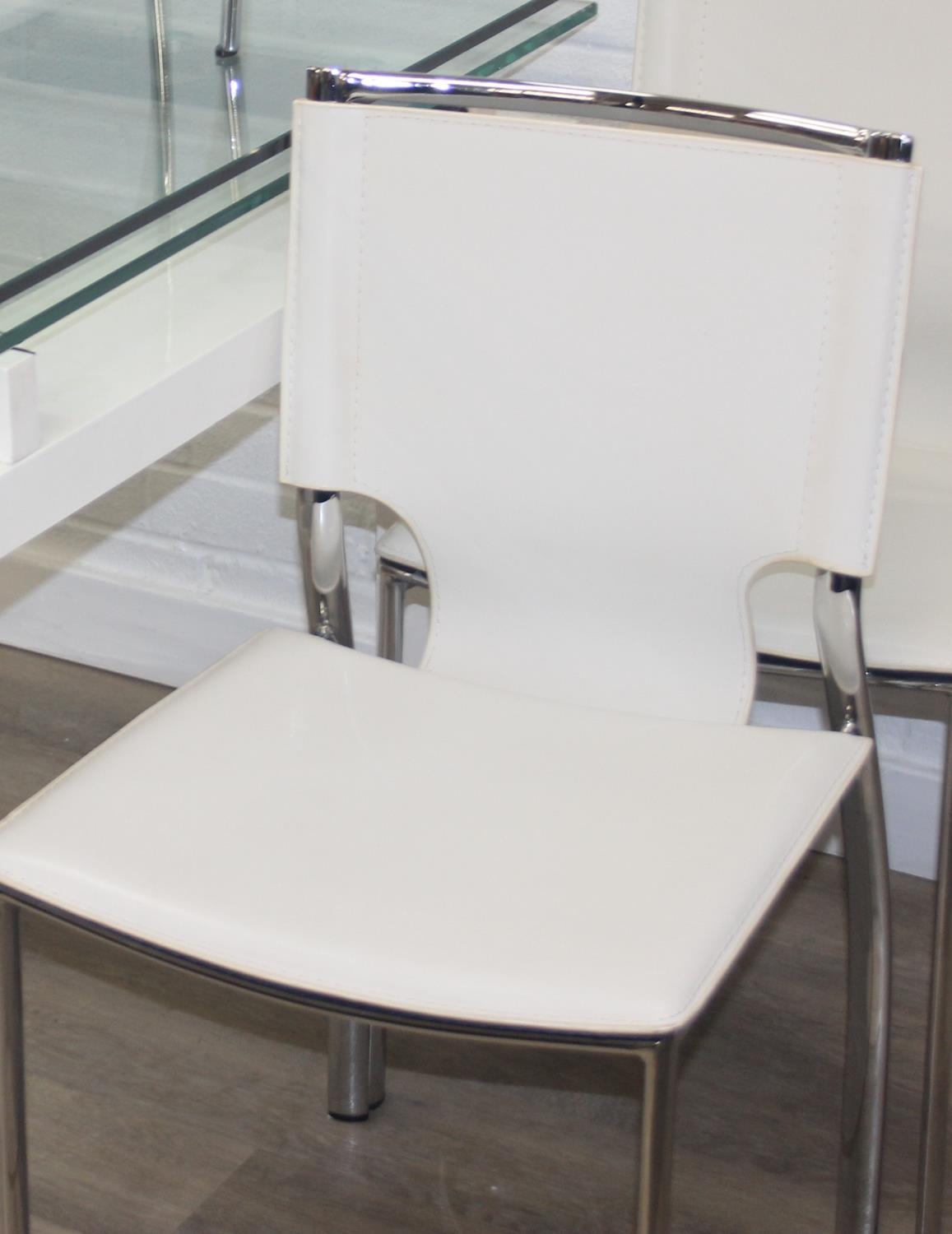 Glass and white high gloss extending dining table when extended, and a set of 6 chrome and cream coloured leather chairs, the chairs believed to be Baxton Studio but unmarked, the table 230cm x 100cm x 77cm