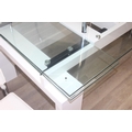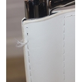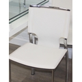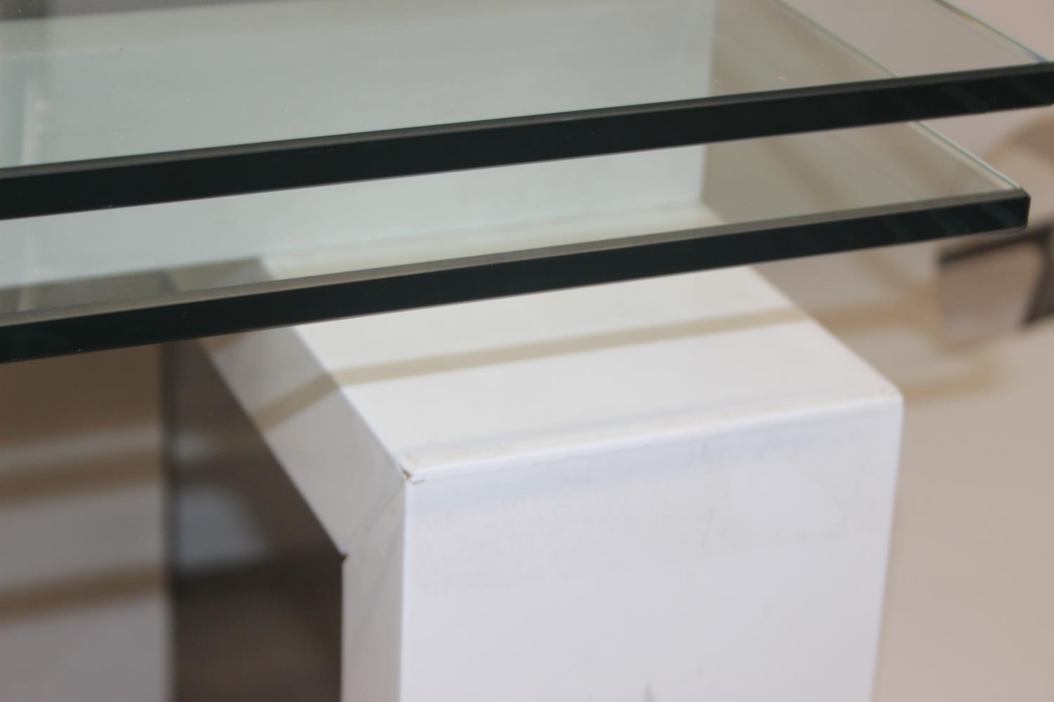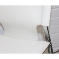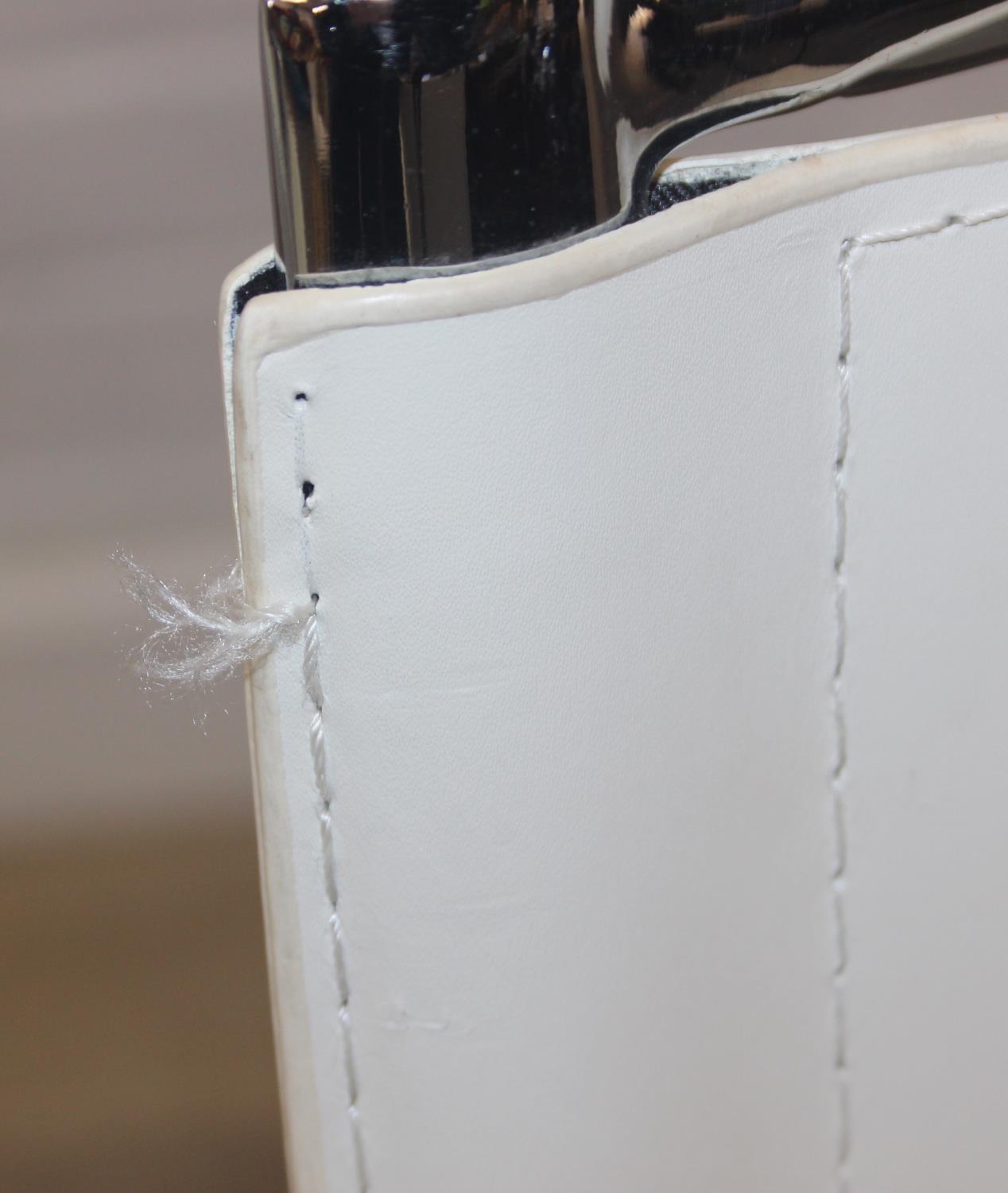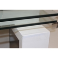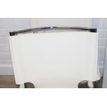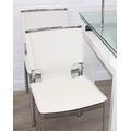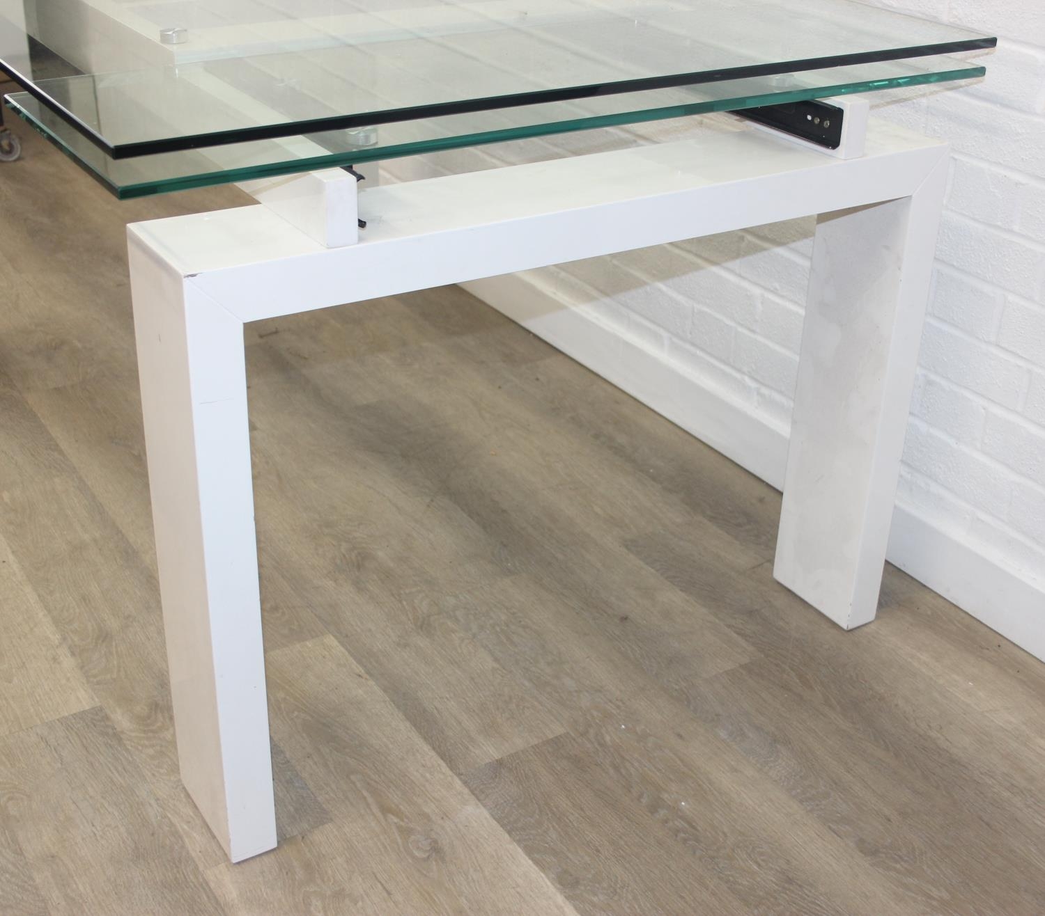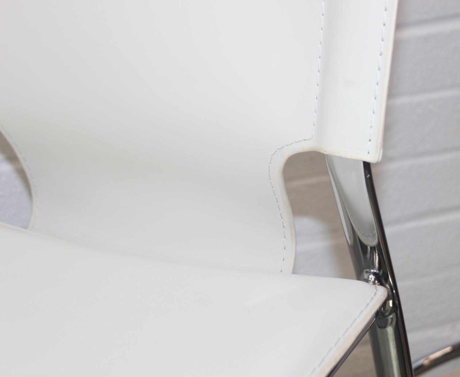 Glass and white high gloss extending dining table when extended, and a set of 6 chrome and cream coloured leather chairs, the chairs believed to be Baxton Studio but unmarked, the table 230cm x 100cm x 77cm