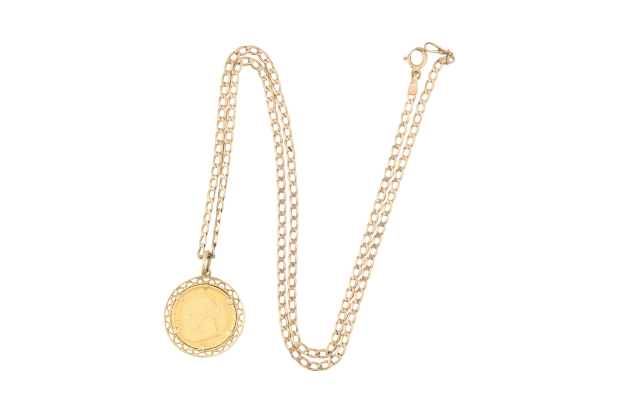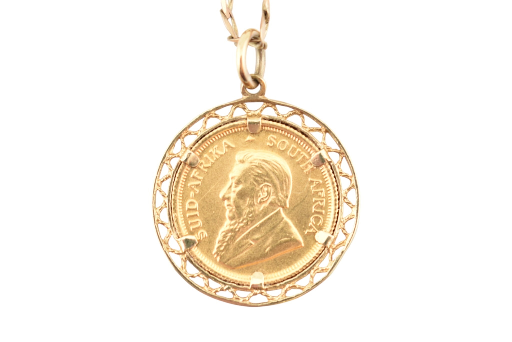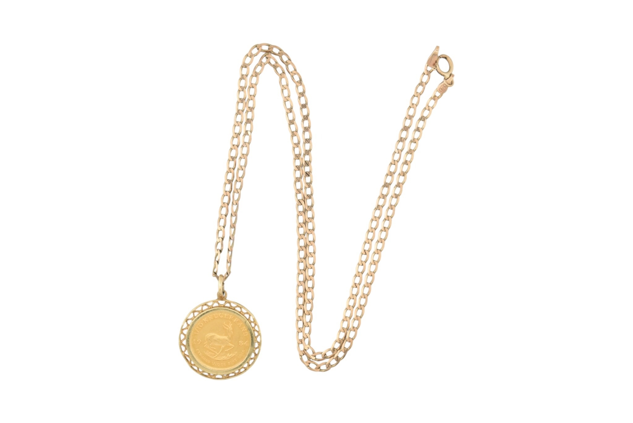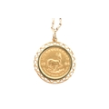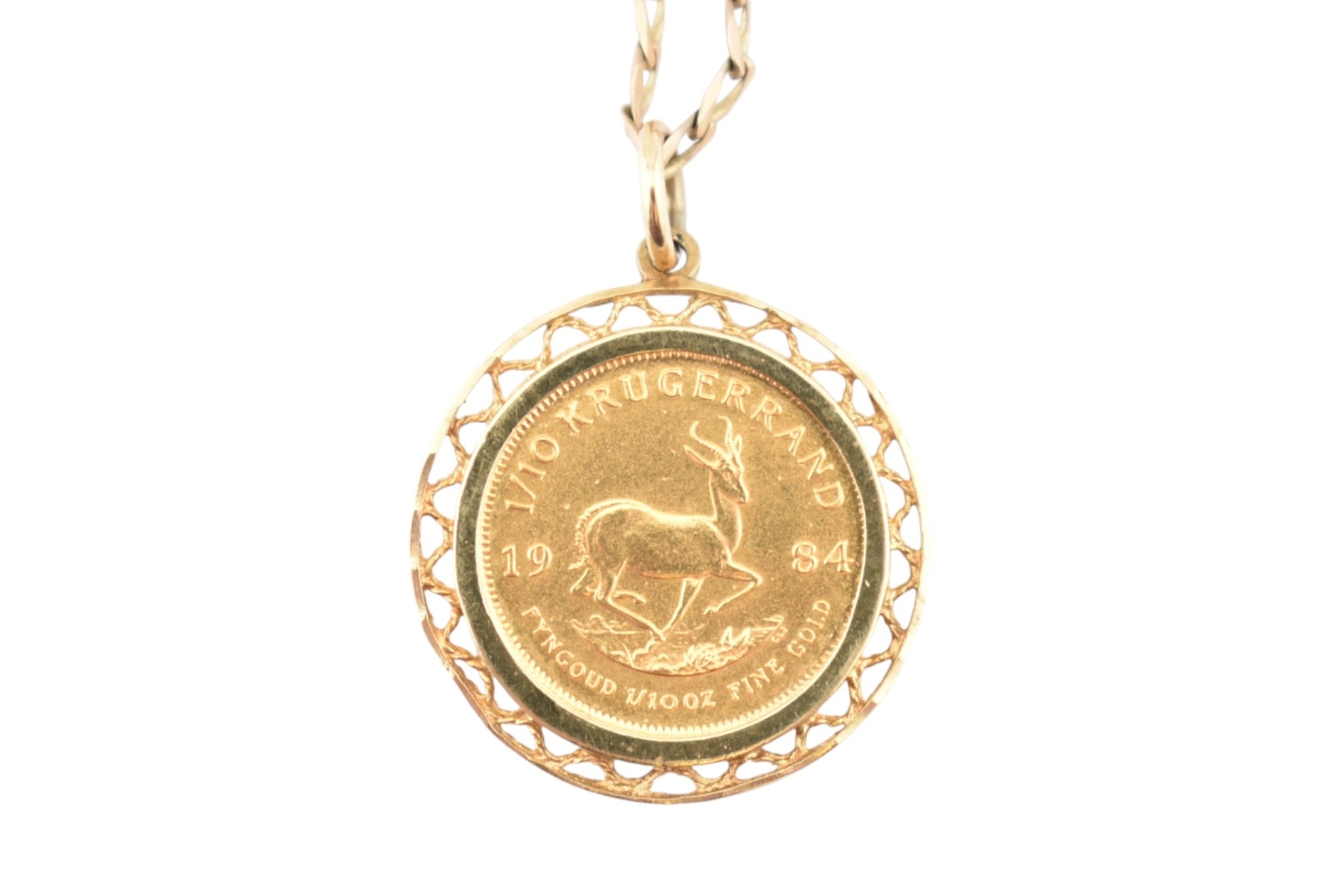 A South African gold one-tenth 1/10 oz Krugerrand 1984 coin inset to a pendant mount and strung upon a hallmarked chain necklace. Total weight 7.7g. Measures 44cm