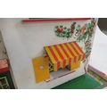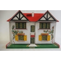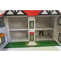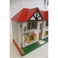 A Geebee dolls house, with white walls painted with vines, red roof, metal door, windows and pullout window shades, opening on both sides to reveal four internal rooms, one with a metal fireplace, 24" wide (Est. plus 21% premium inc. VAT)