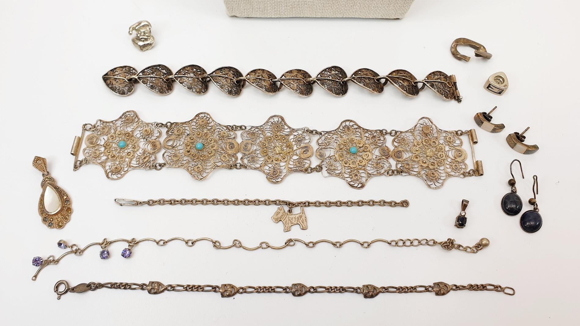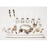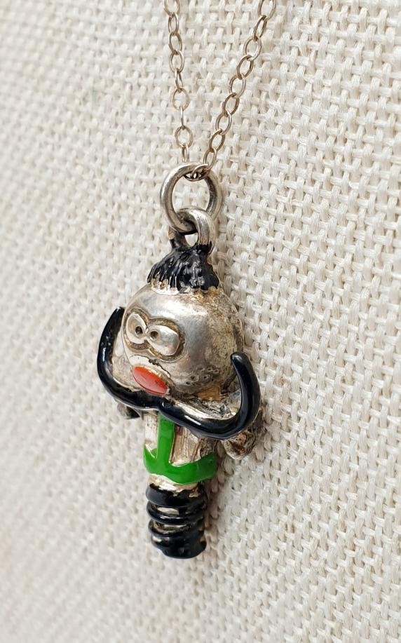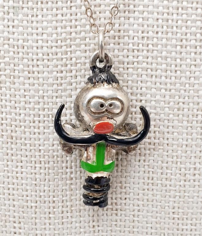 A cold painted hallmarked silver Magic Roundabout Zebedee pendant, length 2.5cm on a silver chain, chain length 46cm together with other silver and white metal jewellery some of which is A/F. UK shipping £14.