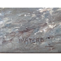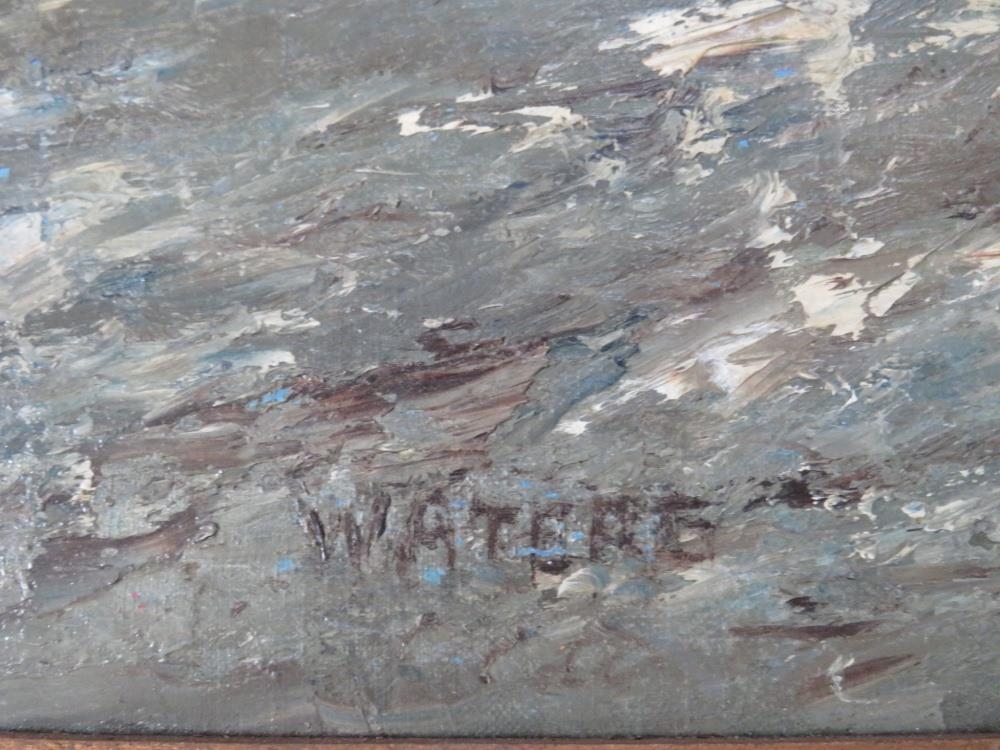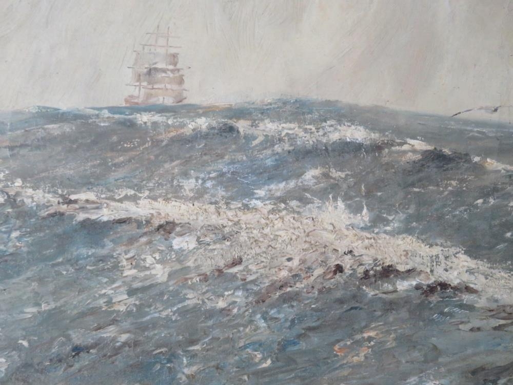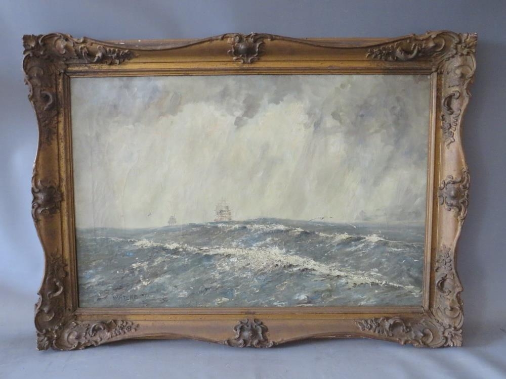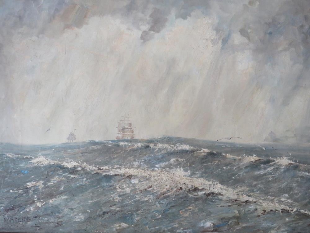 CAPT. JOHN WATERS (XX). Stormy seascape with sailing vessels in a heavy swell 'Off Coquirubo 06, a Good Landfall, Cape Horn at Last', see label verso, signed lower left, oil on canvas, framed, 50 x 75 cm