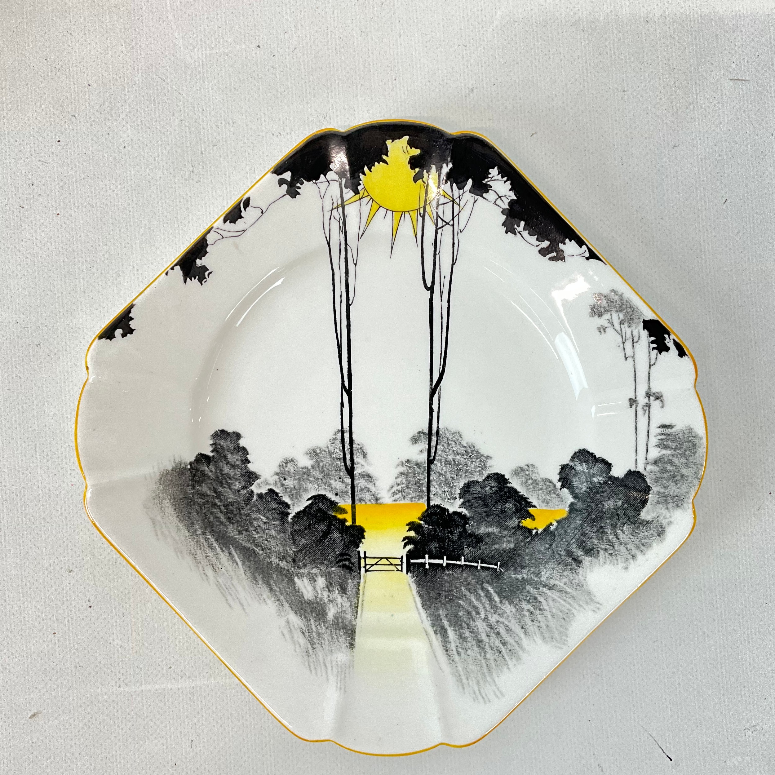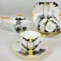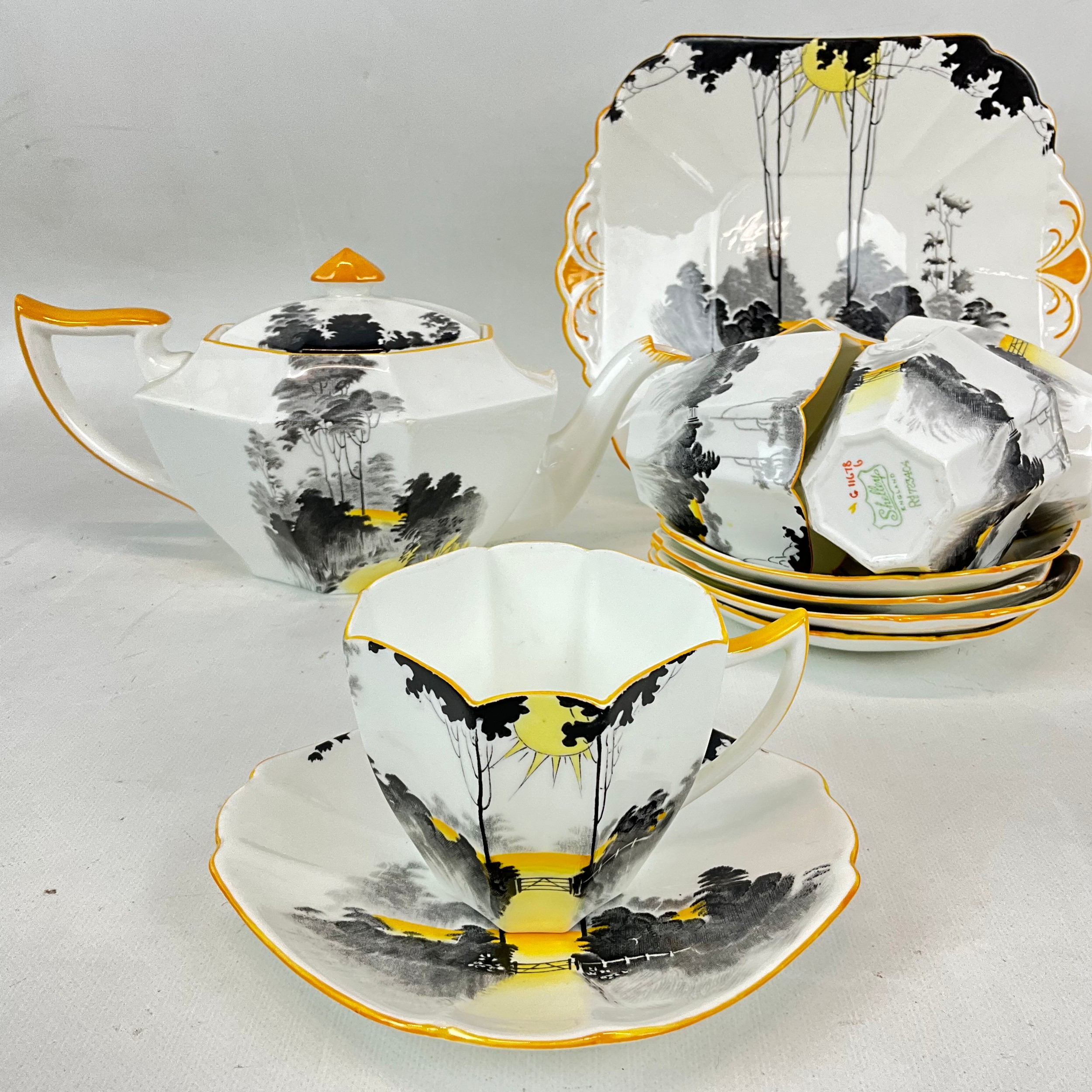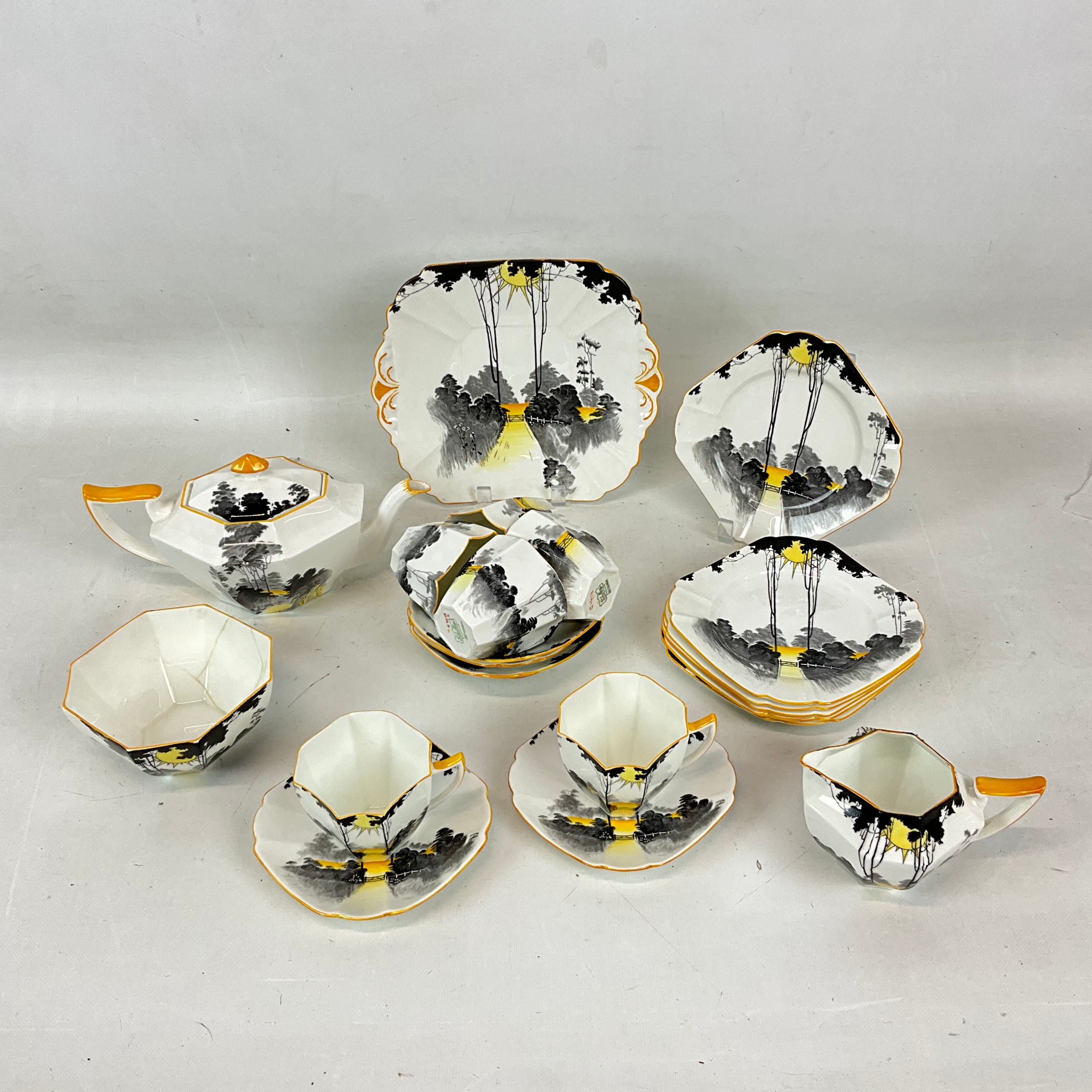 Shelly Art Deco six-setting tea service, 'Sunset and Tall Trees' pattern, comprising a teapot, sugar bowl, milk jug, six cups and saucers, a sandwich plate and six side plates. (22)