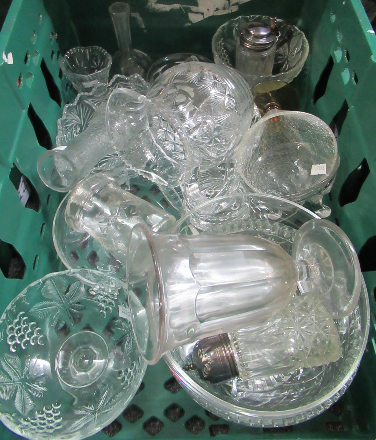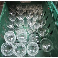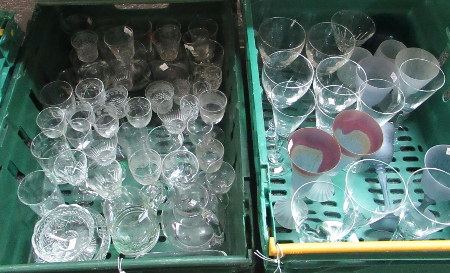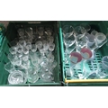 Four large boxes of assorted glass ware, mainly 20th century drinking glasses, to include: conical shaped wine glasses, etched glass sherry glasses and cut glass liqueur glasses, moulded glass wine glasses, punch glasses, stemmed trifle bowls, cut glass bowls and jugs, frosted glass goblets etc. (4)