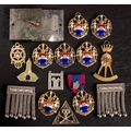 A group of various Masonic jewels: comprising seven silver gilt and enamel jewels, a square steel mould for casting set squares, a gilt octant with crucifix and rose, a triangle with skull and crossbones, a pair of silver tassels and others.