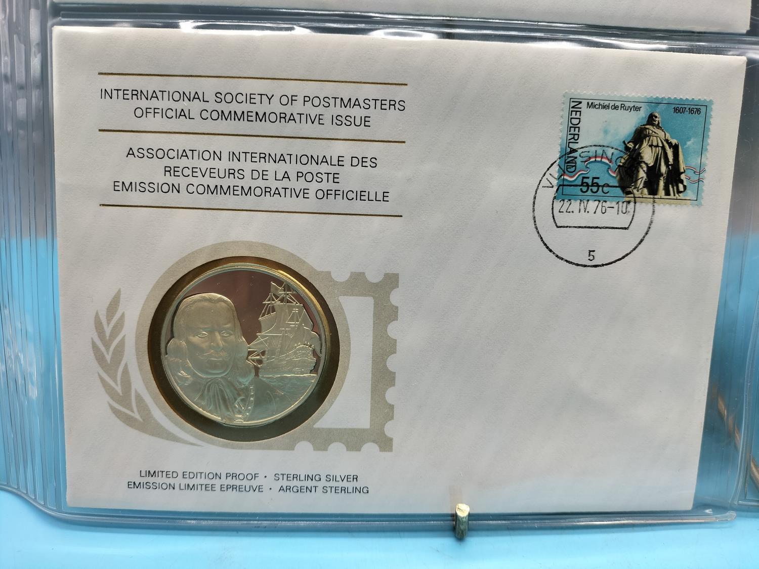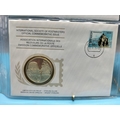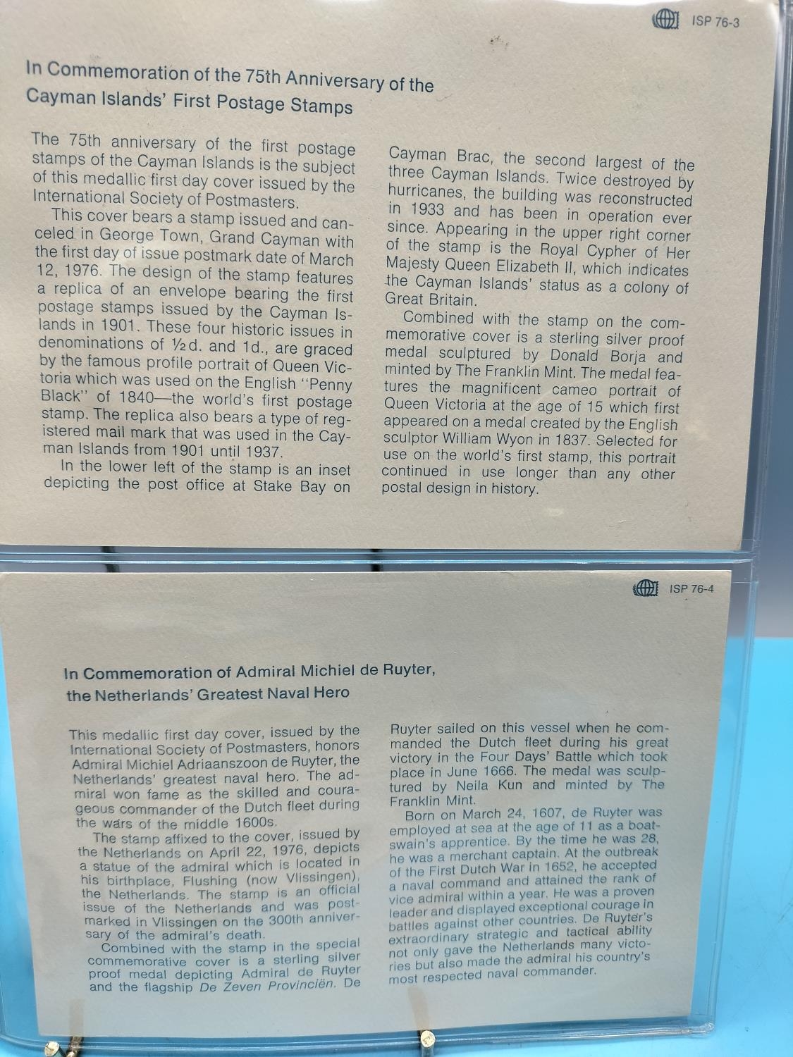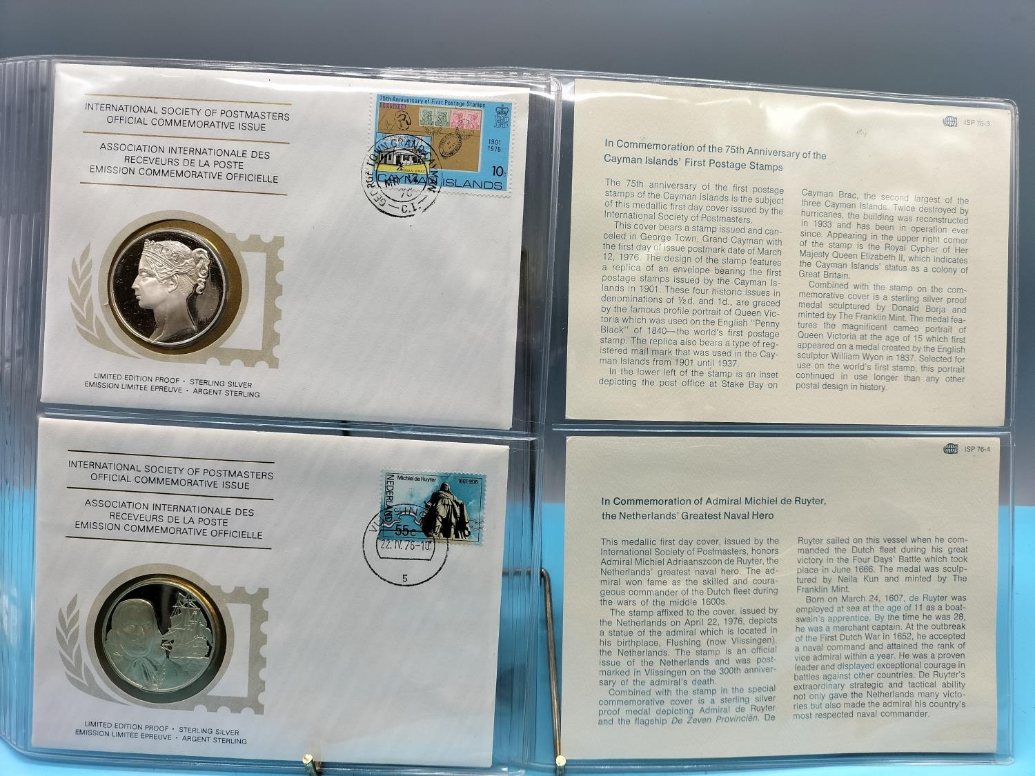 1976 International Society of Postmasters Official Commemorative Issue First Day Covers with Sterling Silver Coins (2) for '75th Anniversary of the Cayman Islands First Postage Stamps' and 'Admiral Michiel de Ruyter, Netherlands Greatest Naval Hero'.