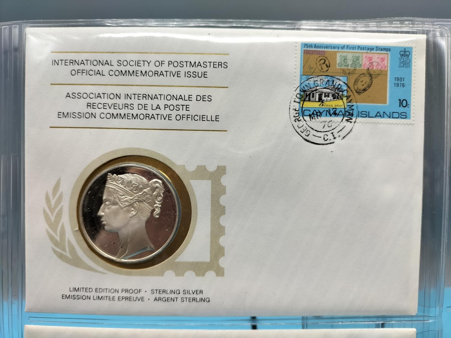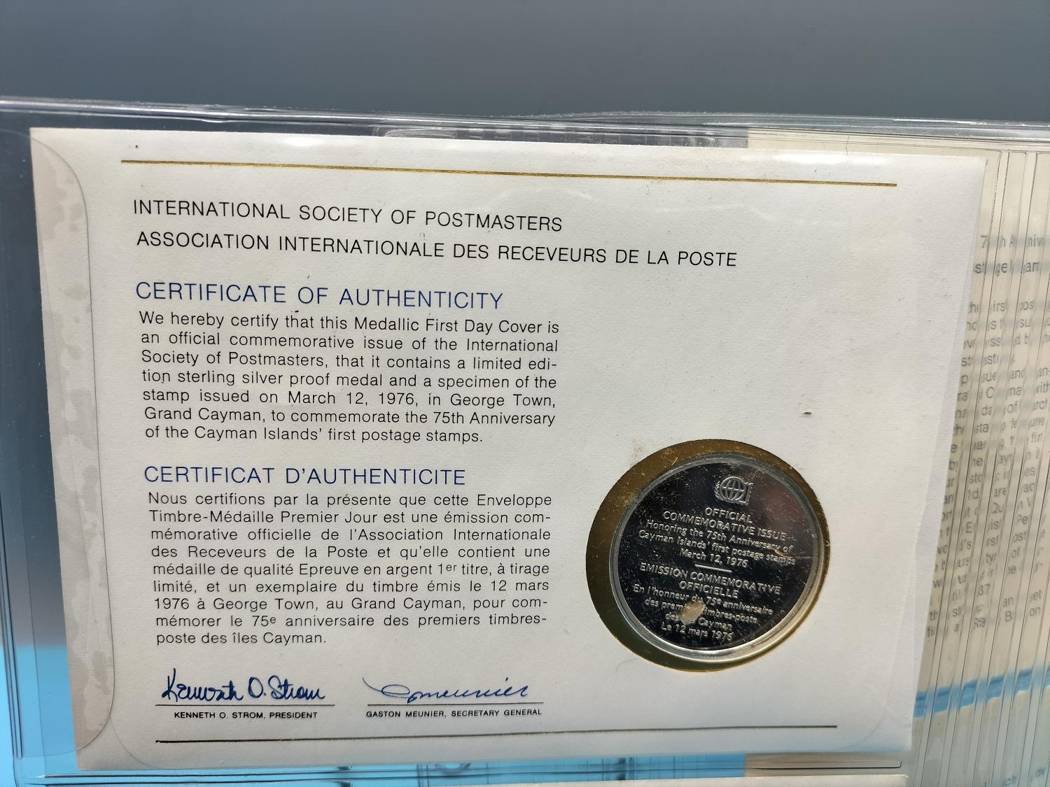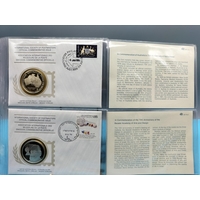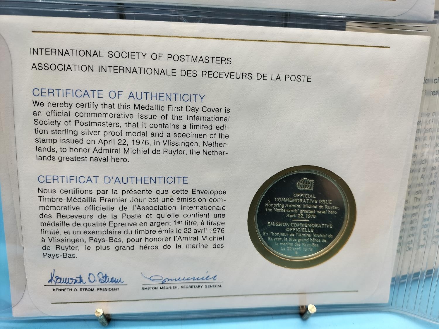 1976 International Society of Postmasters Official Commemorative Issue First Day Covers with Sterling Silver Coins (2) for '75th Anniversary of the Cayman Islands First Postage Stamps' and 'Admiral Michiel de Ruyter, Netherlands Greatest Naval Hero'.