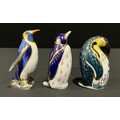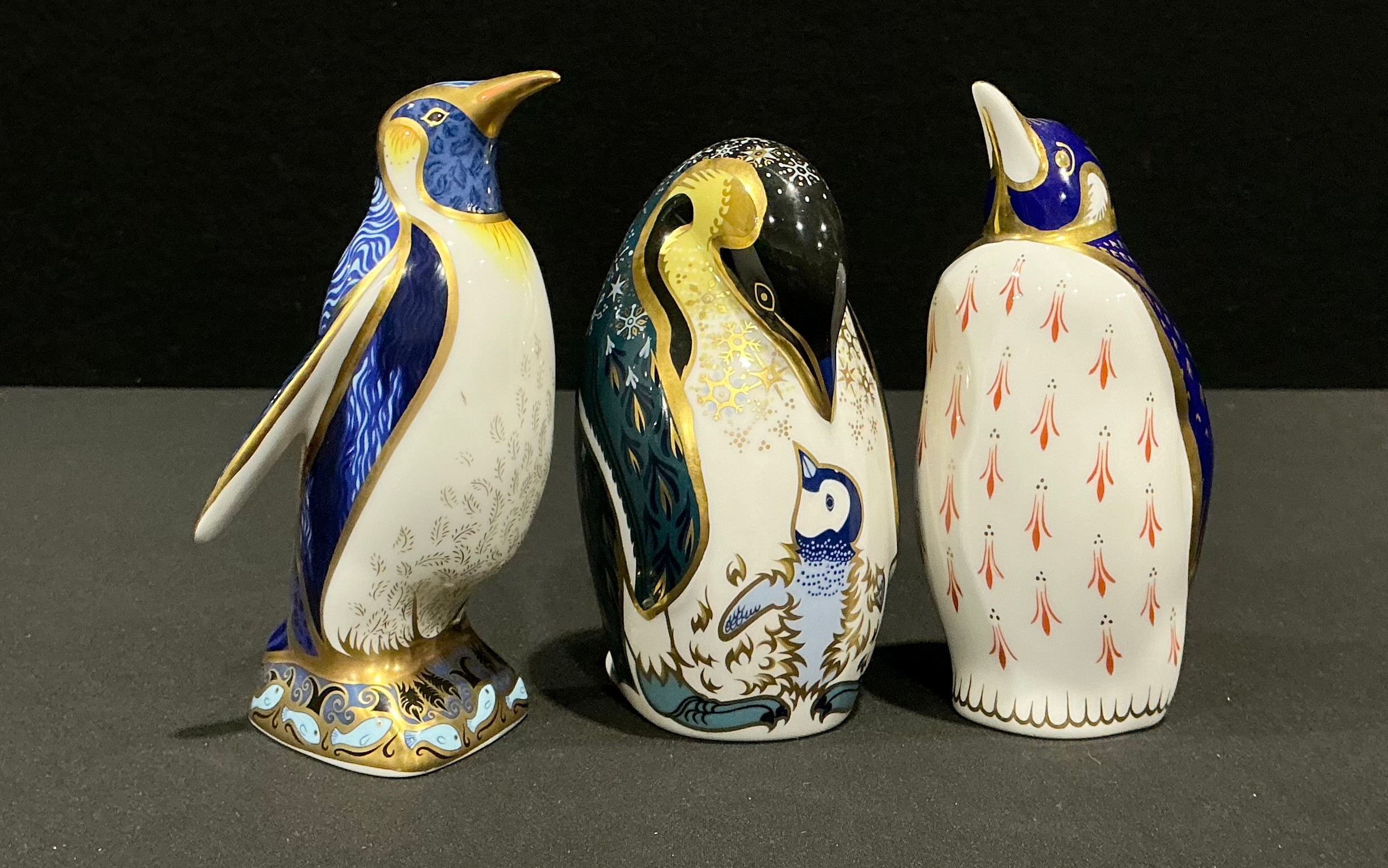 A Royal Crown Derby paperweight, Emperor Penguin, silver stopper, 13.5cm high; others, Penguin and Chick, silver stopper, 12.5cm; Penguin, solid stopper, second quality (3)
