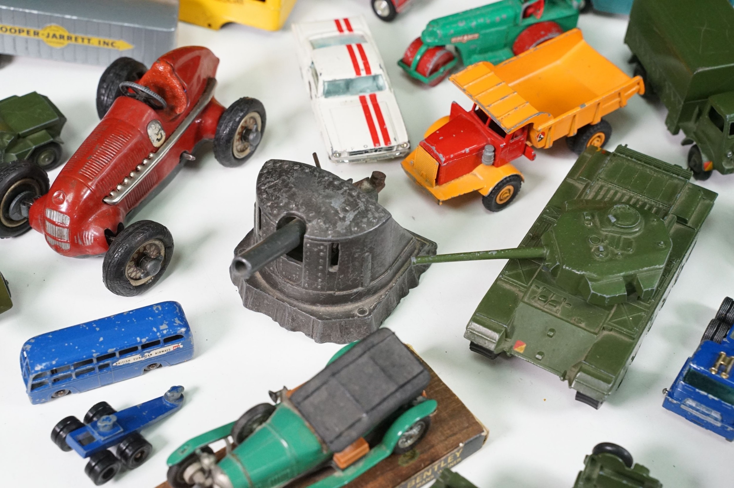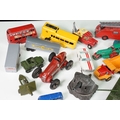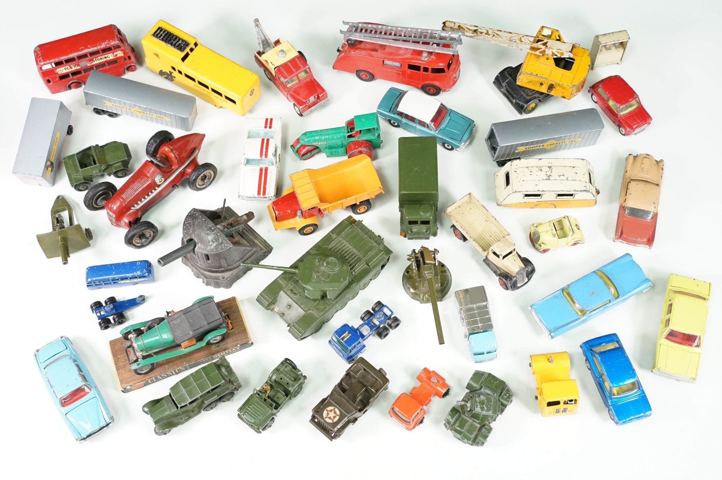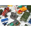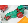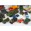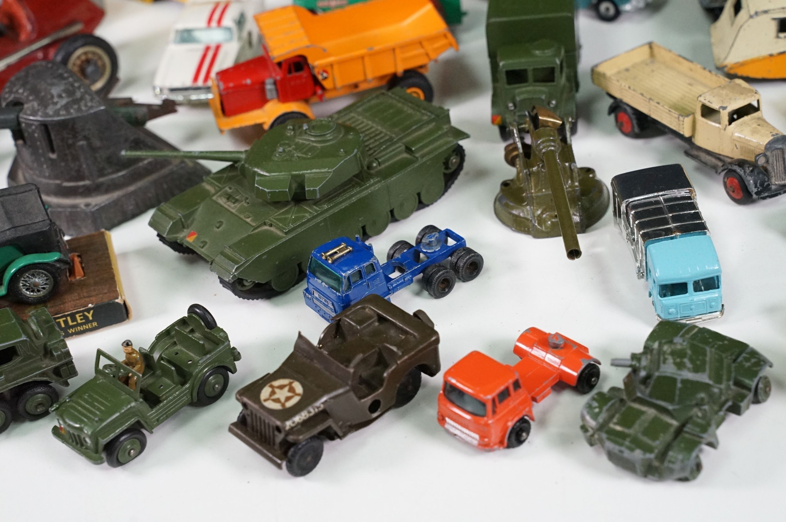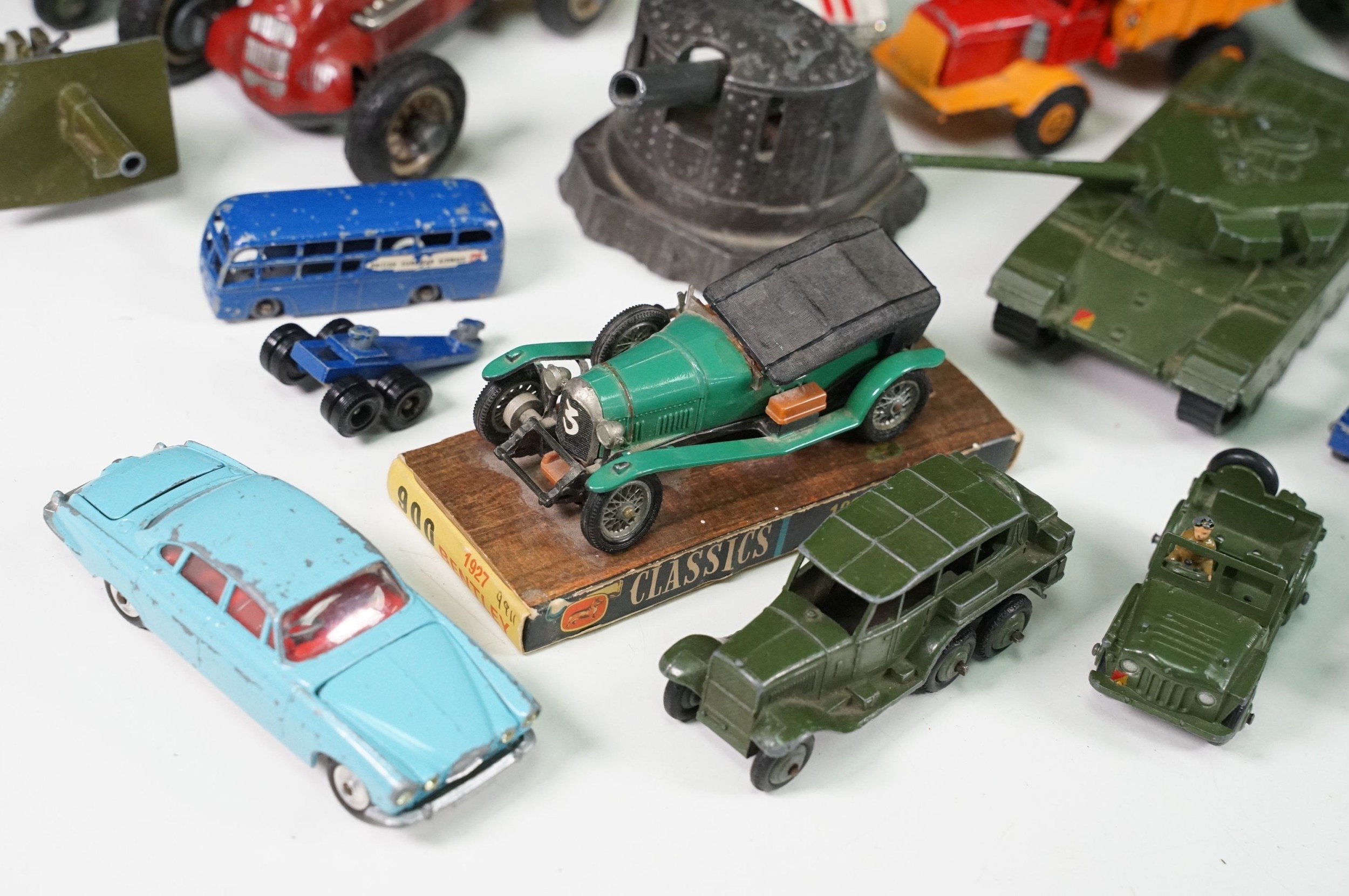 Around 30 Mid 20th C onwards playworn diecast models to include Dinky, Corgi, Budgie Toys, Astra, Matchbox Lesney Series, etc including some Dinky military examples, together with a Schuco Studio tinplate and clockwork model in red