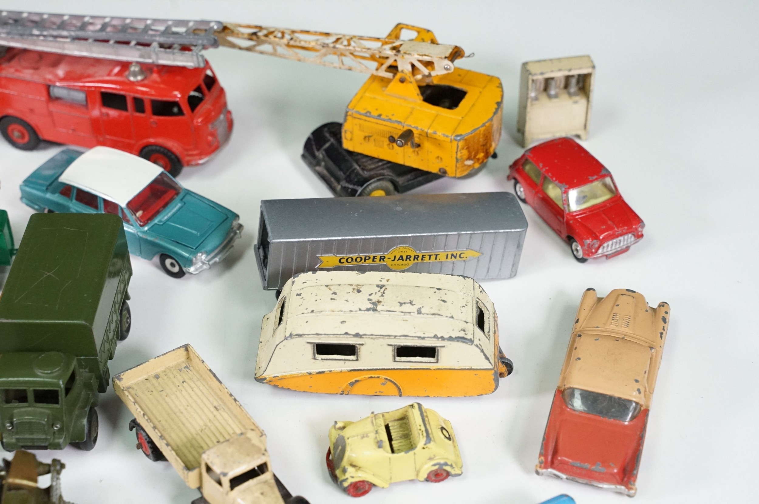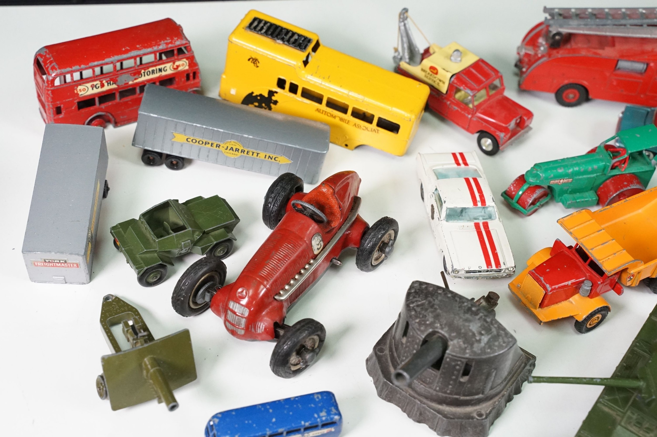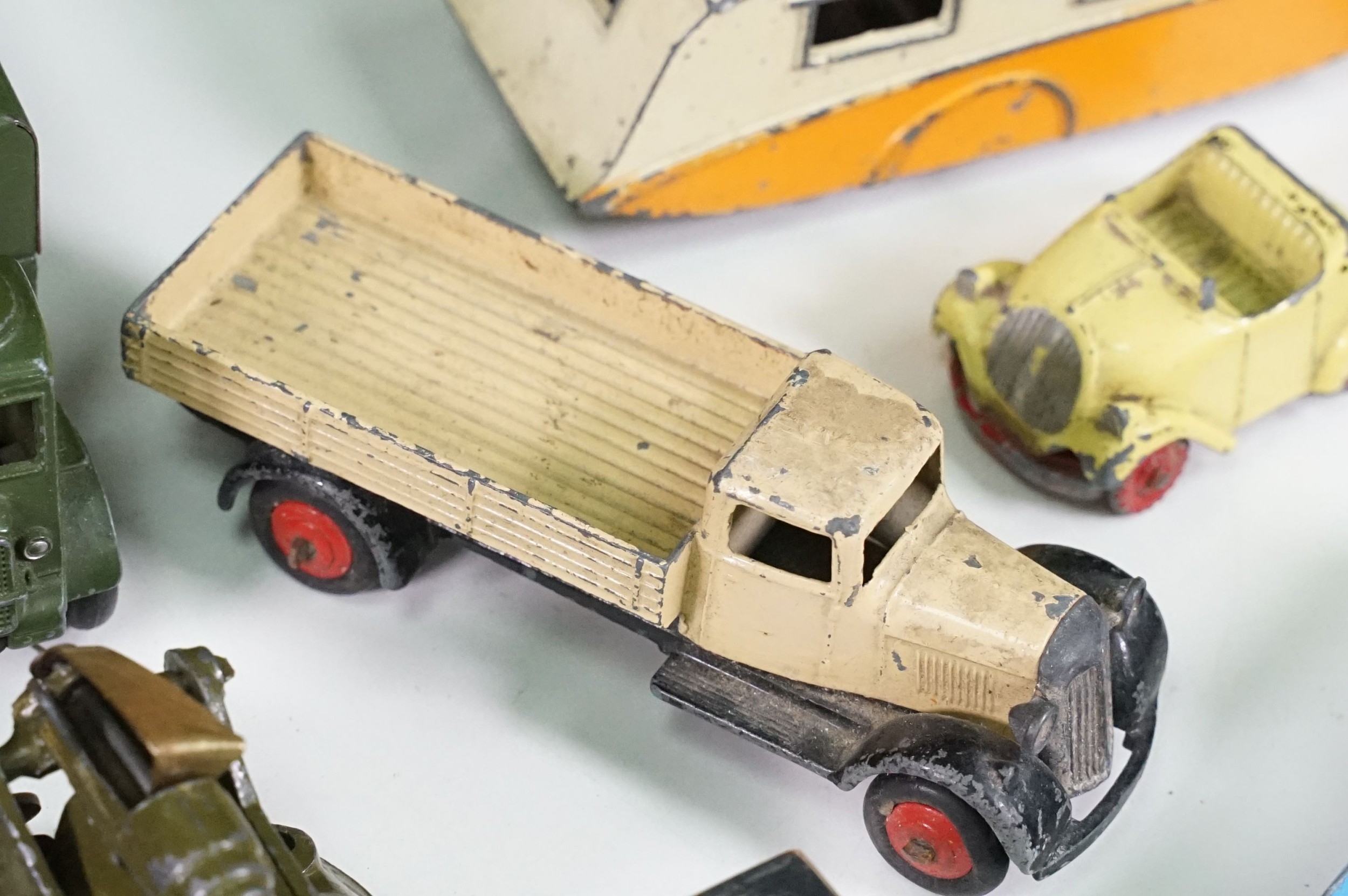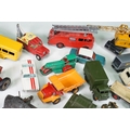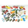Around 30 Mid 20th C onwards playworn diecast models to include Dinky, Corgi, Budgie Toys, Astra, Matchbox Lesney Series, etc including some Dinky military examples, together with a Schuco Studio tinplate and clockwork model in red