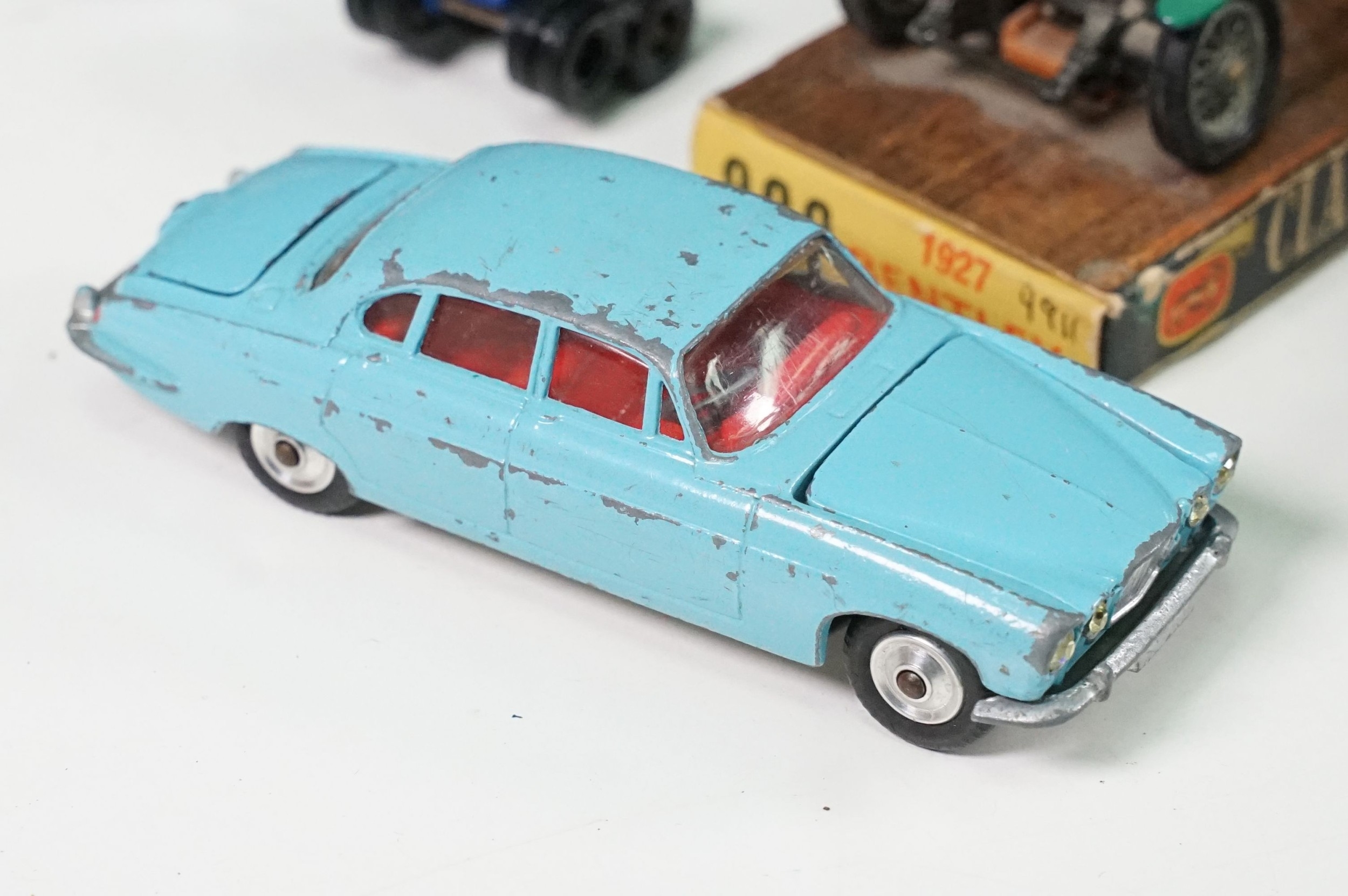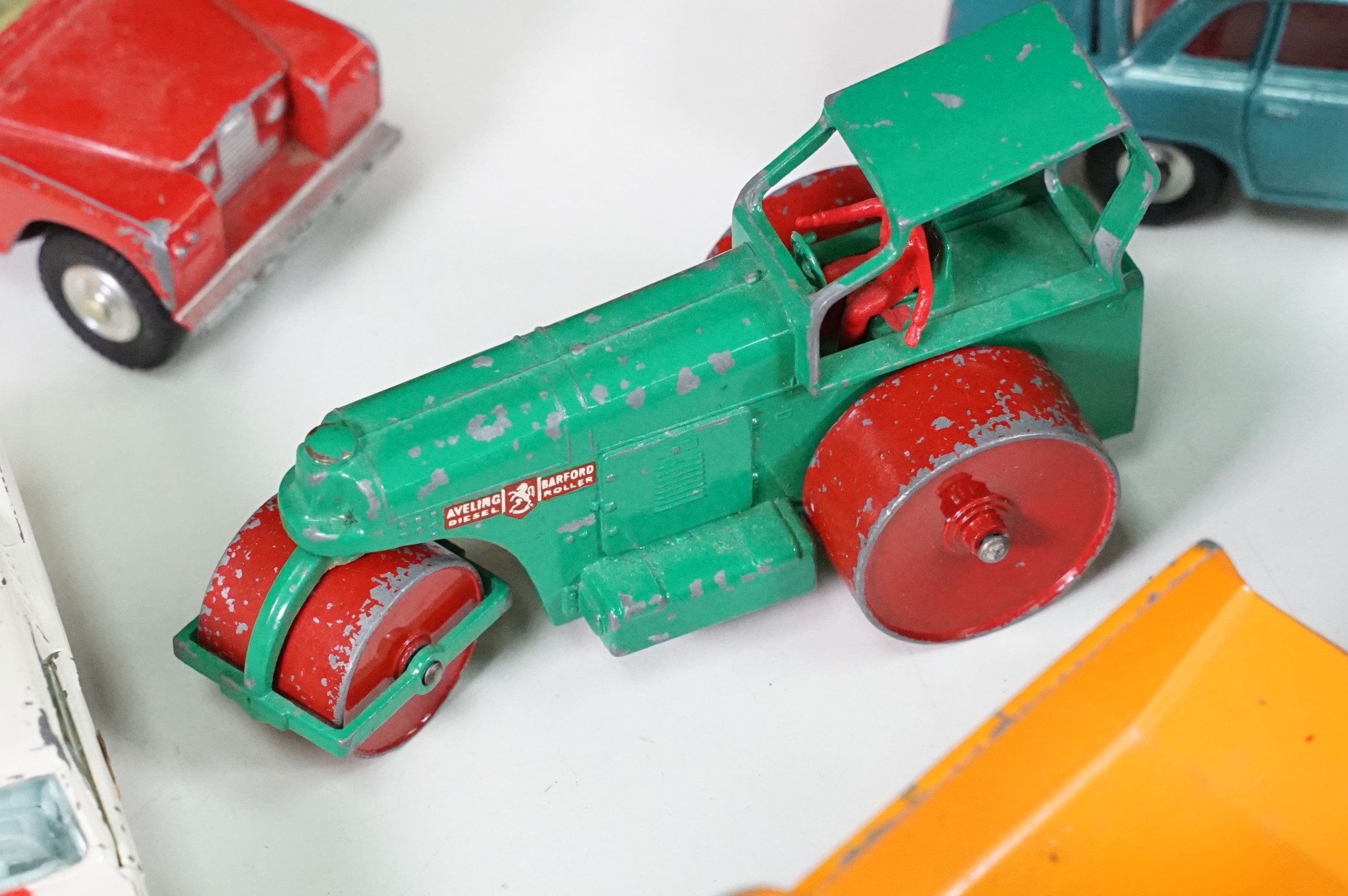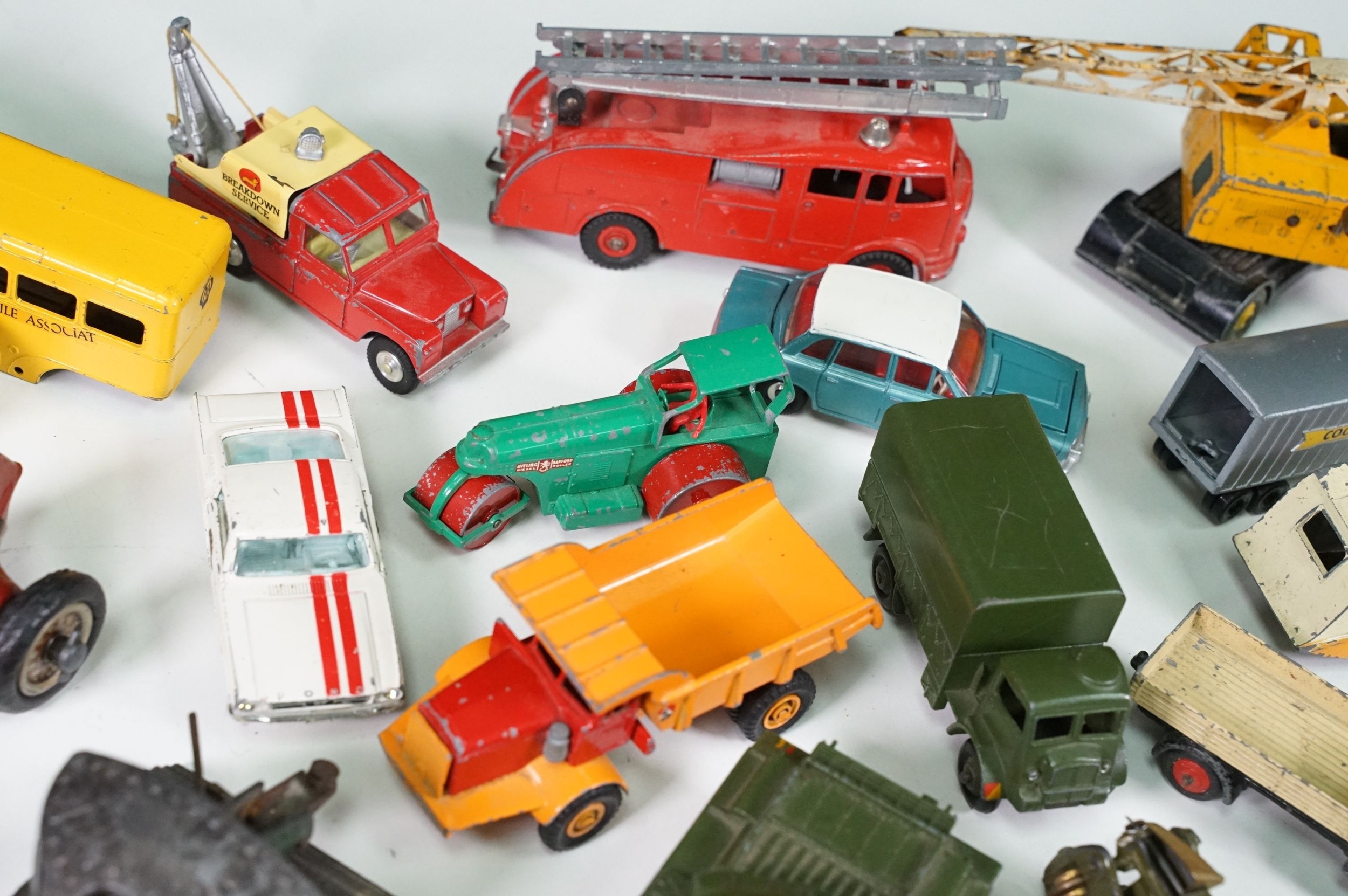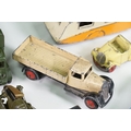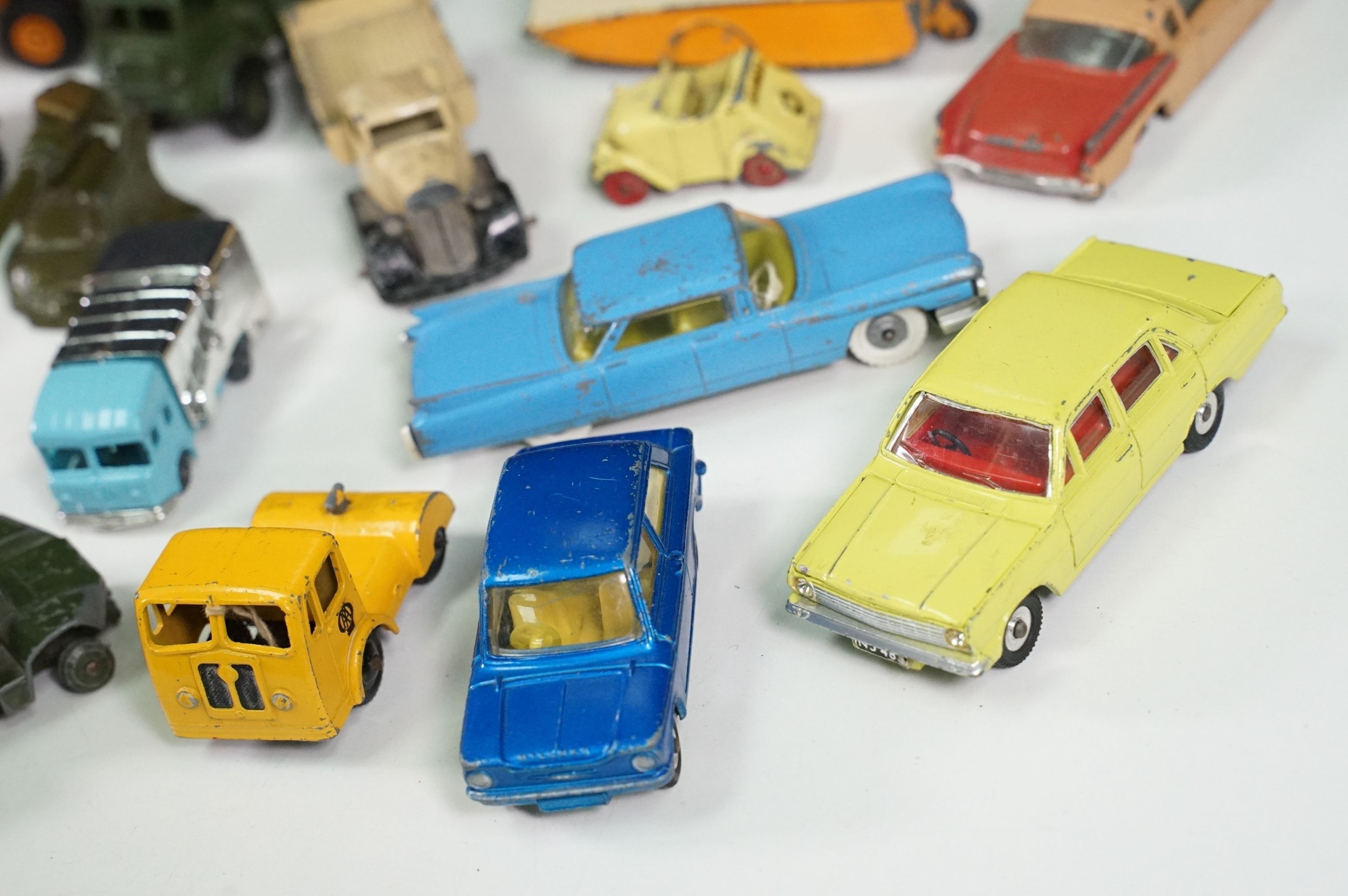 Around 30 Mid 20th C onwards playworn diecast models to include Dinky, Corgi, Budgie Toys, Astra, Matchbox Lesney Series, etc including some Dinky military examples, together with a Schuco Studio tinplate and clockwork model in red
