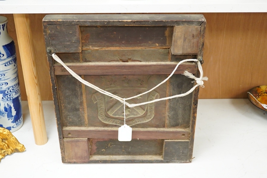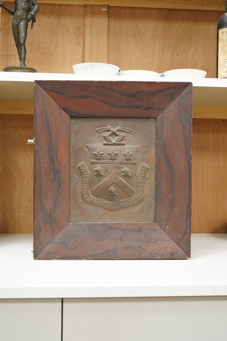 An heraldic copper panel in grained rosewood frame, panel 22cm x 16.5cm, overall 44.5 x 39.5cm