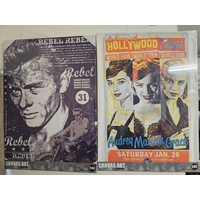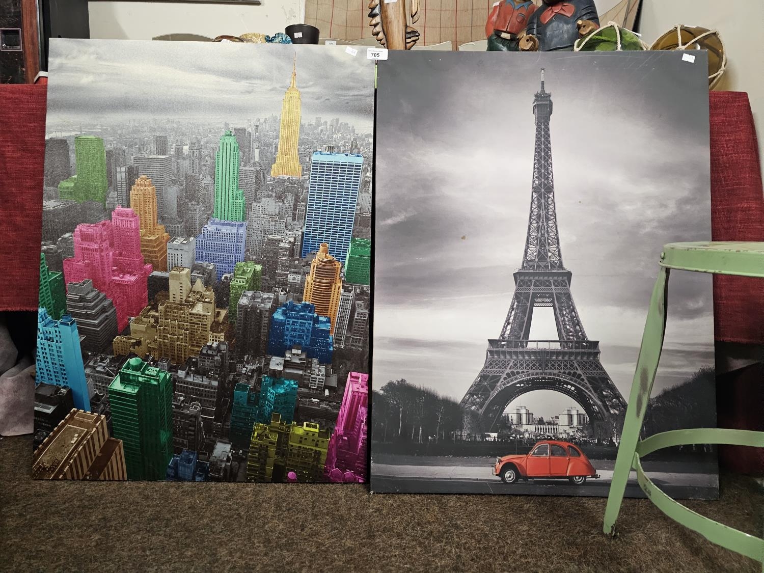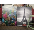 Large black and white canvas print featuring the Eiffel Tower in Paris with a red car in the foreground and High-Lights of New York Skyline Canvas Wall Art