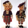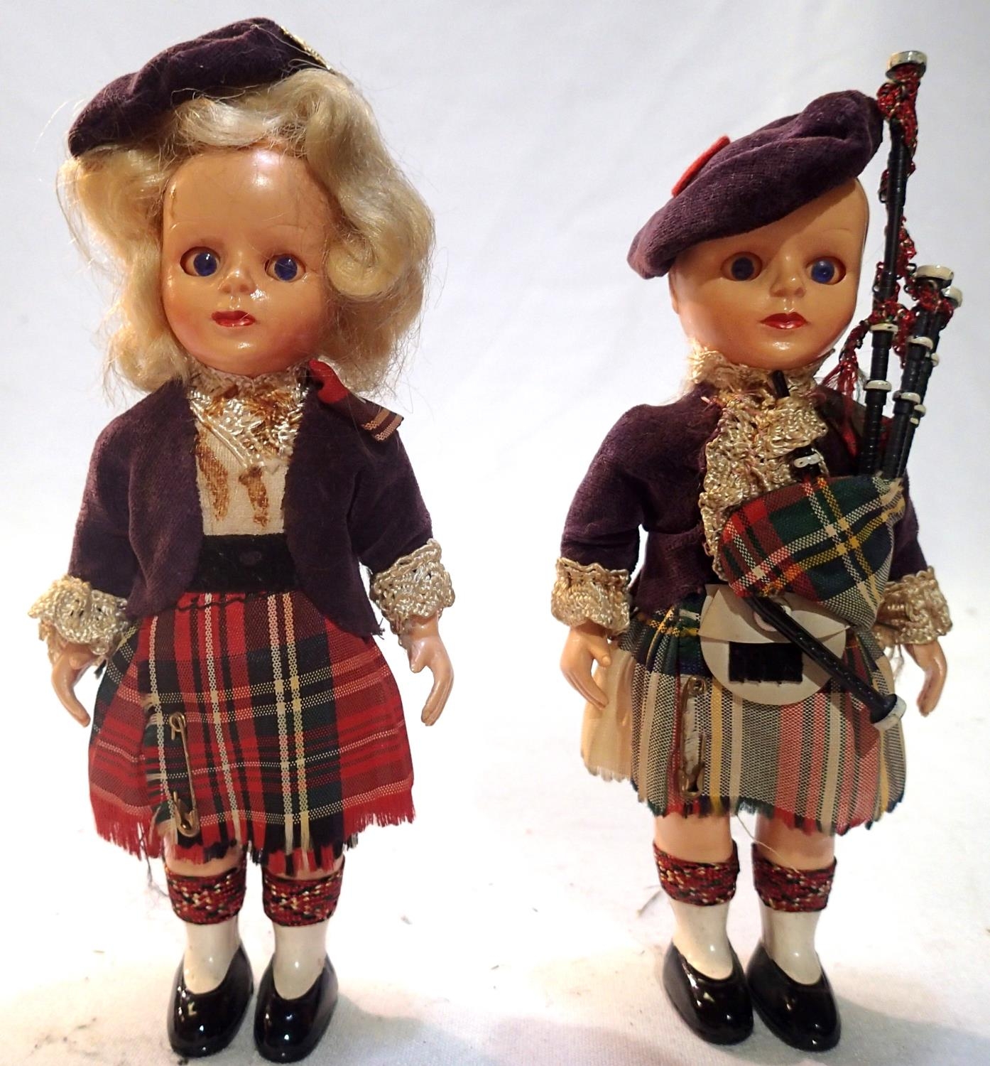 Two Rogark Scottish dolls, celluloid with sleep eyes, arm jointed arms, piper and dancer, in very good condition, H: 16 cm. P&P Group 1 (£14+VAT for the first lot and £1+VAT for subsequent lots)