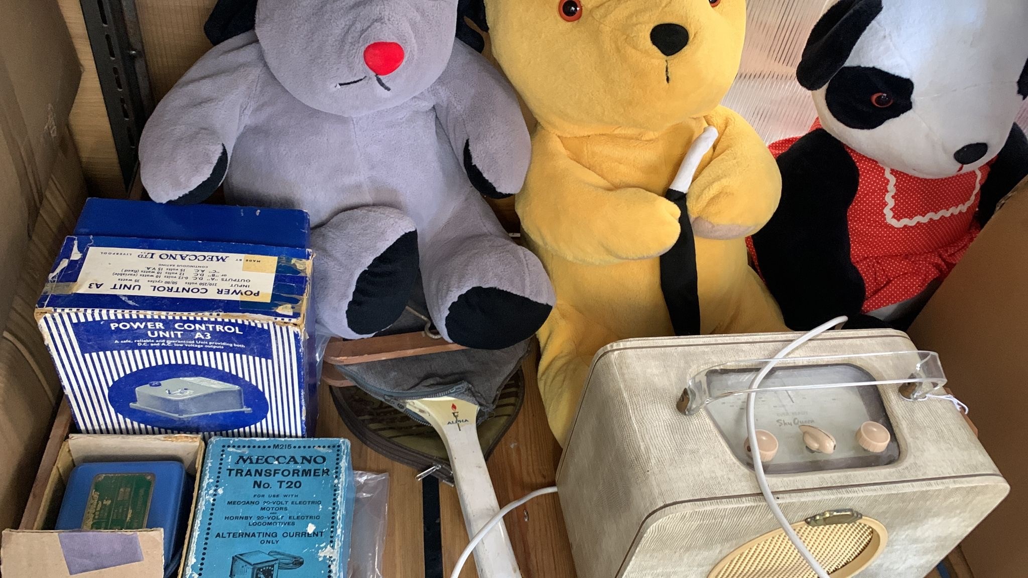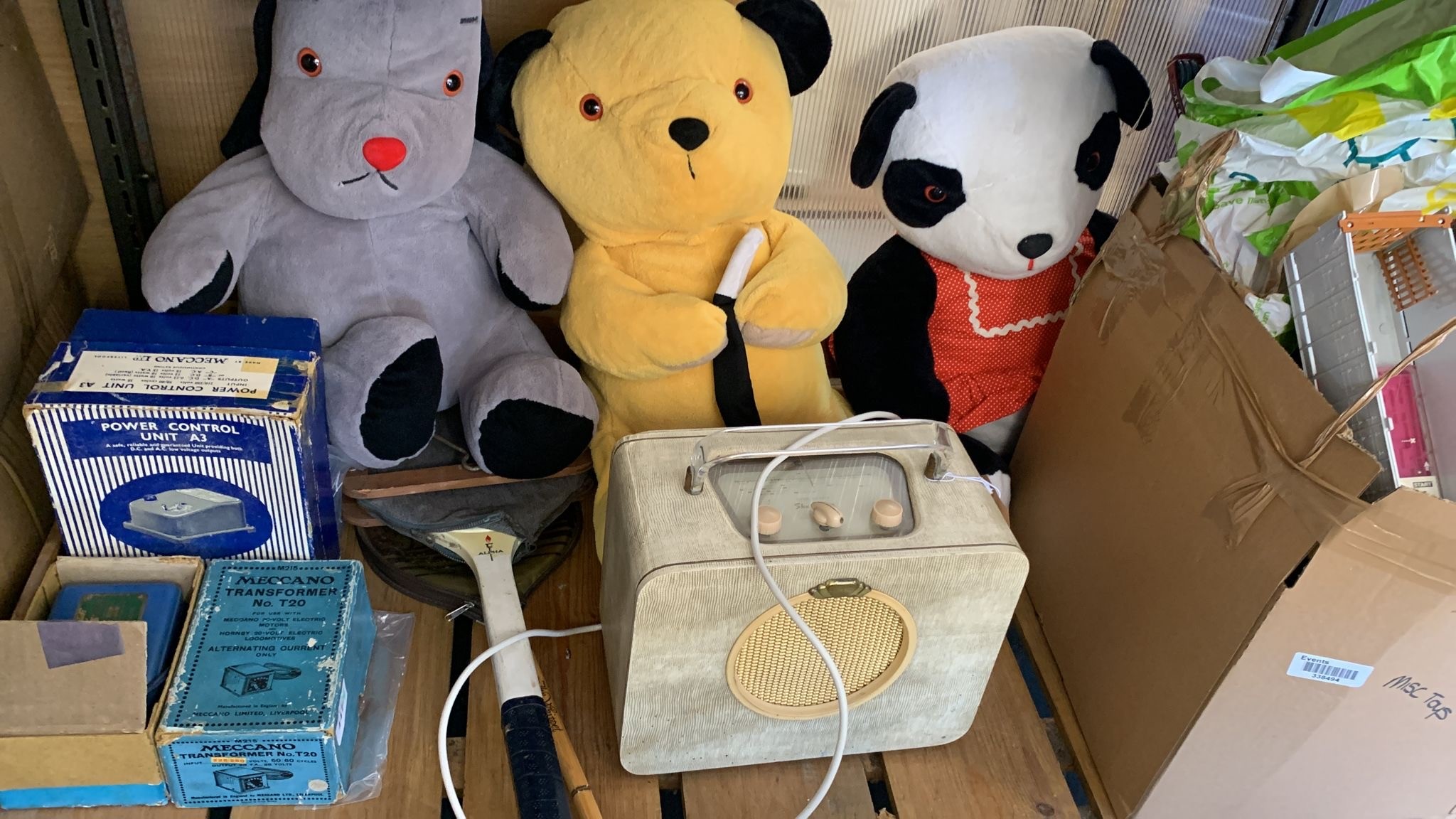 Shelf lot of miscellaneous to include toys, radio, meccano power unit etc