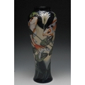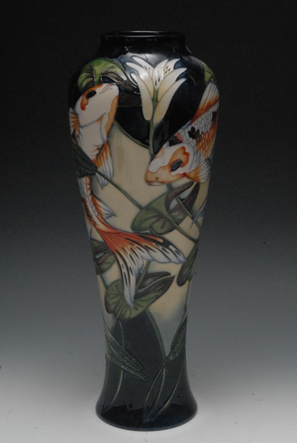 A contemporary Moorcroft Quiet Waters pattern slender ovoid vase, designed by Philip Gibson, tube lined with koi carp and fronds, in coloured, 37cm high, impressed mark, dated 2002