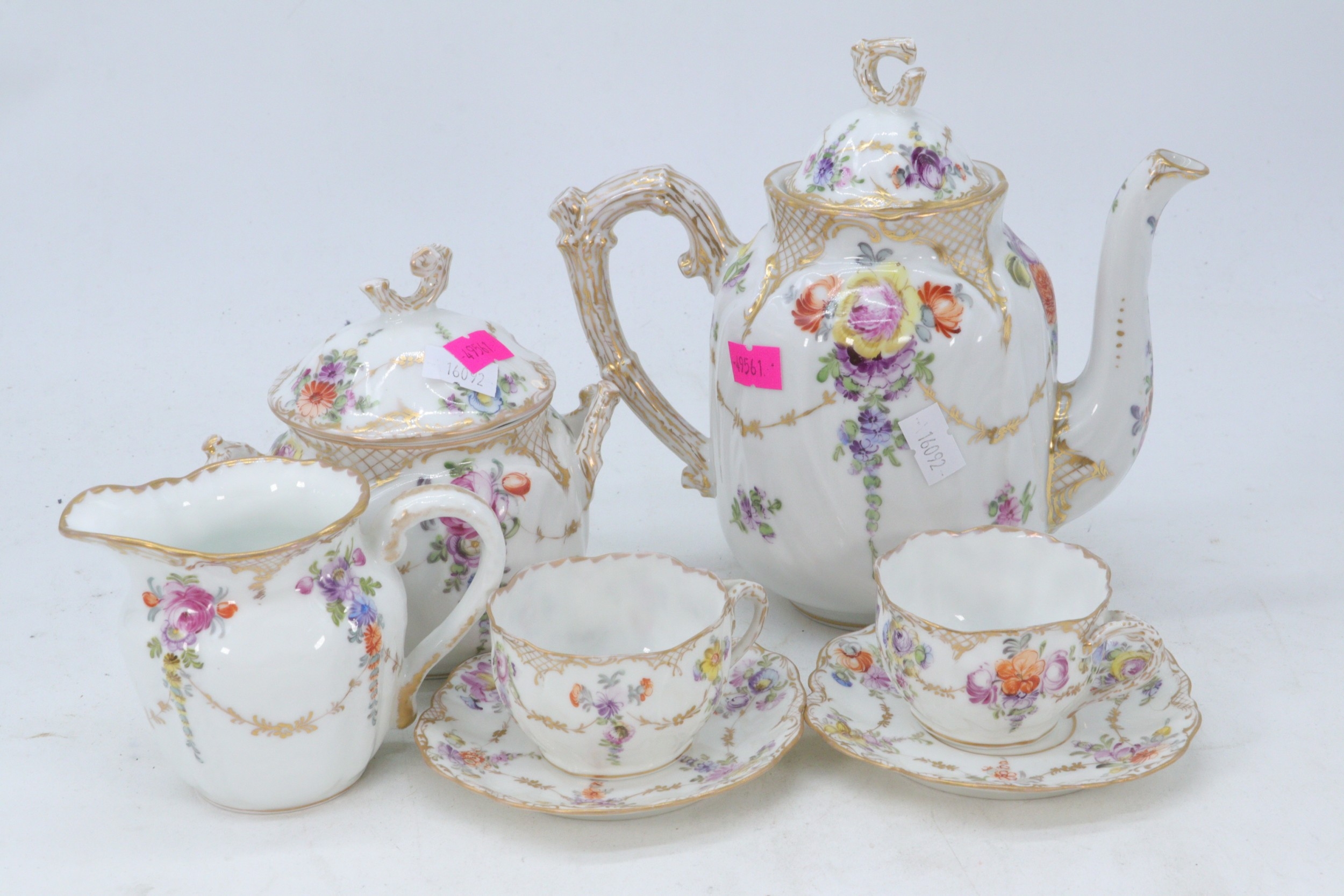 Dresden porcelain and floral decorated breakfast set with teapot, two cups and saucers, jug and lidded sugar bowl