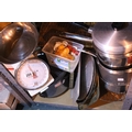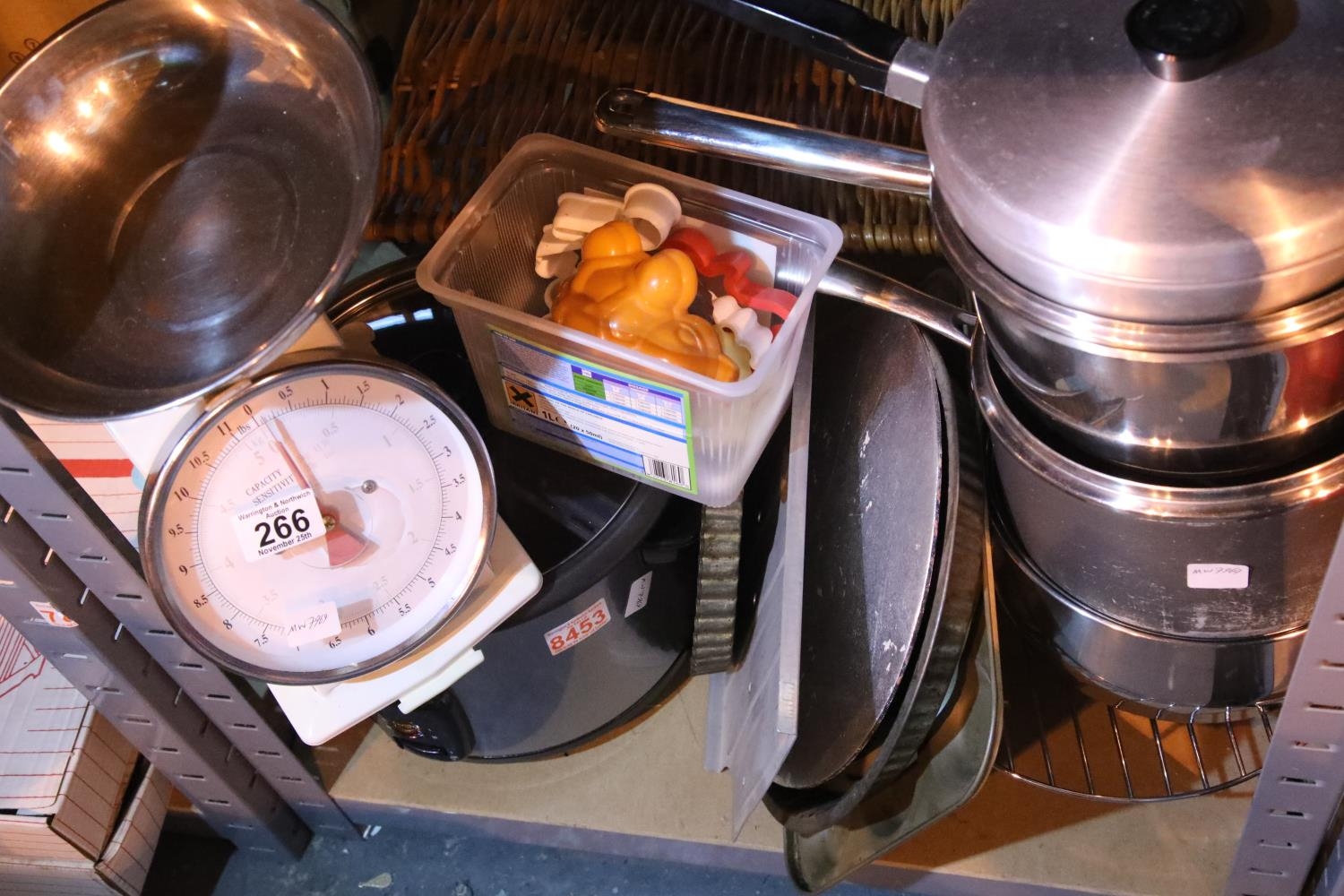 Mixed household items including egg coddler, slow cooker and sauce pans. Not available for in-house P&P