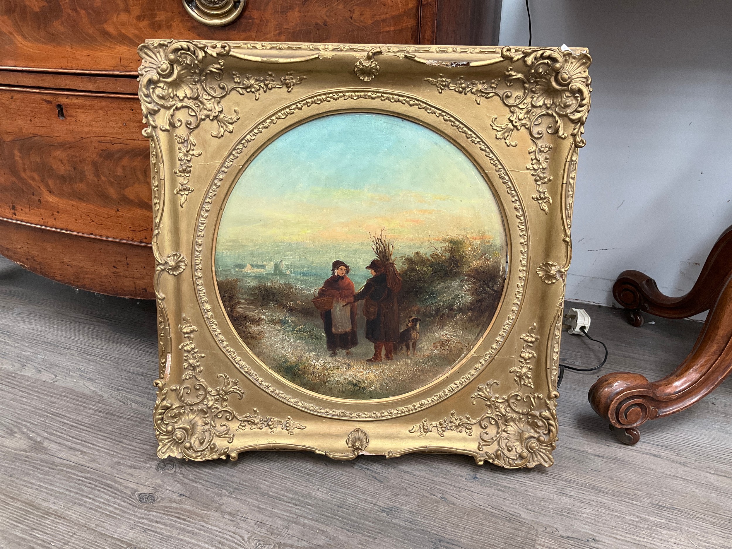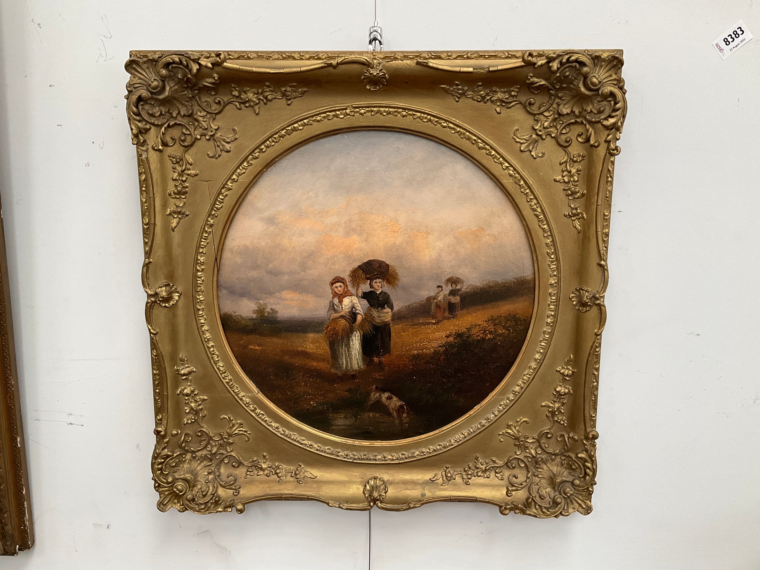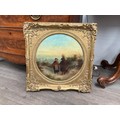 EDWARD ROBERT SMYTHE (1810-1899) A pair of ornate gilt framed oils on boards, 'Bringing in the Harvest' and 'Man carrying a faggot of sticks in winter', circular mounts. 35cm diameter