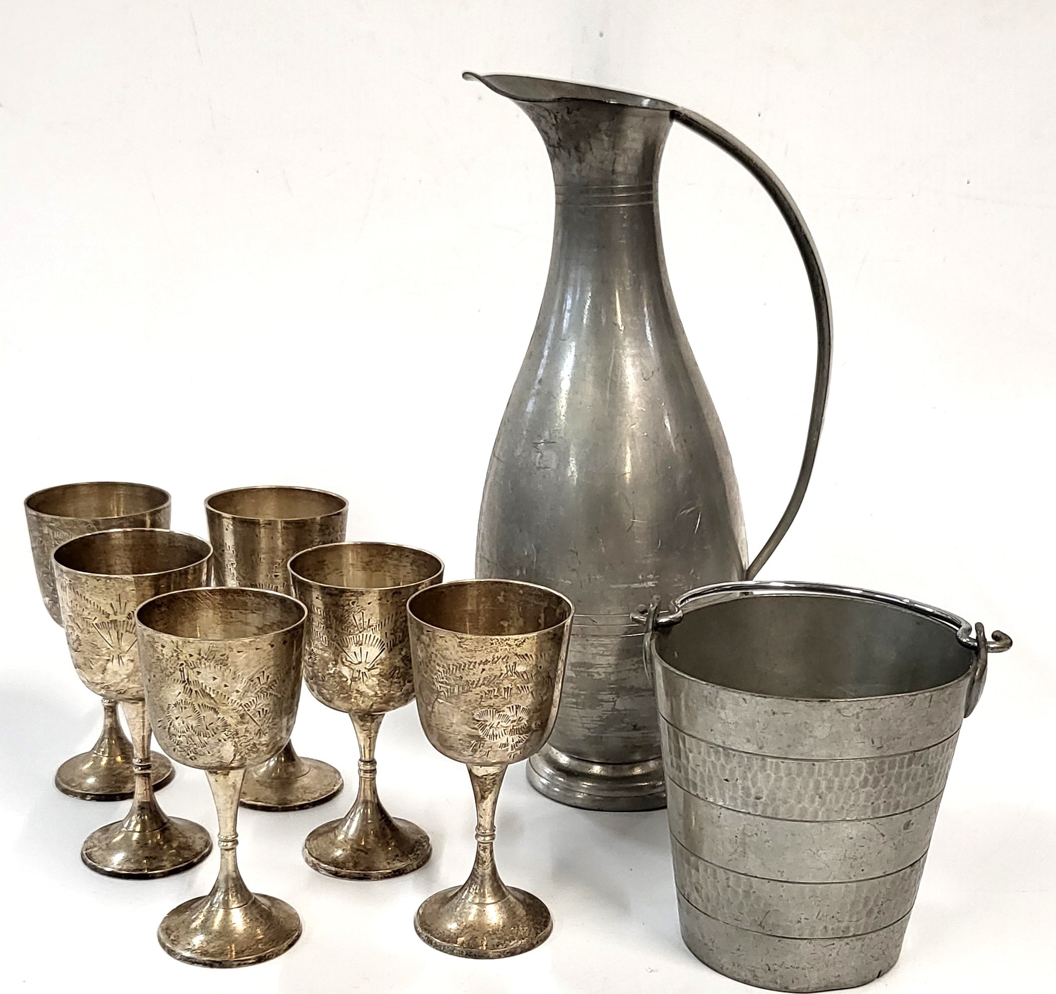 A collection of various metalware including an Indonesian pewter bucket and ewer and six silver plate goblets.
