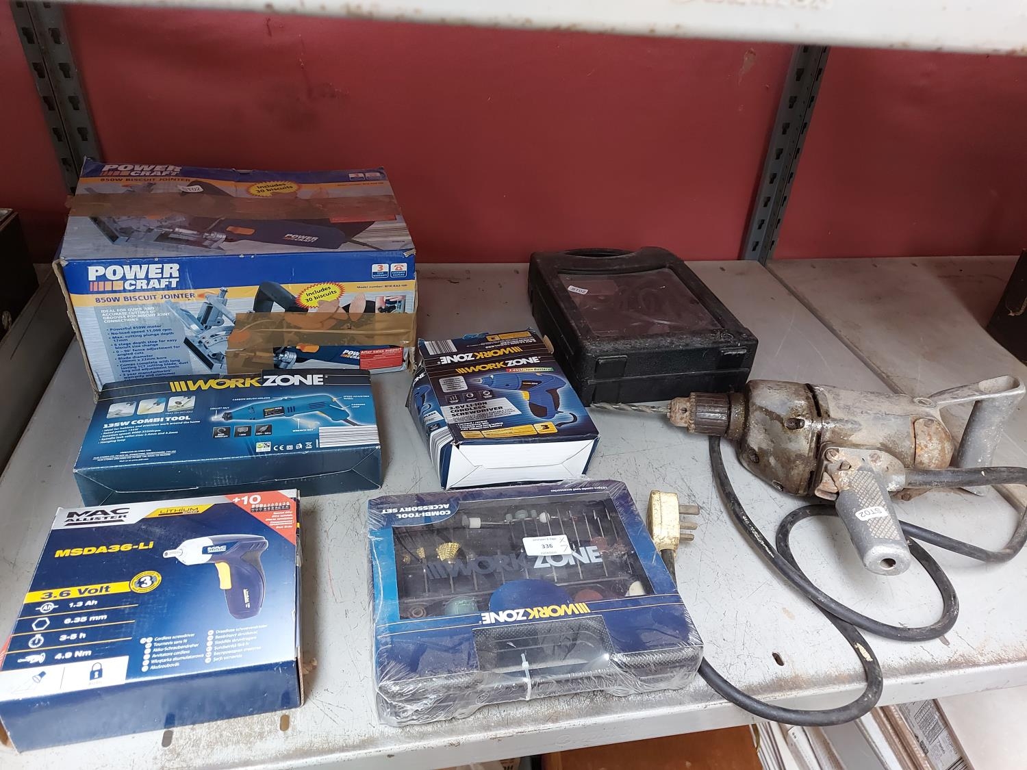 Seven items to include boxed Powercraft 850 watt biscuit jointer, vintage heavy duty Black and Decker drill, boxed Workzone combi tool etc.