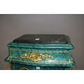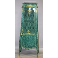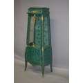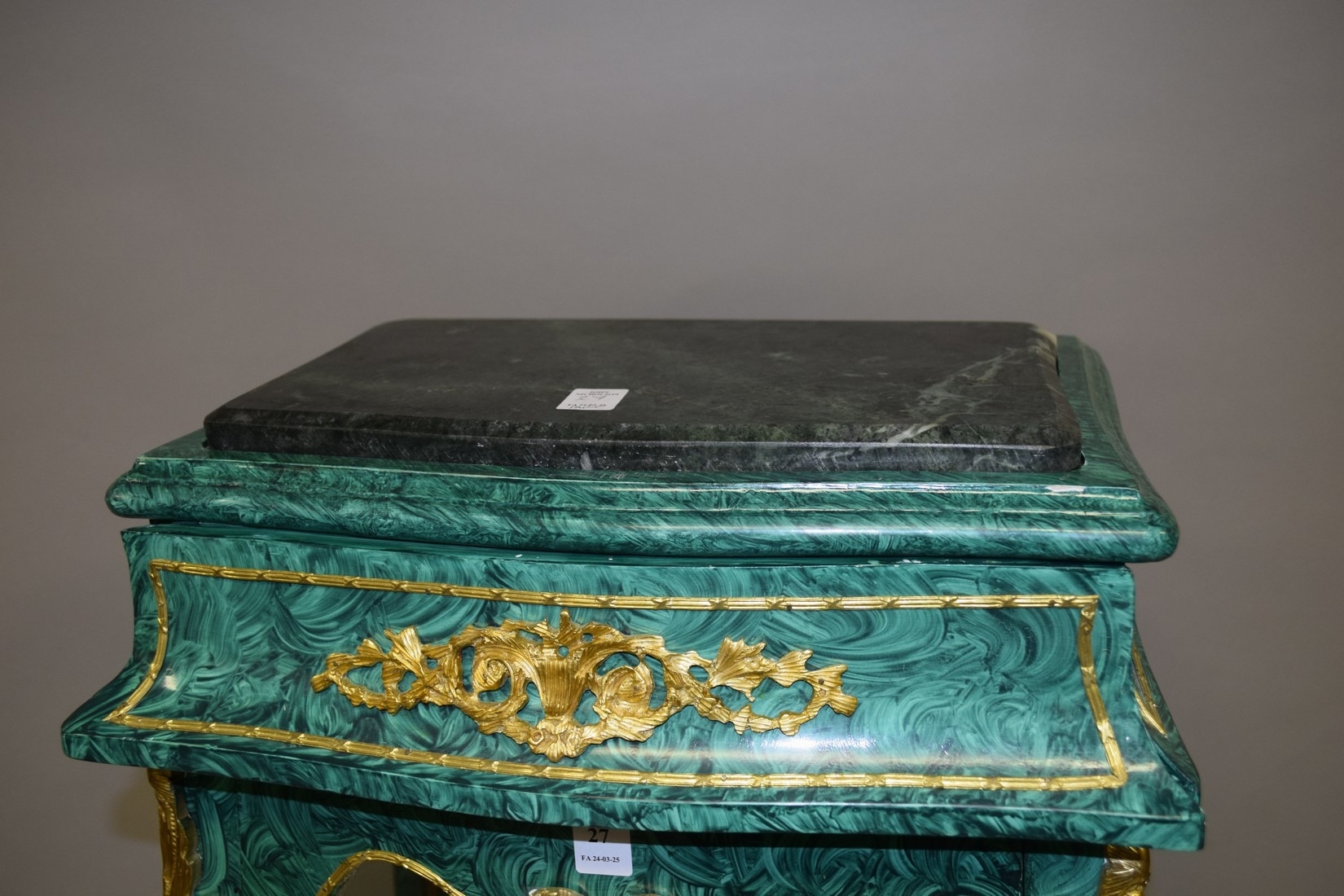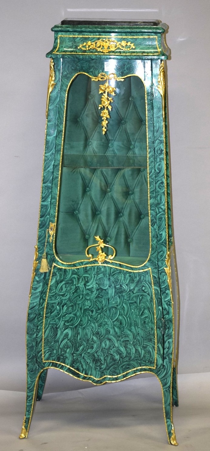 A GOOD MALACHITE PATTERN TAPERING VITRINE with ormolu mounts, three-quarter panel doors with velvet interior.