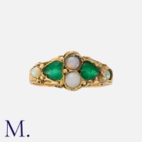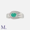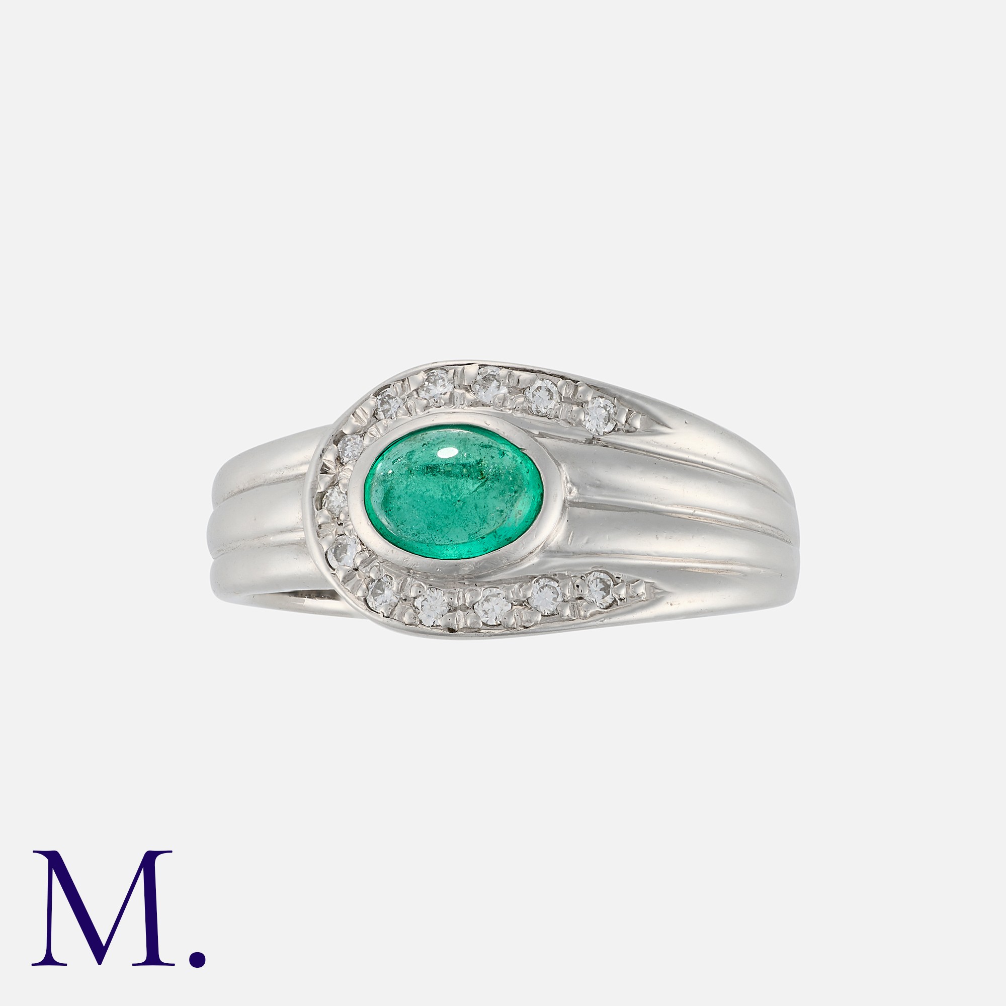 An Emerald and Diamond Ring in platinum, set with a cabochon emerald of approximately 0.56 carats, accented by round cut diamonds. Marked pt850, 056D009.