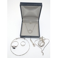 Collection of 925 stamped silver and white metal jewellery to include abstract pendant (W: 45mm H: 57mm), adjustable 925 stamped bracelet, 925 stamped unset ring (size: Q), signet ring stamped SIL (size: D/E), 925 stamped Mackintosh rose style pendant (H: 28mm) and a 925 stamped silver circular pendant on chain set with white stones all in a necklace box