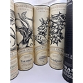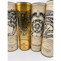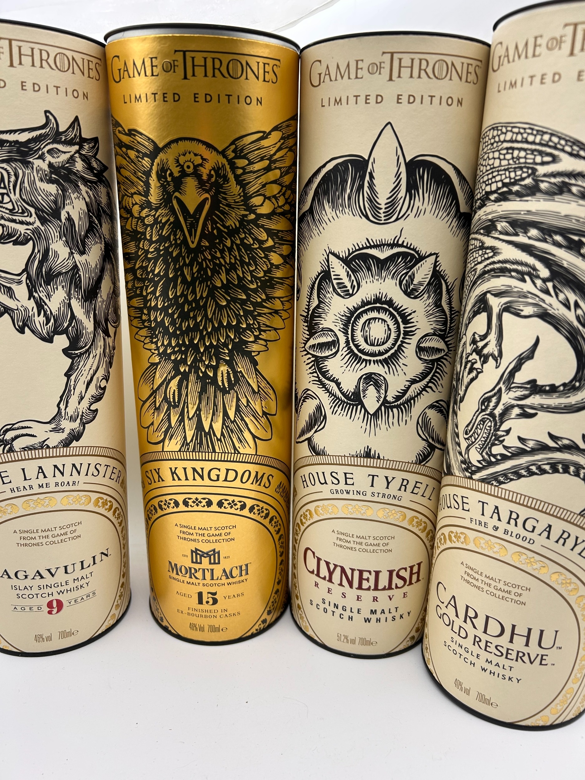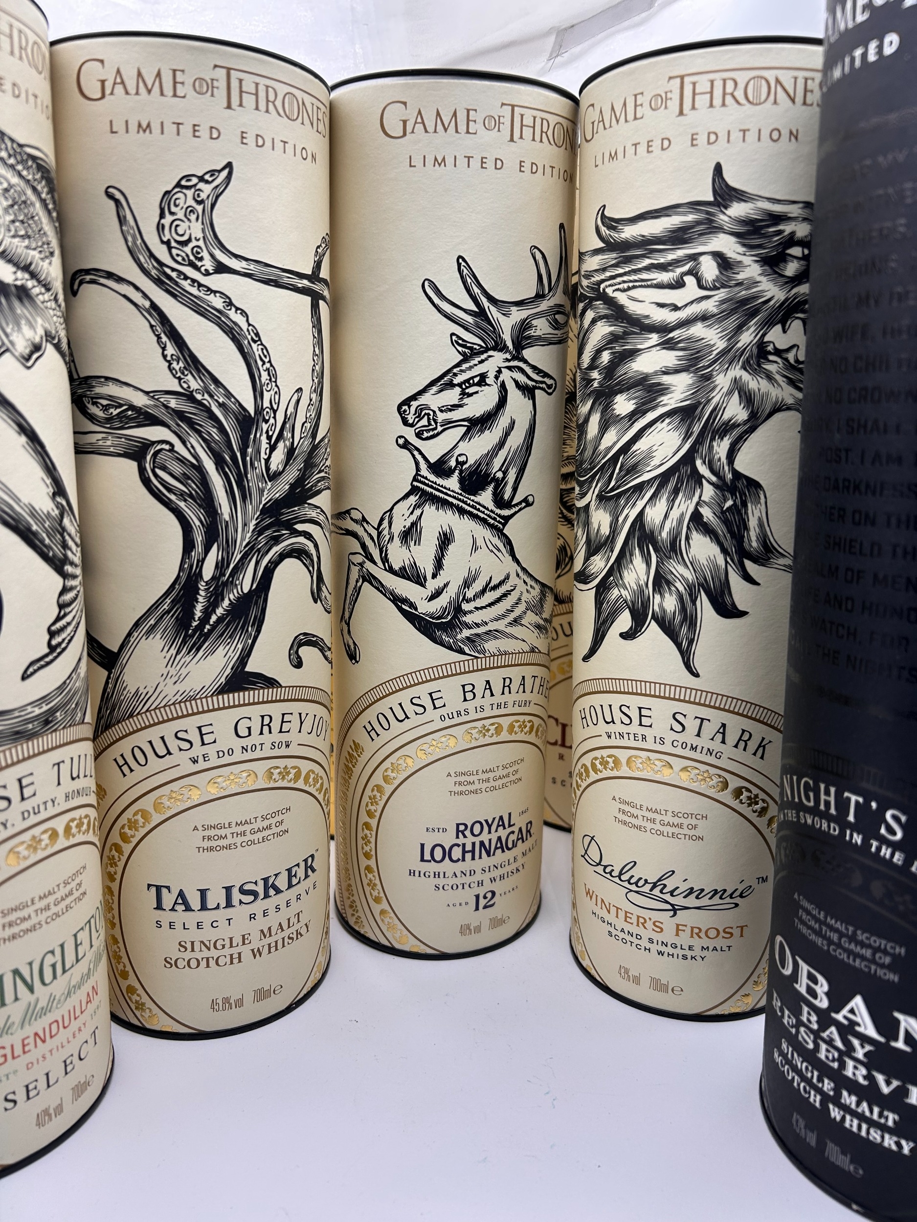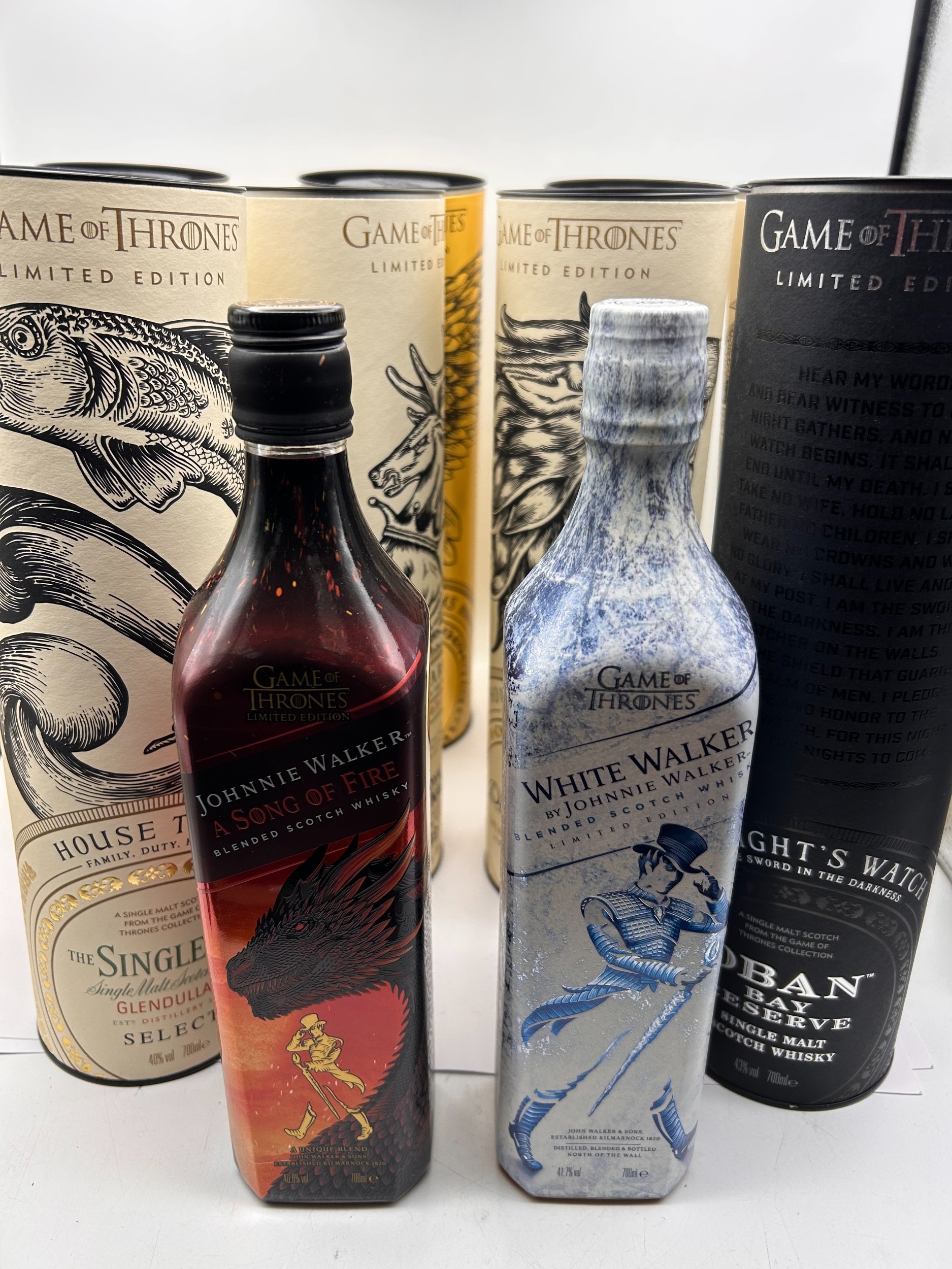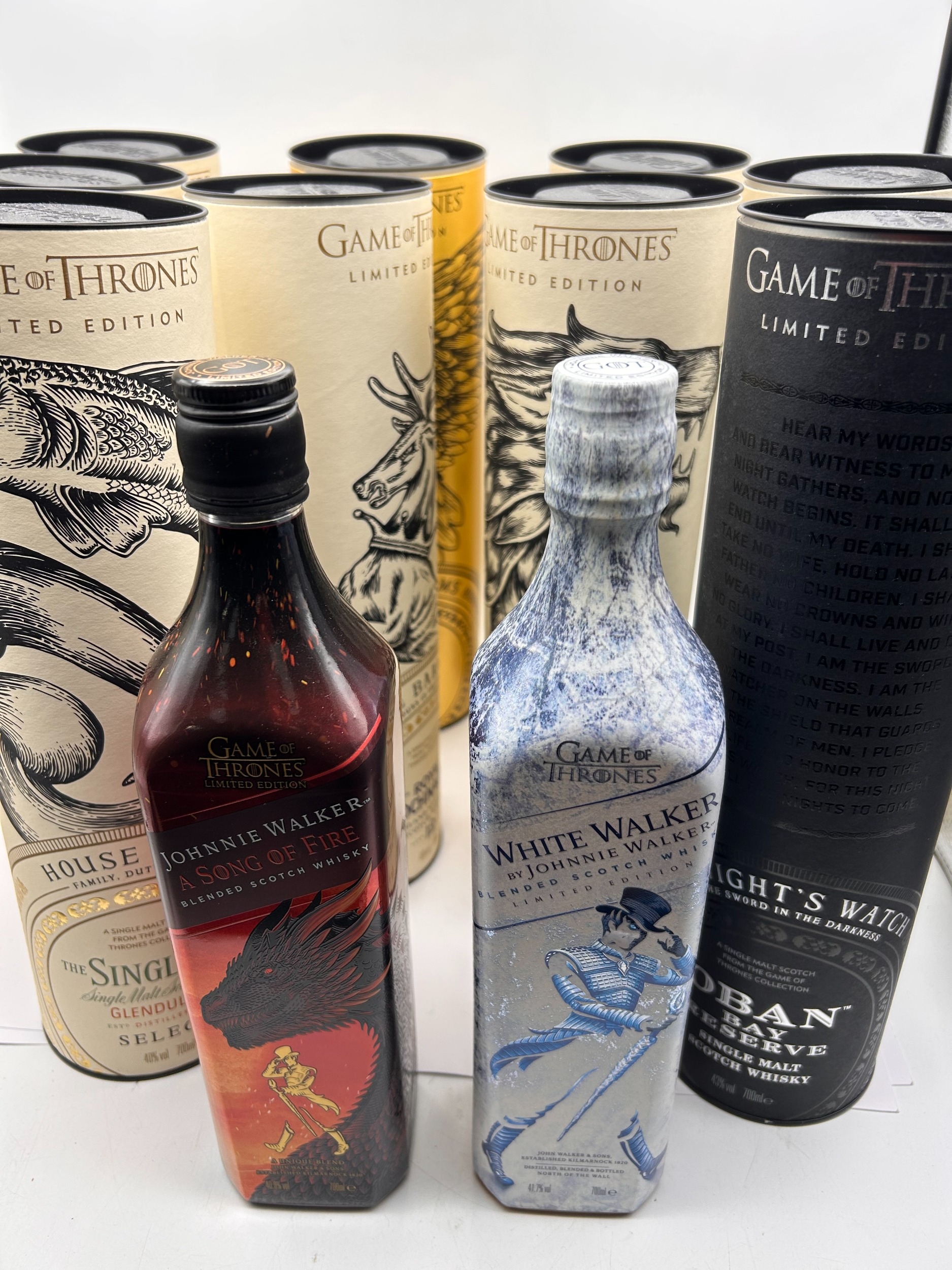 Collection of eleven items comprising the complete Johnnie Walker and Diageo Single Malt Scotch Whisky Game of Thrones Limited Edition series. The collection includes two sealed bottles of Johnnie Walker Blended Scotch Whisky: "White Walker" (featuring a blue and white cracked ice motif) and "A Song of Fire" (featuring a red and black dragon motif). Also included are nine distinct cylindrical cardboard presentation tubes, each containing a 700ml bottle of Single Malt Scotch Whisky representing the Houses of Westeros and other factions. The Single Malt expressions include: House Tully (The Singleton Glendullan Select), House Greyjoy (Talisker Select Reserve), House Baratheon (Royal Lochnagar 12 Year Old), House Stark (Dalwhinnie Winter's Frost), House Lannister (Lagavulin 9 Year Old), House Tyrell (Clynelish Reserve), House Targaryen (Cardhu Gold Reserve), Oban Night's Watch, and Mortlach 'Six Kingdoms'. All bottles are sealed and marked 700ml volume.