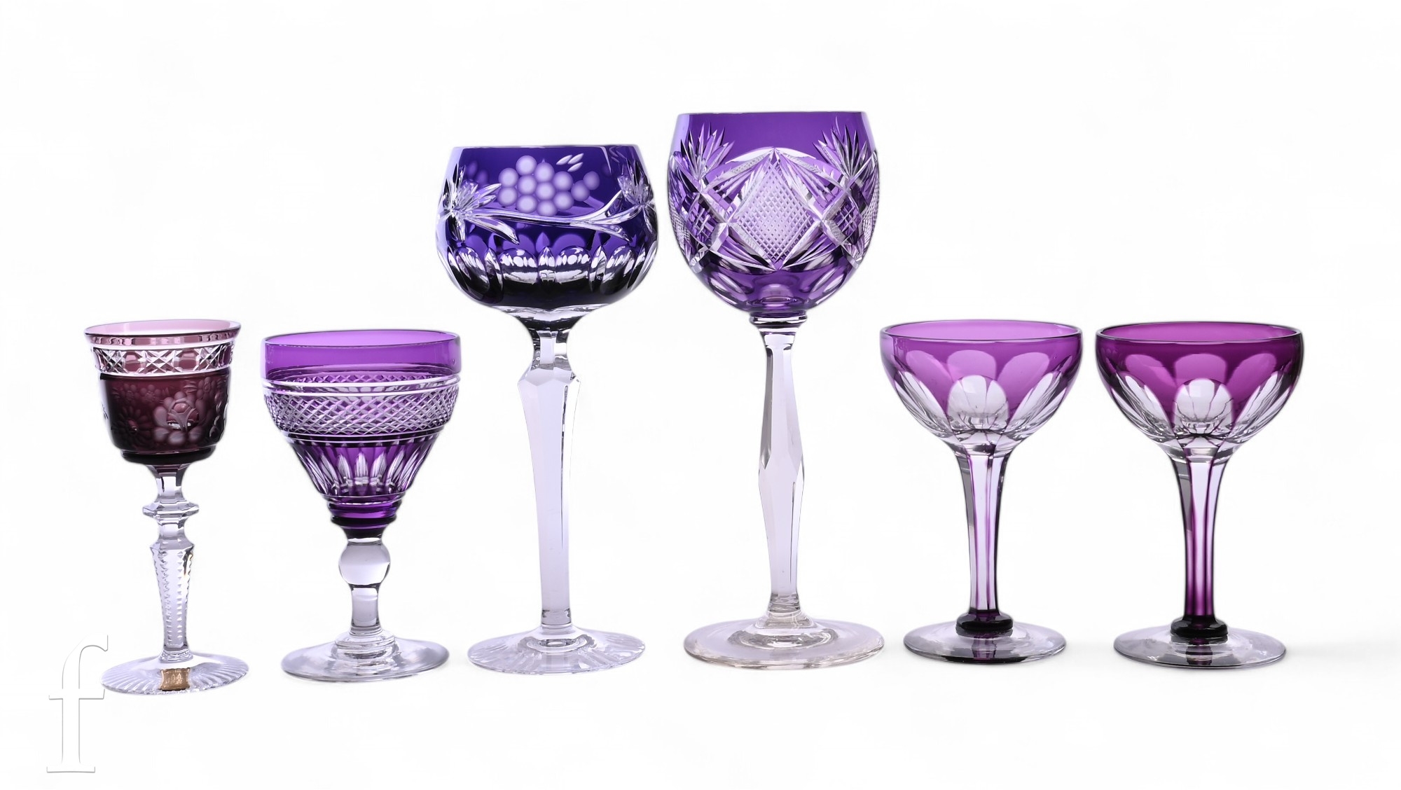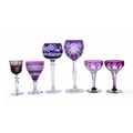 A collection of amethyst glass stem ware, to include a Meissner amethyst glass liqueur glass, intaglio cut with flowers and leaves, on knopped facet cut stem and circular foot, height 13cm, a pair of amethyst over clear glass wine glasses, in the manner of Moser 'Lady Hamilton', slice cut on slender facet stem and circular foot, height 12cm, two amethyst over clear flash cut hock glasses and a single amethyst over clear with diamond and mitre cut band on clear glass baluster stem and circular foot. (6)
