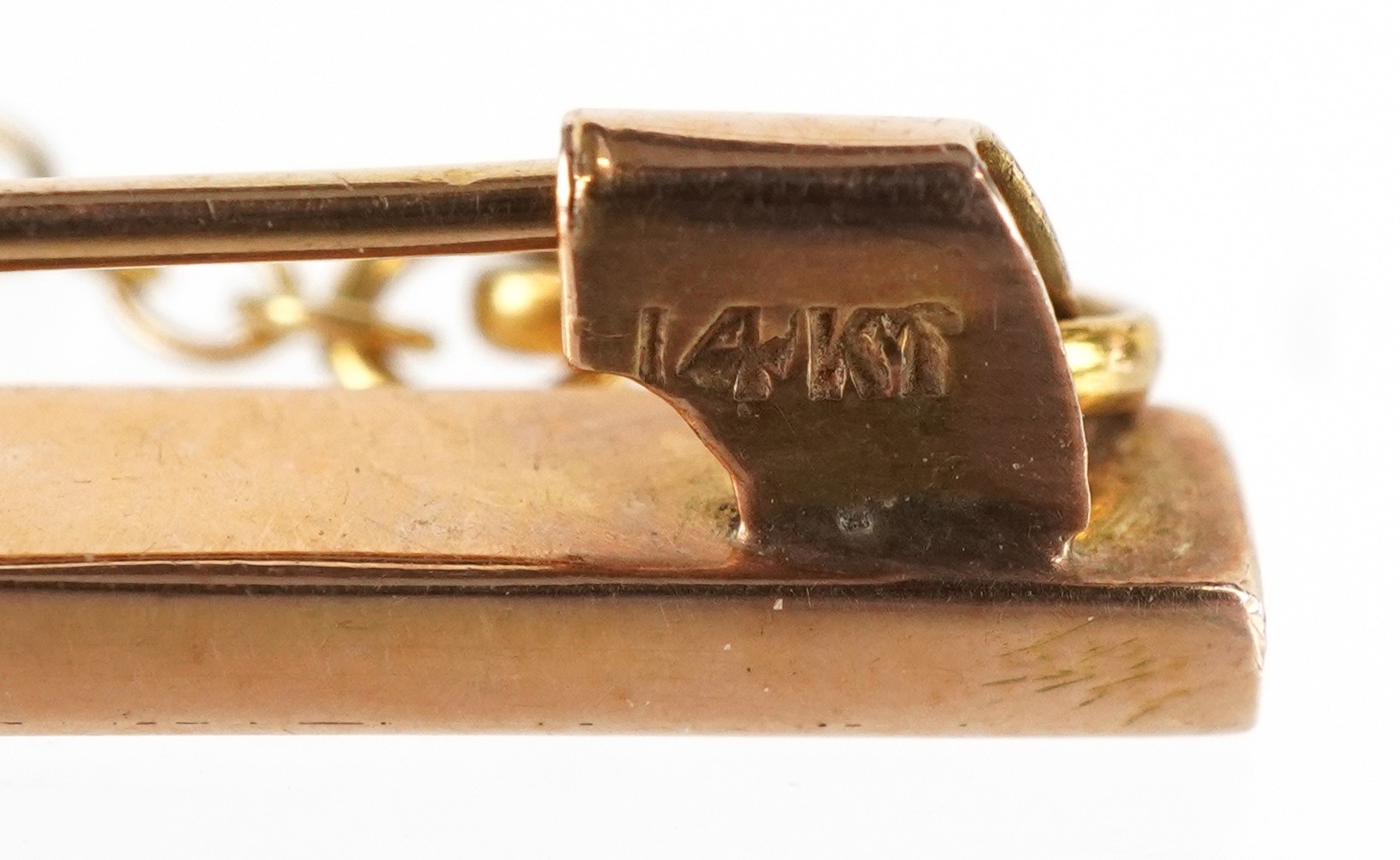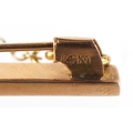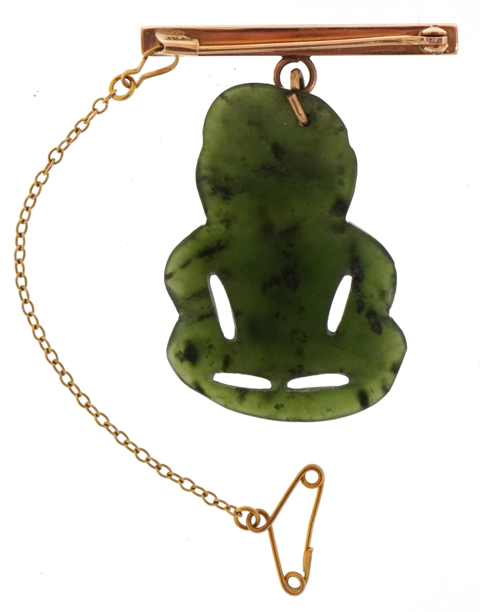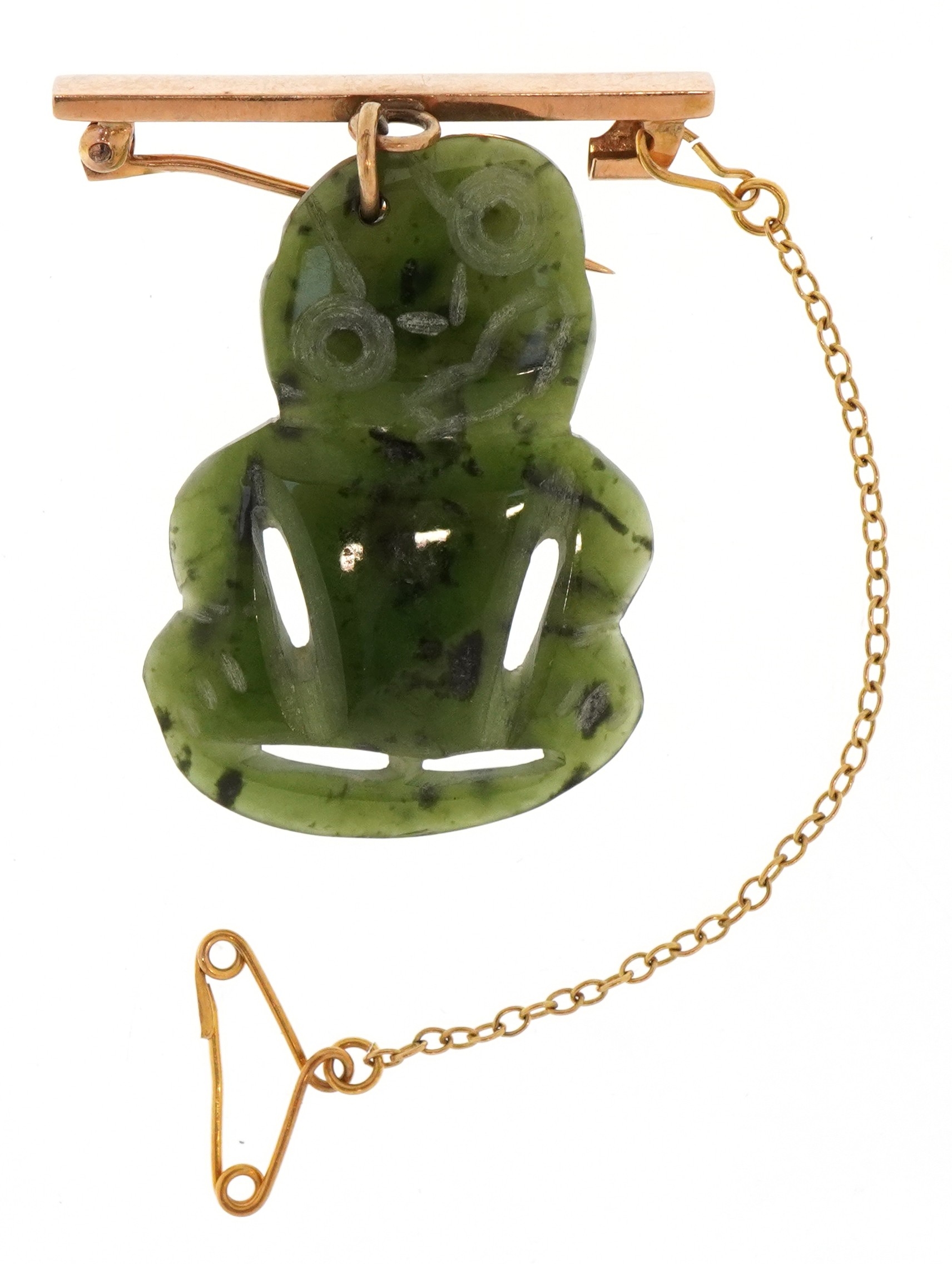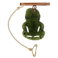 A 14KT gold and carved green stone Tiki brooch, possibly Maori, 4cm high, 5.7g.