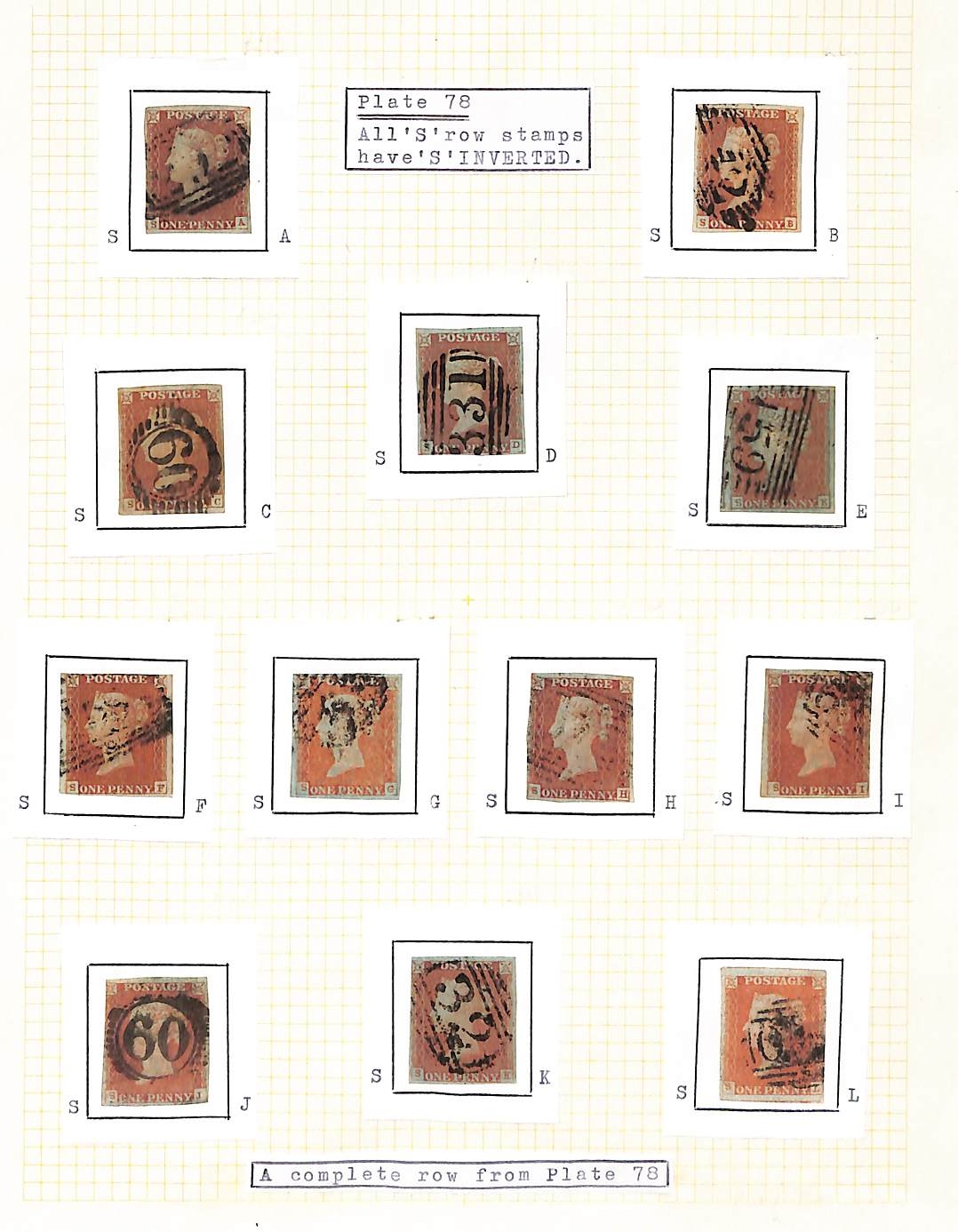 1848 1d Red-brown, plate 78, SA-SL singles with the inverted "S" variety, SJ with three margins, SF and SK touched or very close on one side, others with four margins, all used, an uncommon complete set of all twelve stamps from the S row. S.G. £2,100. (12).