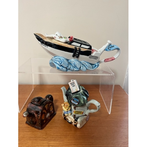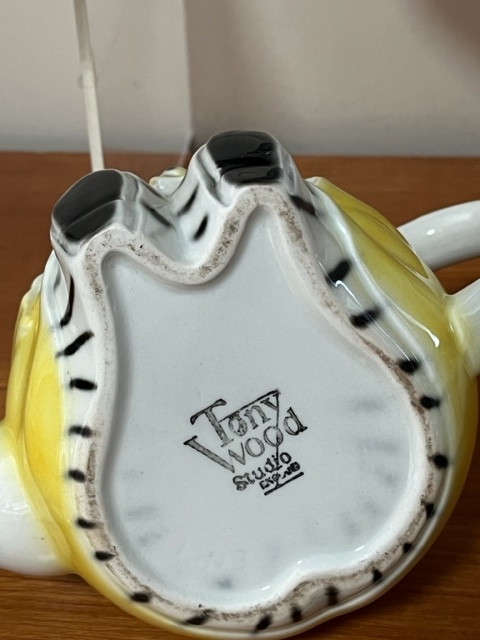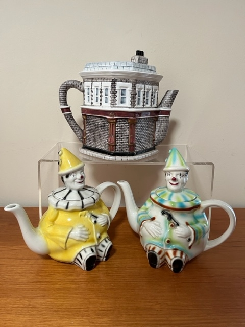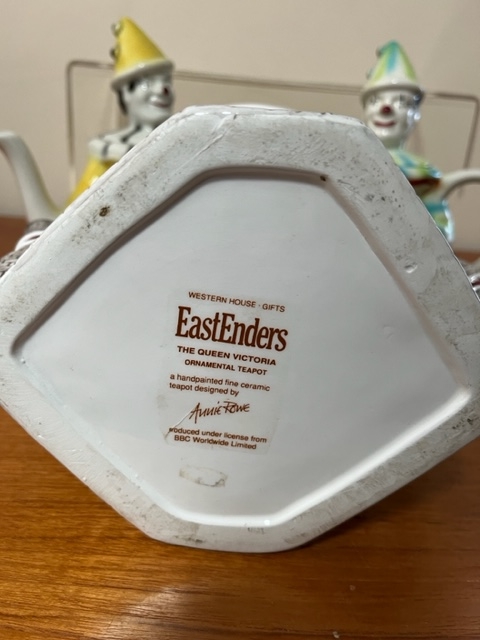 x3 Novelty Teapots. Two Tony Wood Studio Clowns, one Annie Rowe 'Eastenders'. Only damage seems to be a small nick to the inside rim of one of the Clowns. See photos